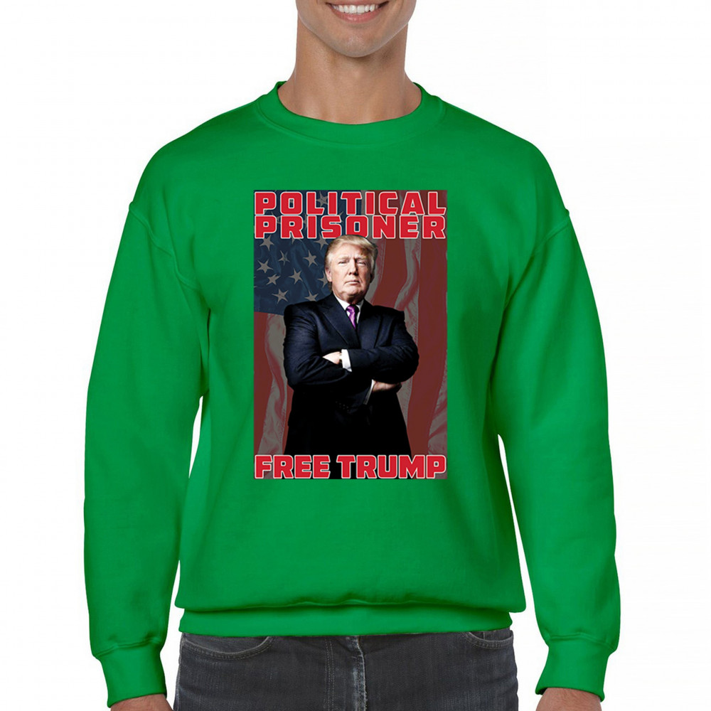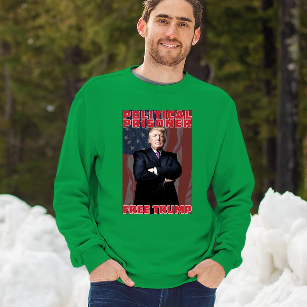 Show your support with the "Political Prisoner Free Trump" design, featuring Trump against an American flag. Perfect for conservative patriots and Trump supporters.