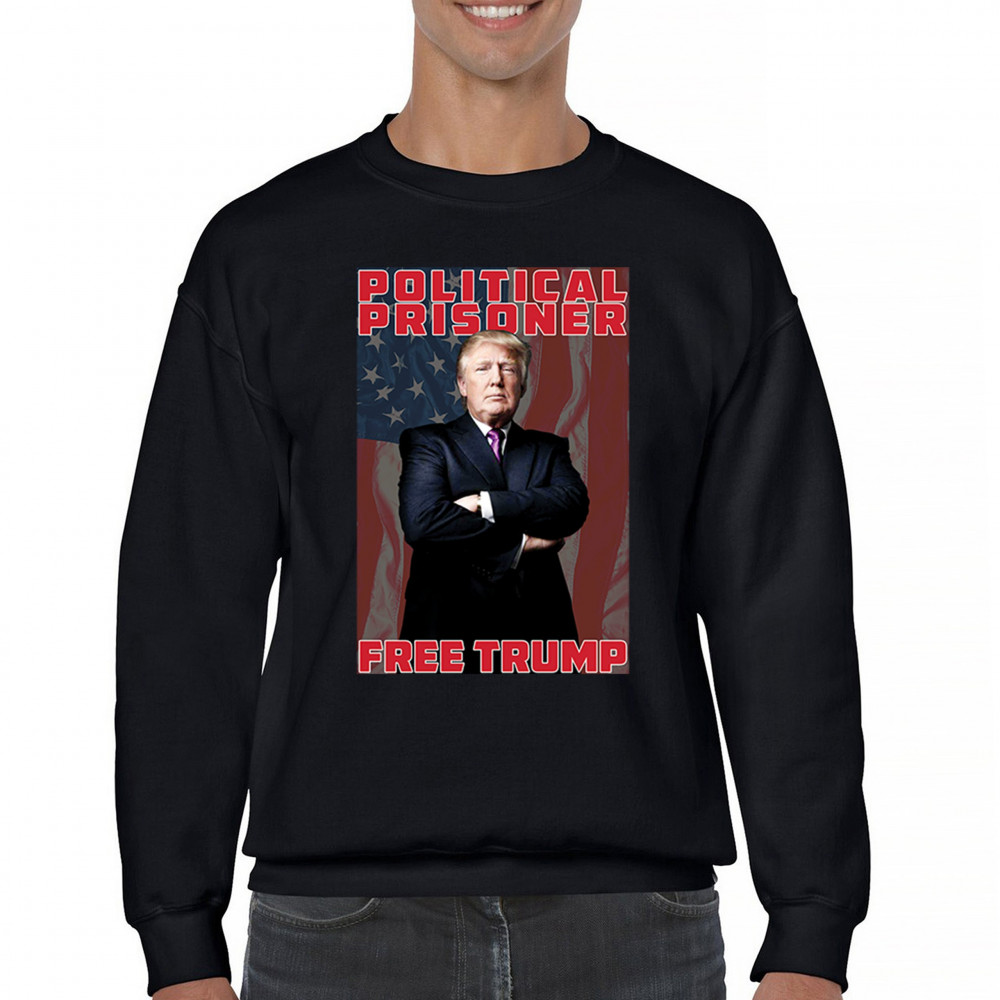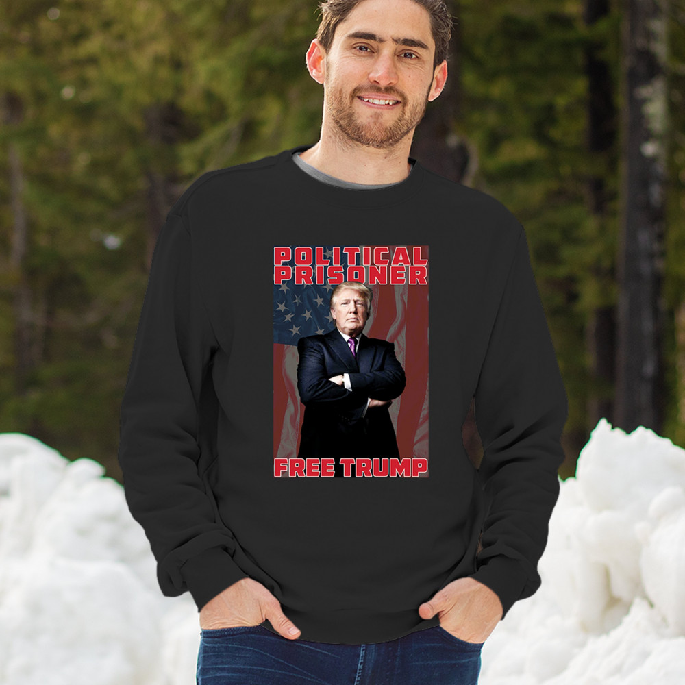 Show your support with the "Political Prisoner Free Trump" design, featuring Trump against an American flag. Perfect for conservative patriots and Trump supporters.