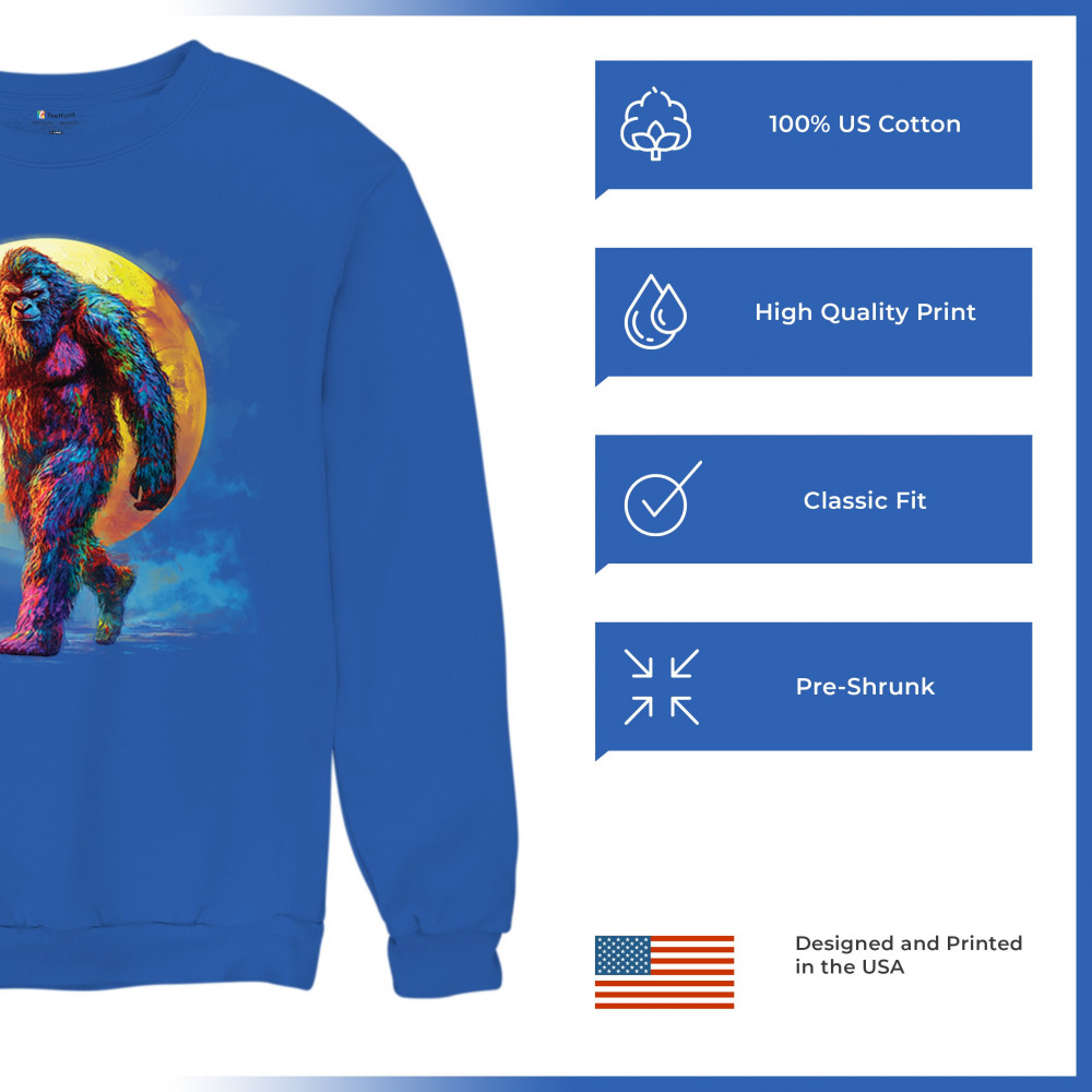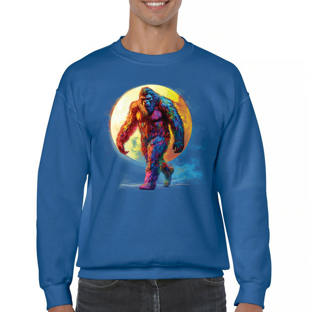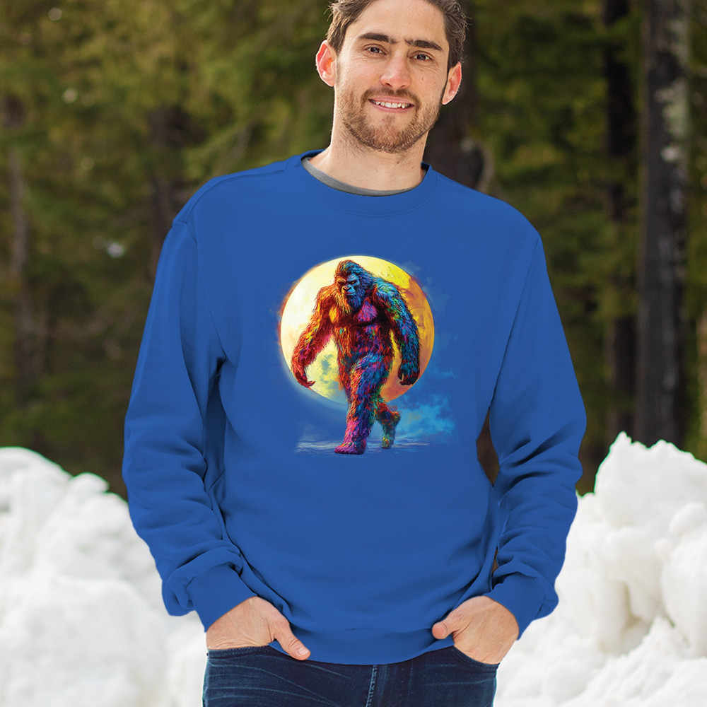 Rainbow Bigfoot under full moon design for cryptid lovers, festival goers, and psychedelic art fans. Bold, surreal, and eye-catching.