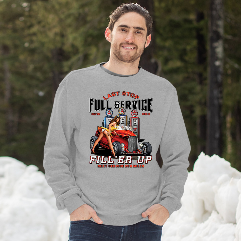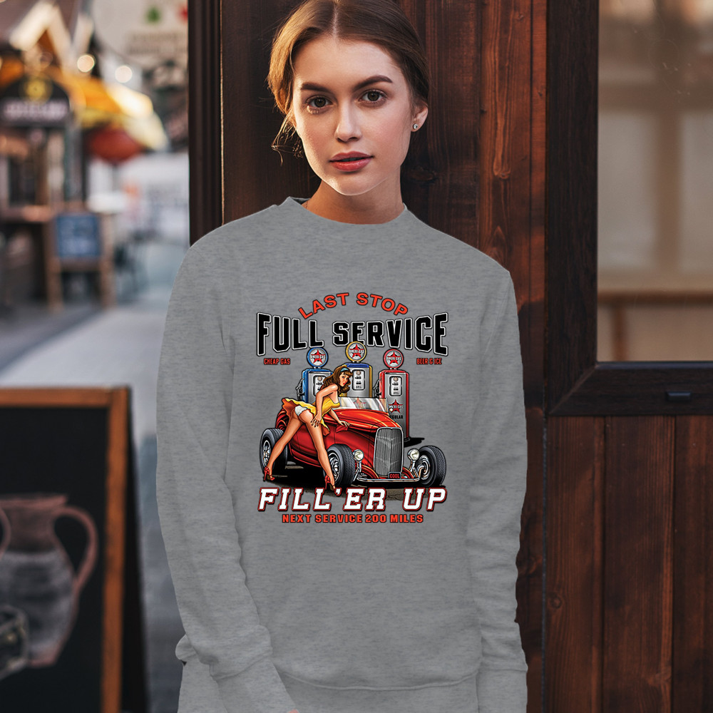A print featuring a hot pin-up girl leaning on a convertible coupe hot rod with a registration plate saying "cool". In the background there are several gas stations. The print says: "Last Stop, Full Service, Cheap Gas, Beer & Ice, Fill 'Er Up, Next Servic