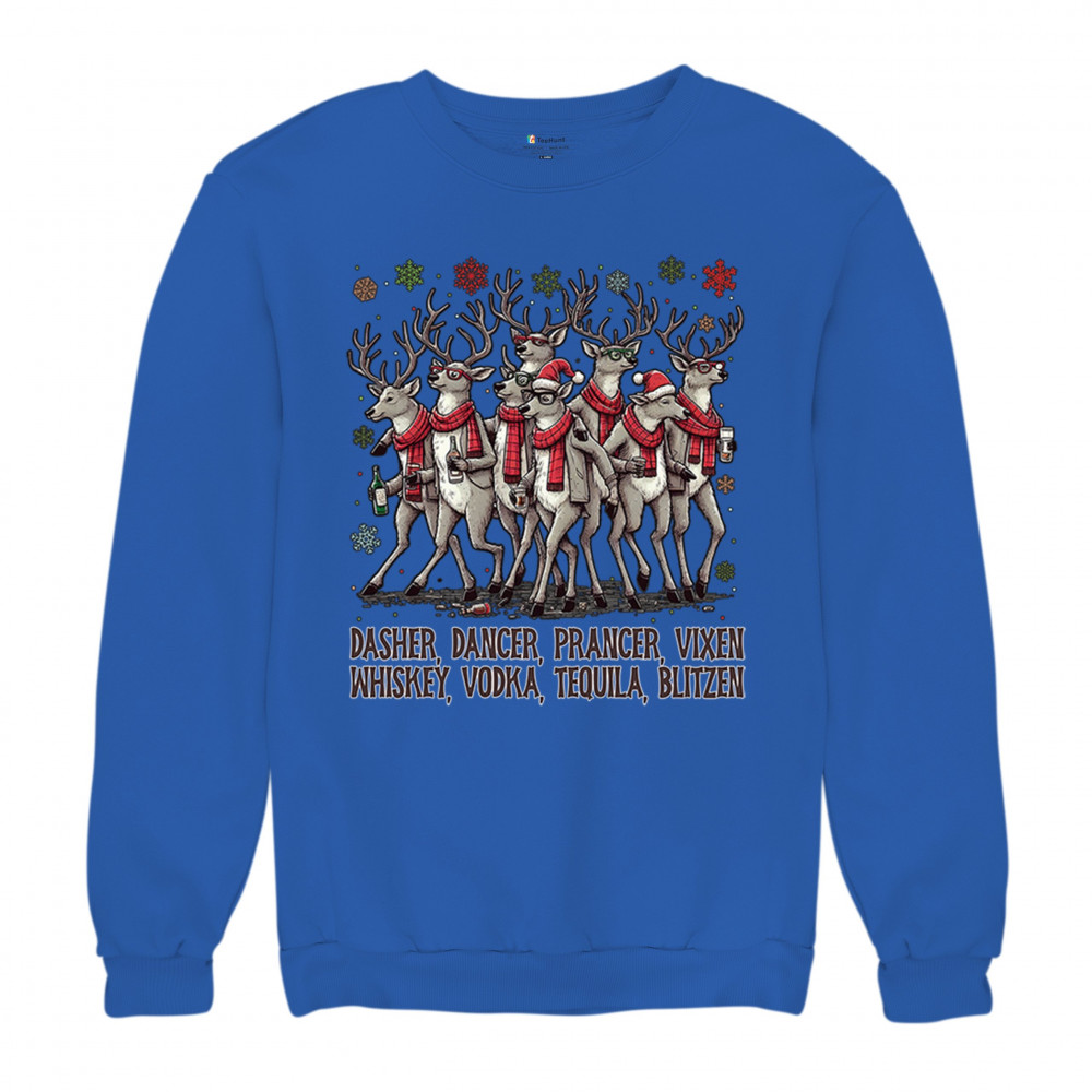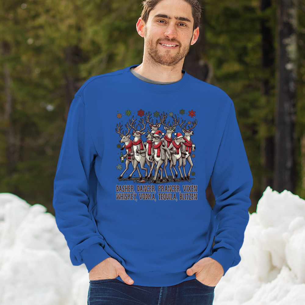 This funny holiday design features a squad of drinking reindeer carrying bottles and dressed in scarves for the ultimate Christmas party vibe. Great for bar crawls, office parties, winter gatherings, adult holiday events, white elephant exchanges, festive nights out, and anyone who loves spirited Christmas humor with a cheeky personality.