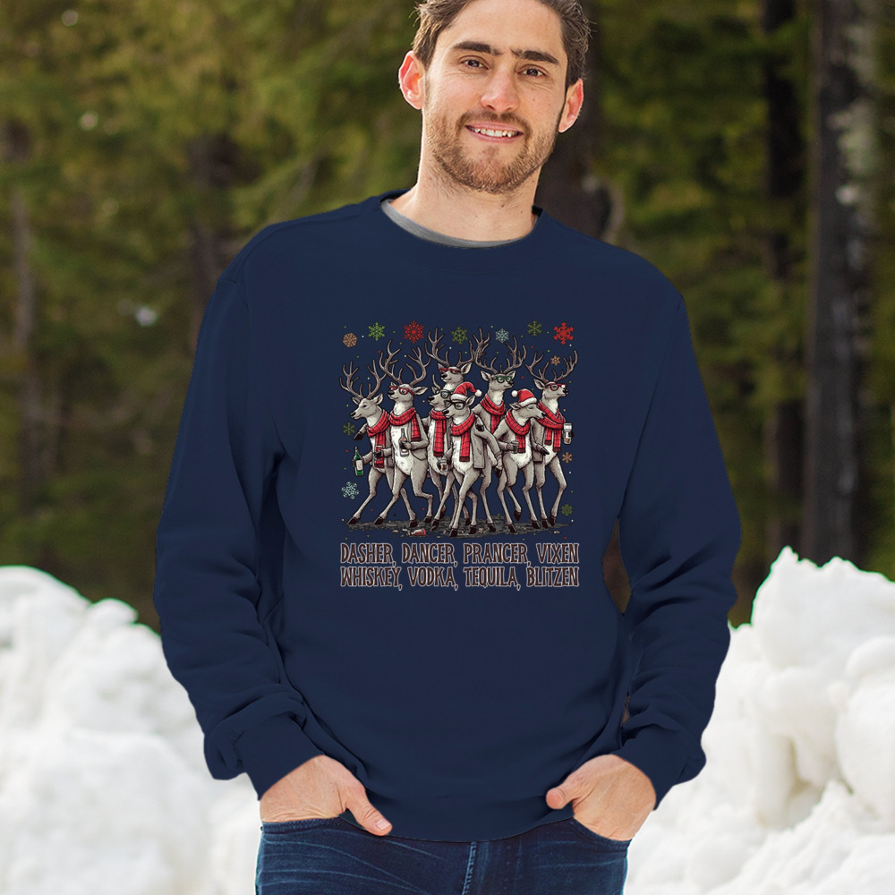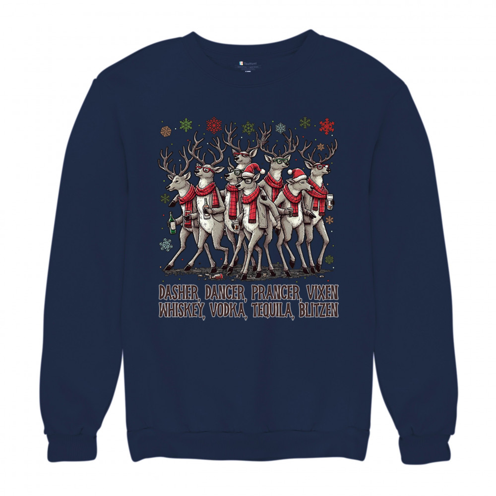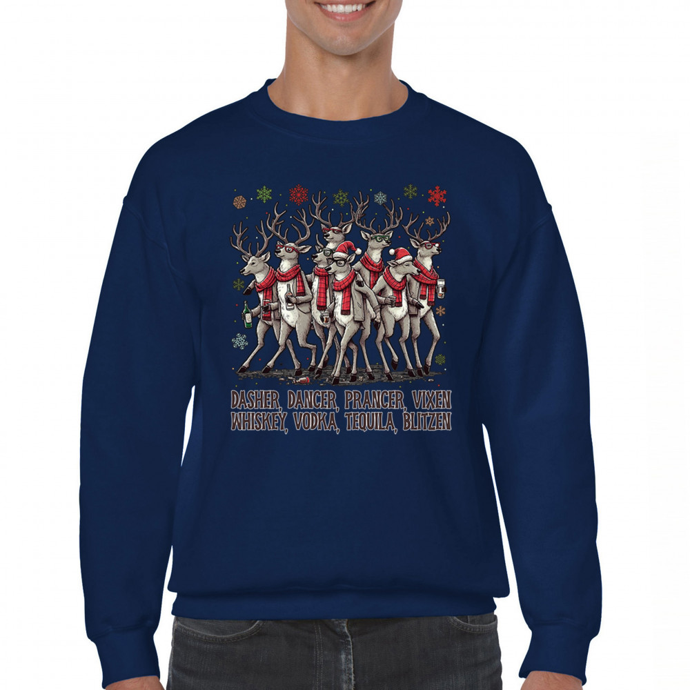 This funny holiday design features a squad of drinking reindeer carrying bottles and dressed in scarves for the ultimate Christmas party vibe. Great for bar crawls, office parties, winter gatherings, adult holiday events, white elephant exchanges, festive nights out, and anyone who loves spirited Christmas humor with a cheeky personality.