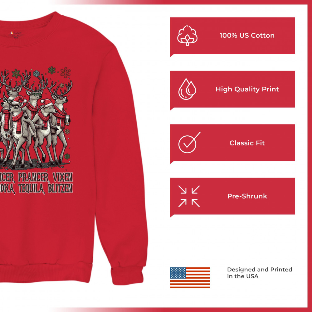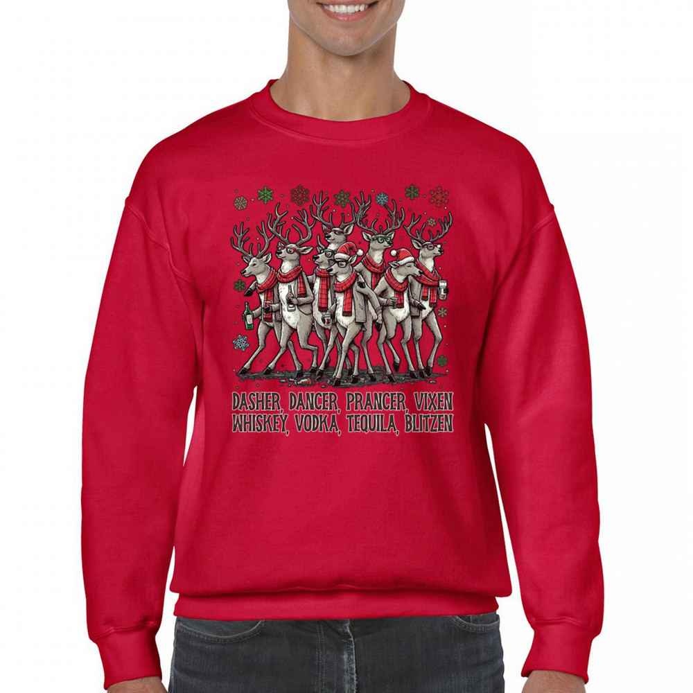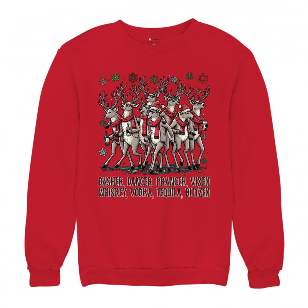 This funny holiday design features a squad of drinking reindeer carrying bottles and dressed in scarves for the ultimate Christmas party vibe. Great for bar crawls, office parties, winter gatherings, adult holiday events, white elephant exchanges, festive nights out, and anyone who loves spirited Christmas humor with a cheeky personality.