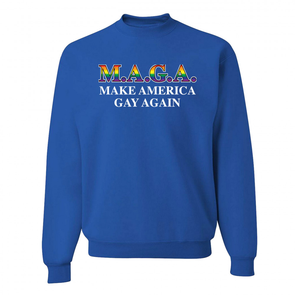 A funny print saying "M.A.G.A. Make America Gay Again". The acronym "M.A.G.A." is painted in the colors of lgbt rainbow. Wear it to show your support for the LGBTQ community.