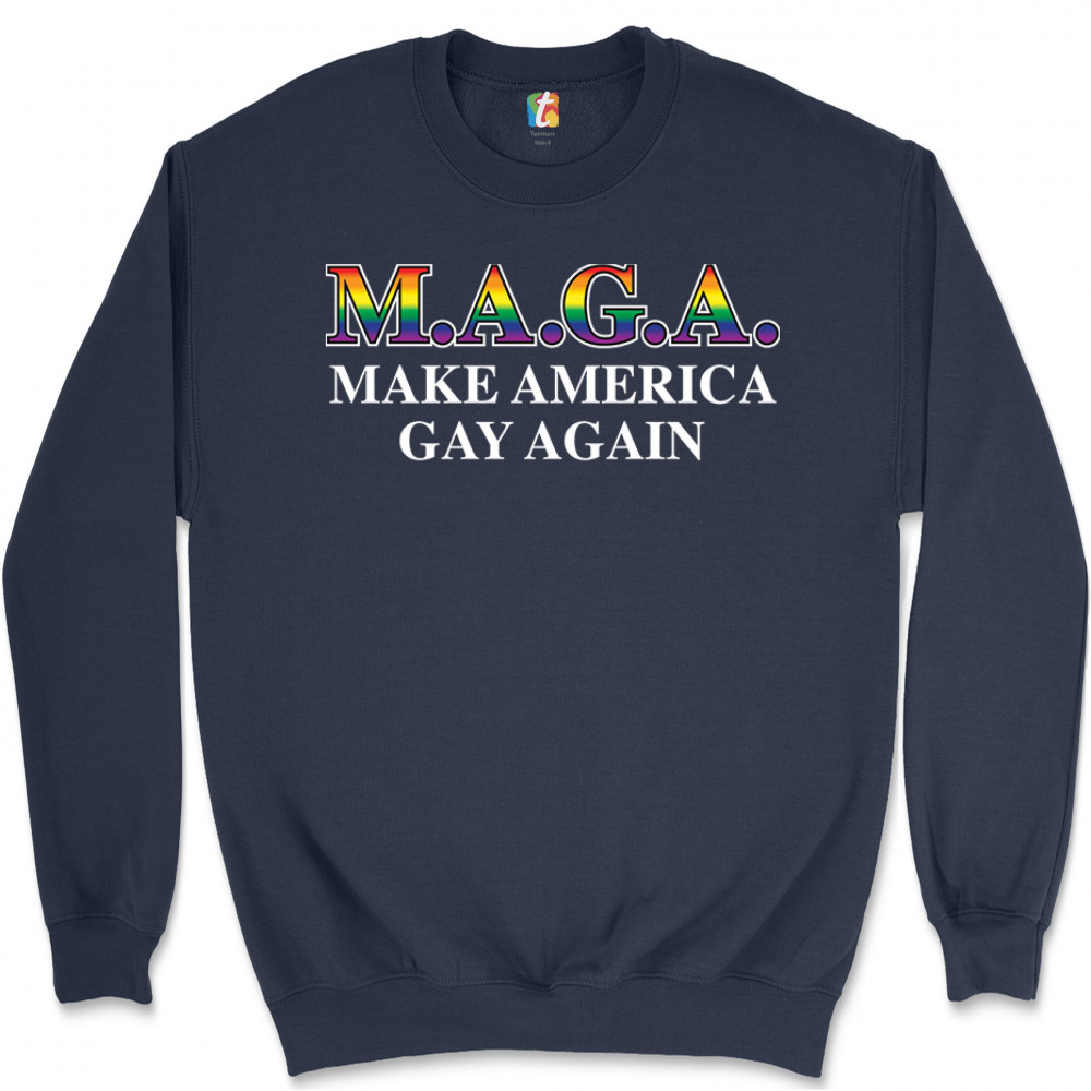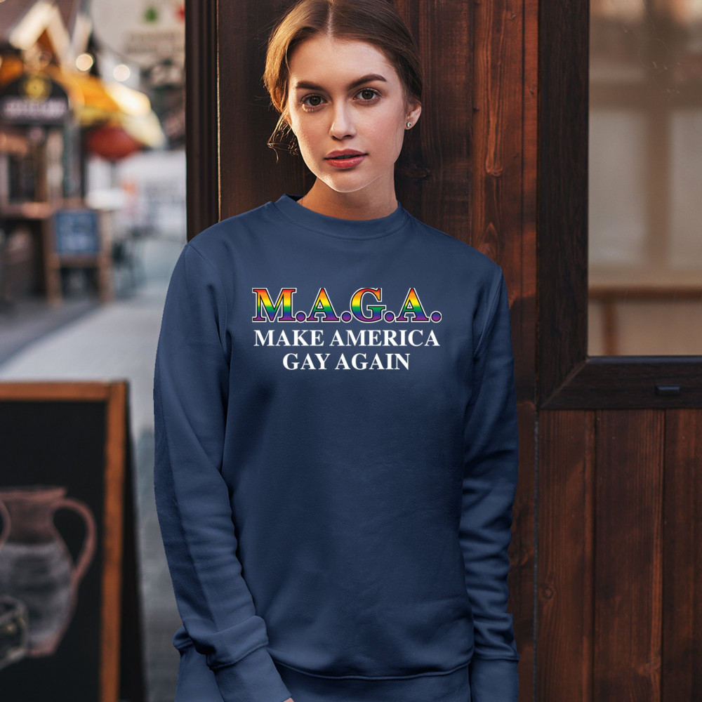 A funny print saying "M.A.G.A. Make America Gay Again". The acronym "M.A.G.A." is painted in the colors of lgbt rainbow. Wear it to show your support for the LGBTQ community.