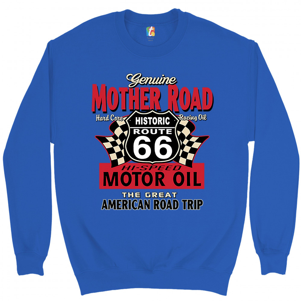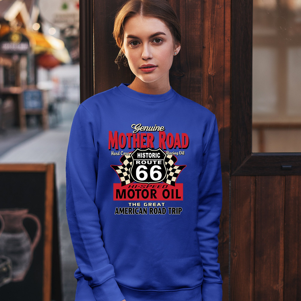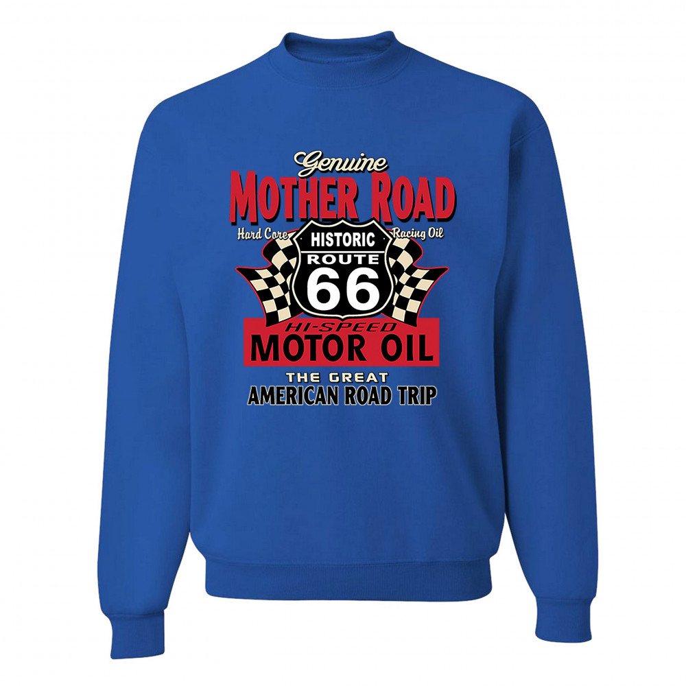 GENUINE MOTHER ROAD HISTORIC ROUTE 66 sweatshirt american road trip crewneck royal blue