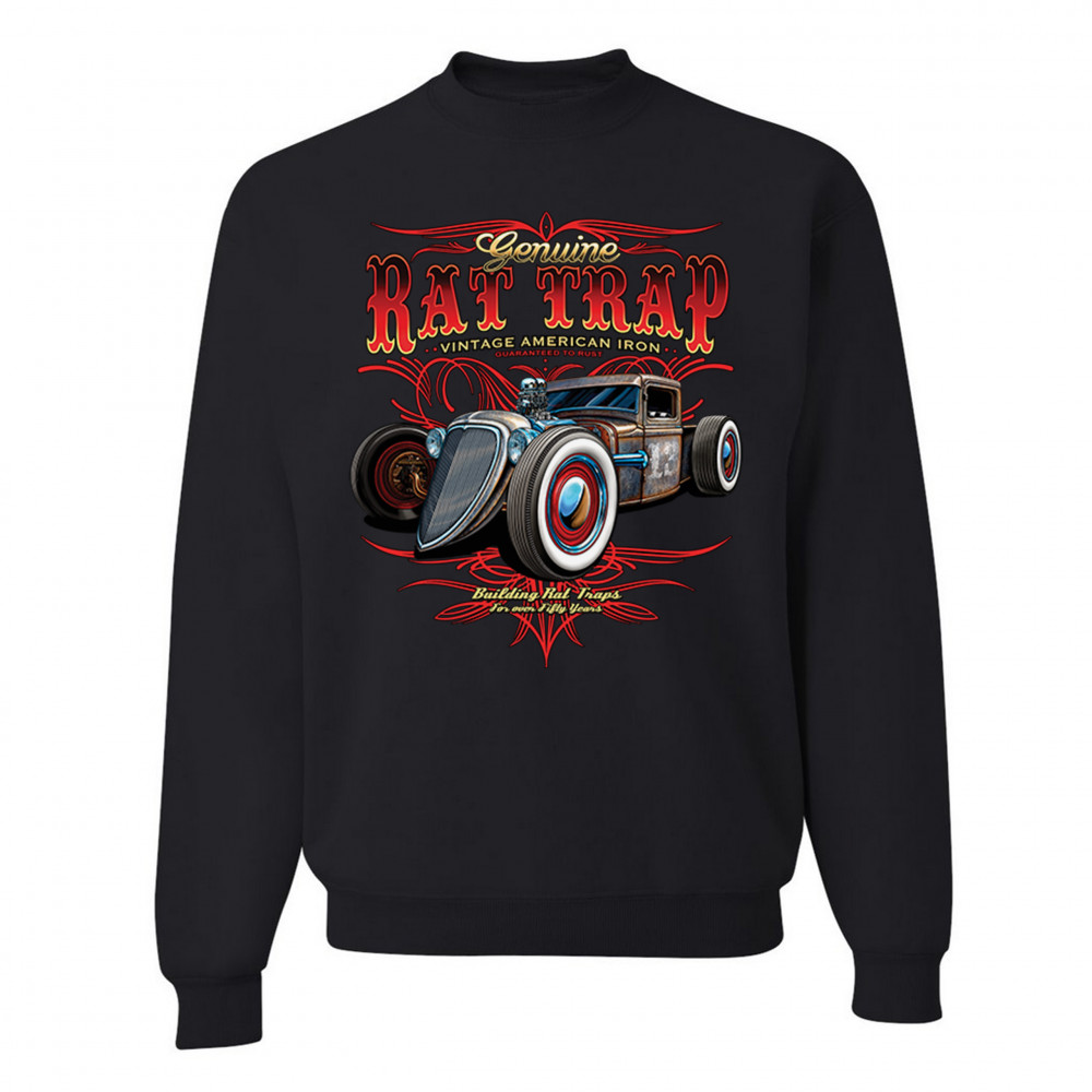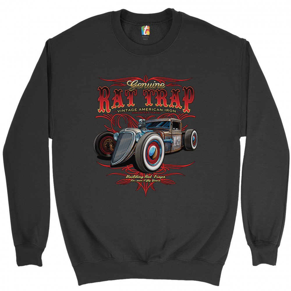 A print featuring a rusty rat rod with a number "13" on it's door. The prints says: "genuine rat trap, vintage American iron, guaranteed to rust" above the car and "bulding rat traps for over fifty years" below it. Great for Route 66 and hot rod fans.