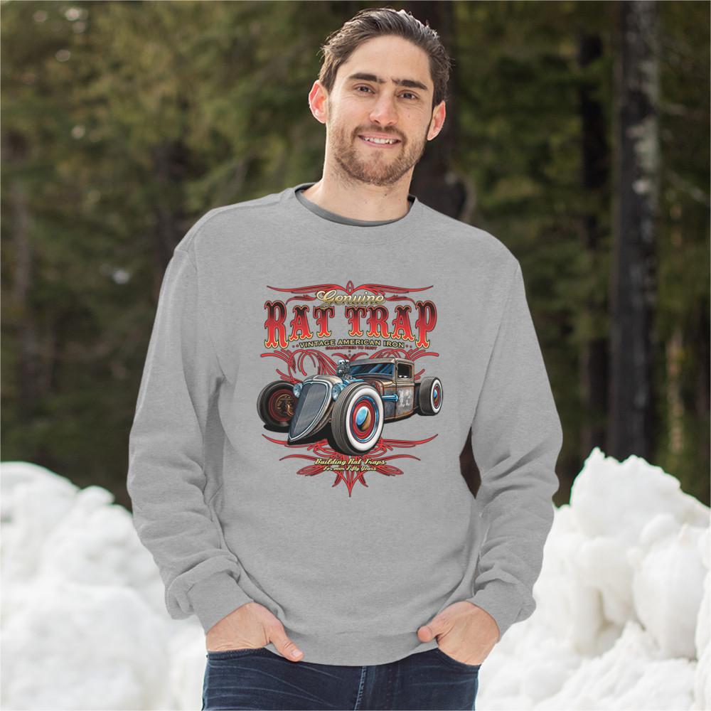 A print featuring a rusty rat rod with a number "13" on it's door. The prints says: "genuine rat trap, vintage American iron, guaranteed to rust" above the car and "bulding rat traps for over fifty years" below it. Great for Route 66 and hot rod fans.
