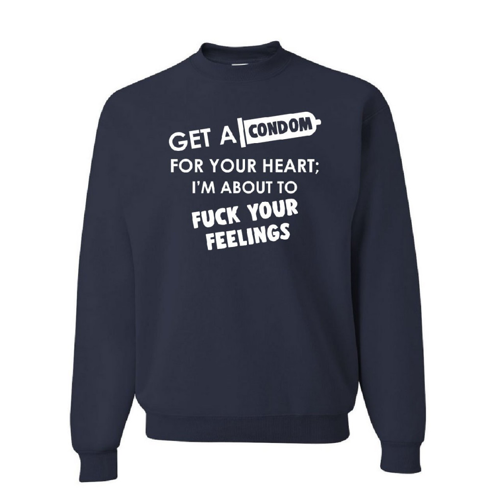 GET A CONDOM FOR YOUR HEART sweatshirt funny rude offensive humor sweater navy blue