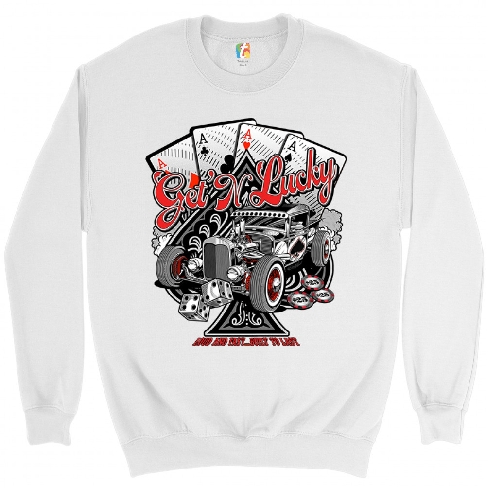 A print featuring a hot rod and a giant ace of spades behind it. In the background there are four aces of every suit. In front of the car there are 2 dices and several casino chips. The print says: "Get'n lucky, louad and fast… built to last". A great cho