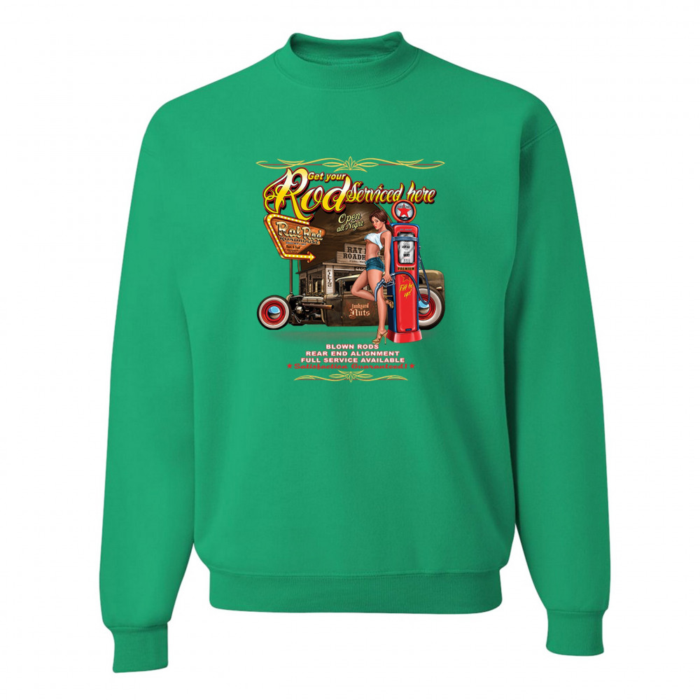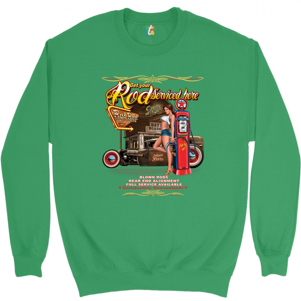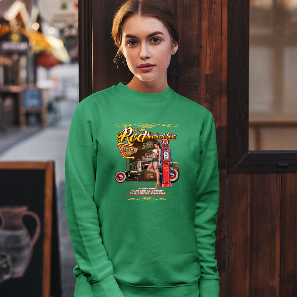 A print featuring a sexy pin-up girl leaning on a gas pump. There is a hot rod behind her and a "Rat Rod Roudhouse" in the background. The print also includes a bunch of innuendos: "get your rod serviced here, blown rods, rear end alignment, full service