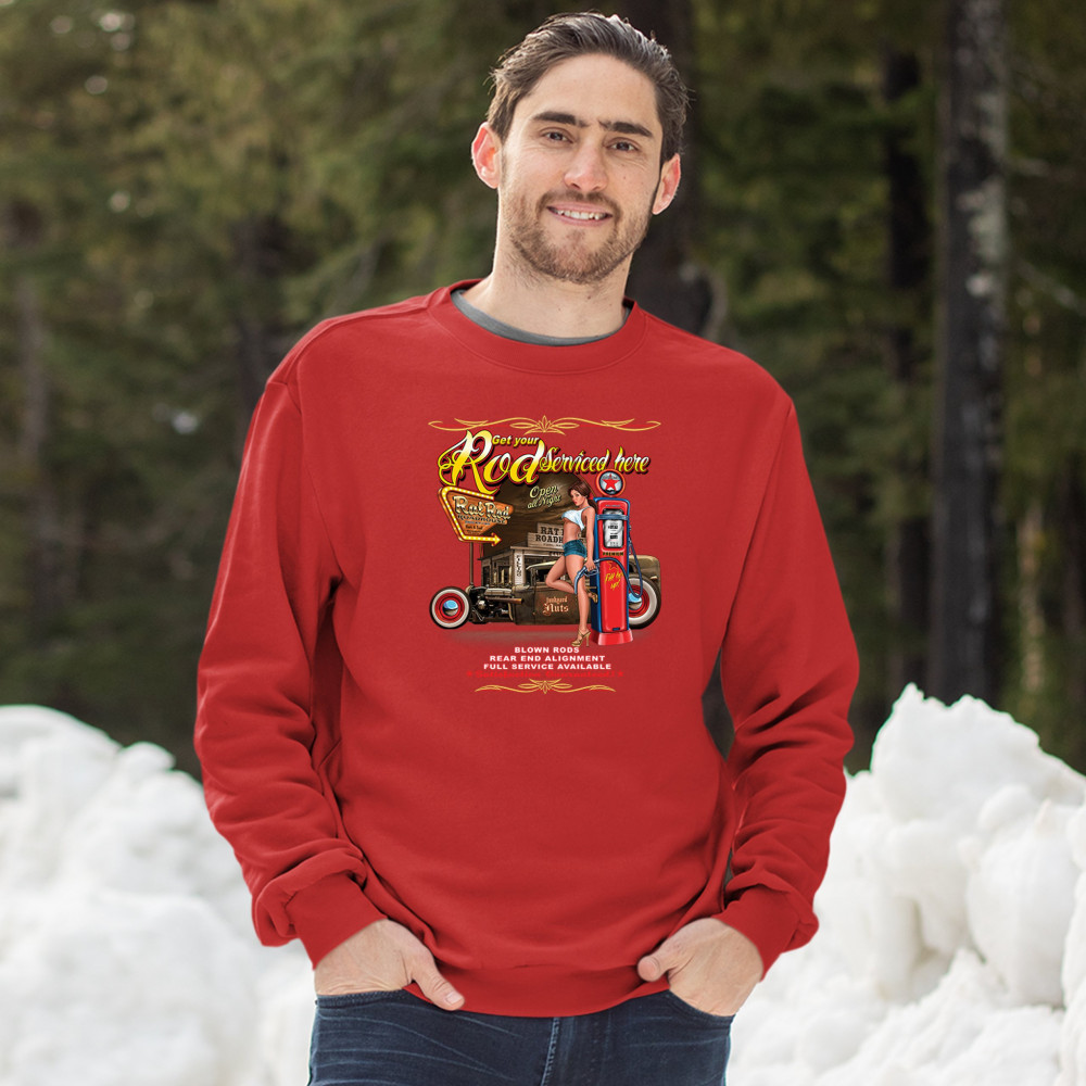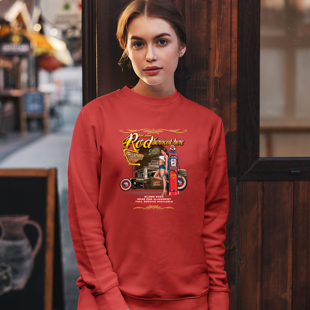 A print featuring a sexy pin-up girl leaning on a gas pump. There is a hot rod behind her and a "Rat Rod Roudhouse" in the background. The print also includes a bunch of innuendos: "get your rod serviced here, blown rods, rear end alignment, full service