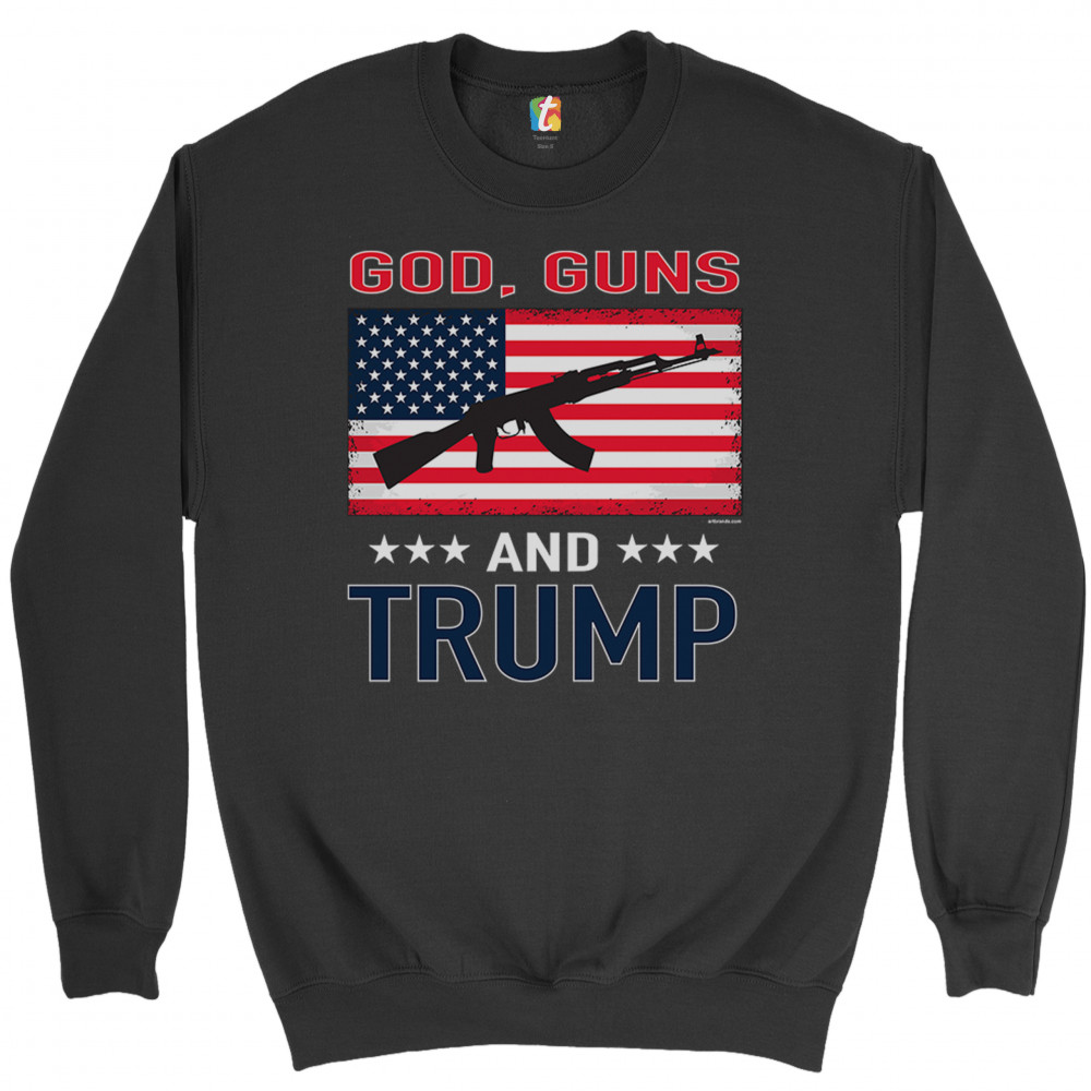 A political print saying "God, Guns and Trump". In the center there is the American flag with a silhouette of AK-47 rifle on it. A great choice to wear for a Trump rally or give as a gift to a Donald Trump and Mike Pence supporter before 2020 presidential elections.