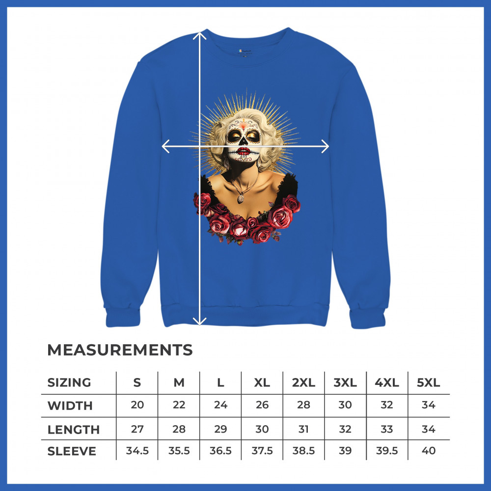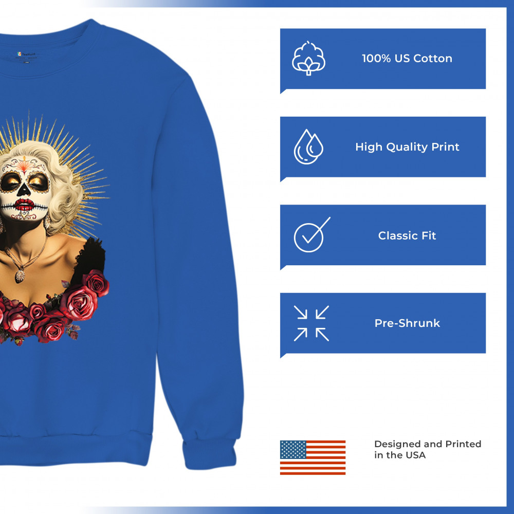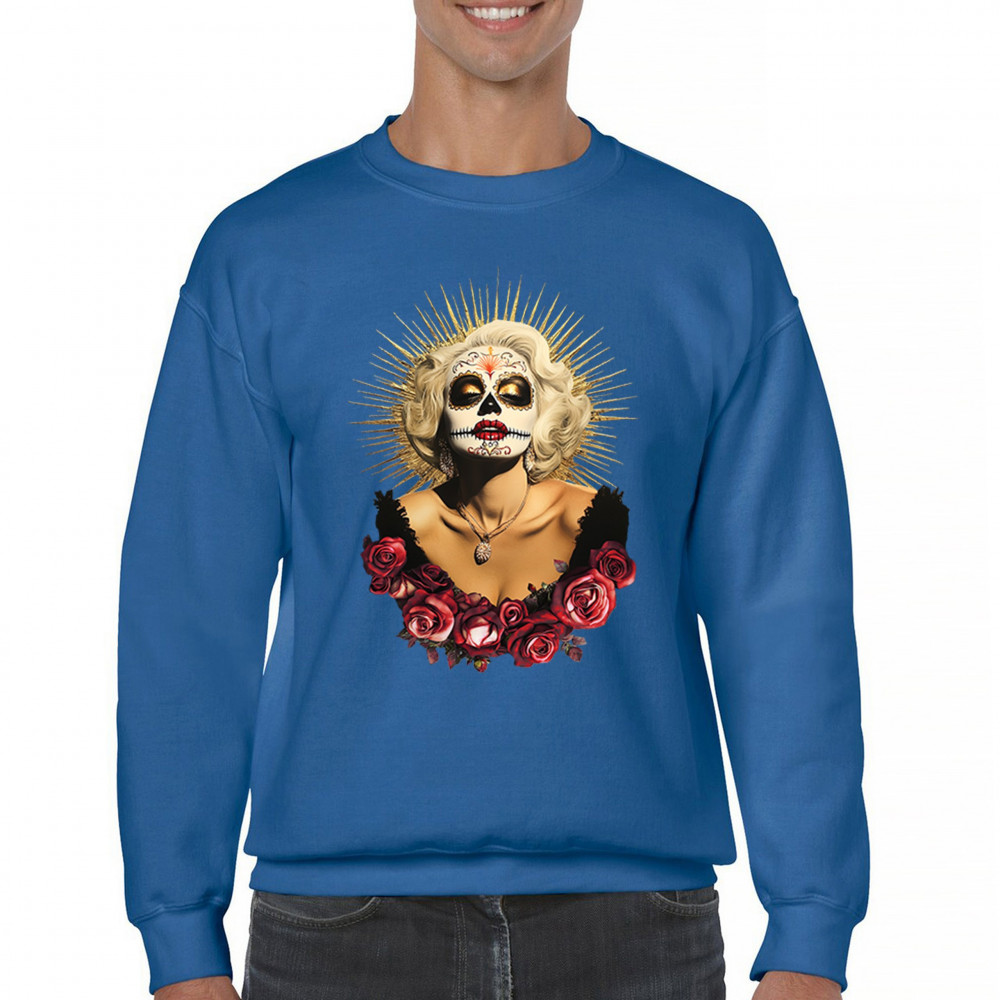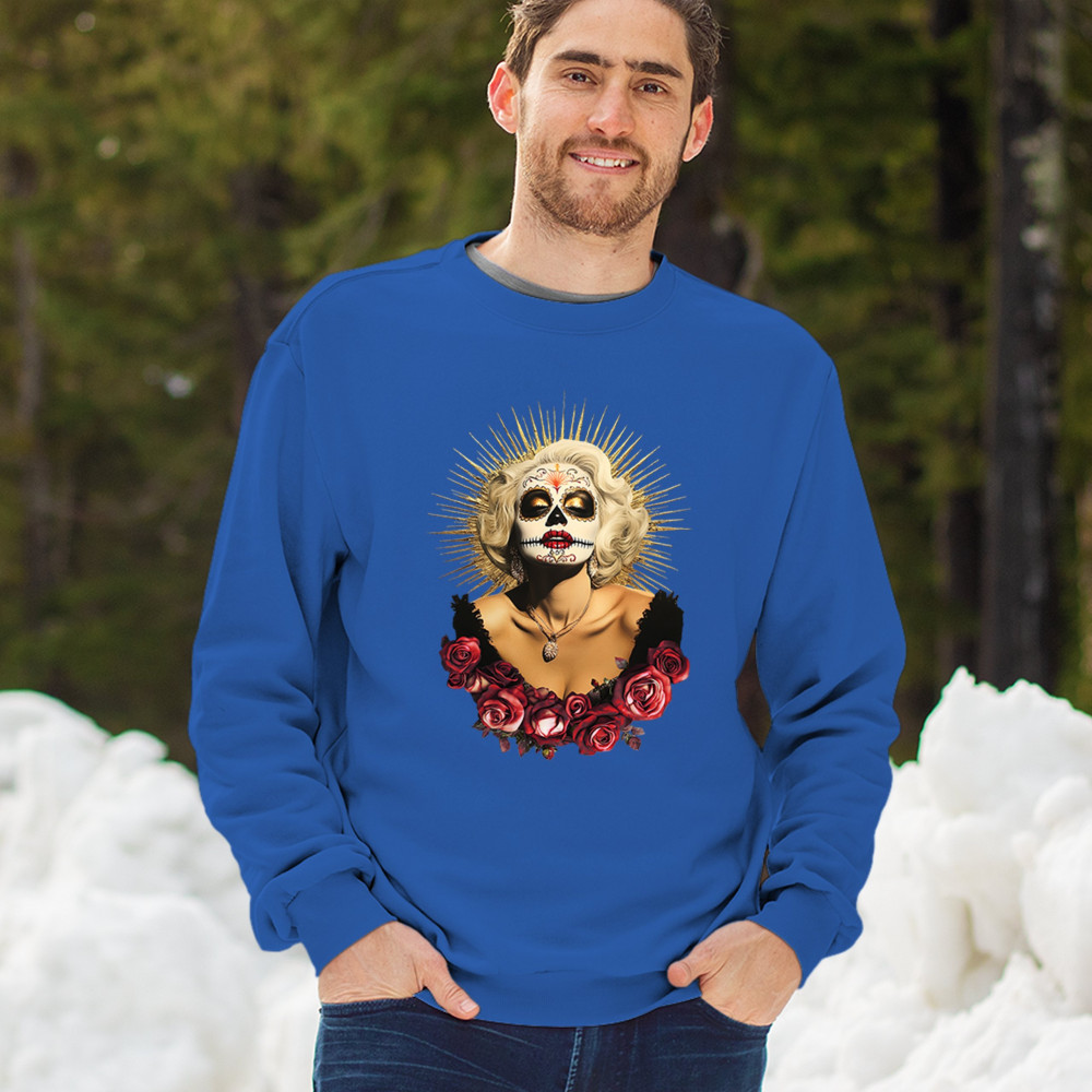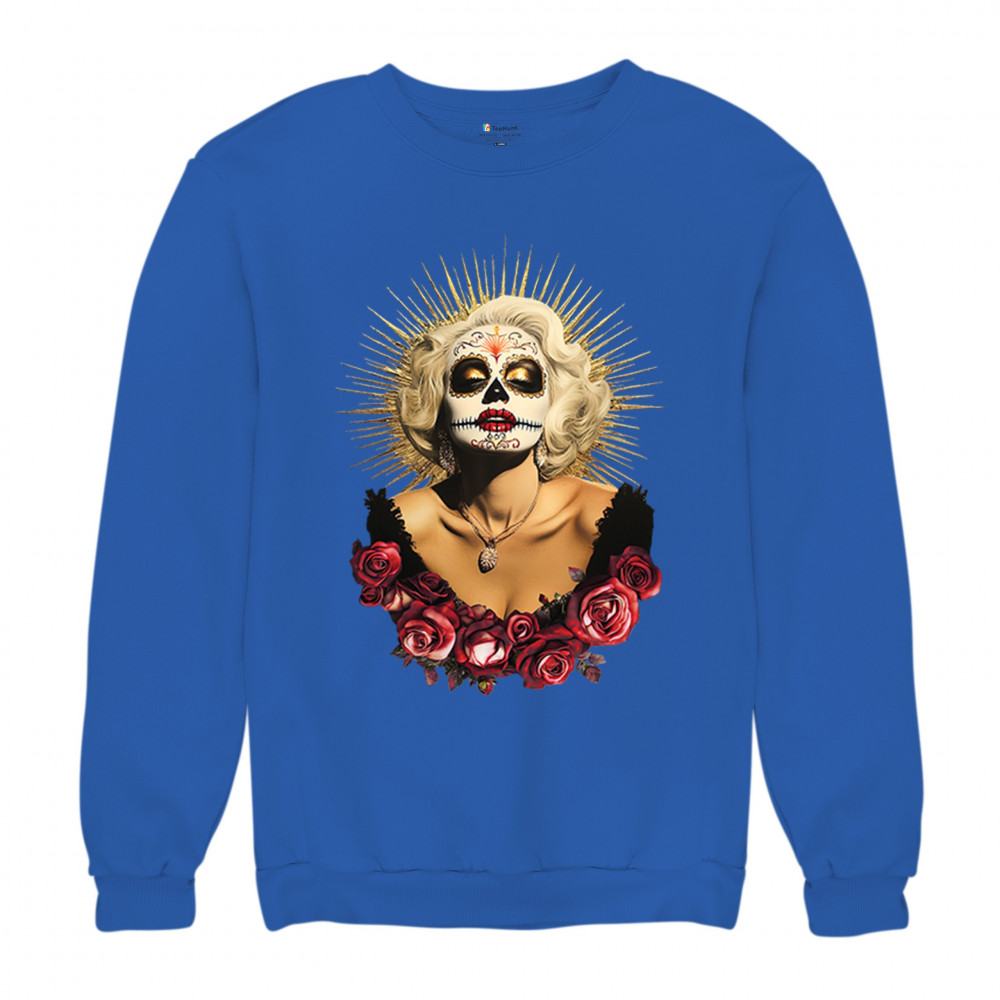 This bold and beautiful sugar skull design features a glamorous calavera woman crowned in a golden halo and framed by roses. A divine tribute to Dia de los Muertos, this look blends vintage glam, Latin culture, makeup artistry, and sacred symbolism. Perfect for fans of gothic beauty, Halloween, and heritage expression.