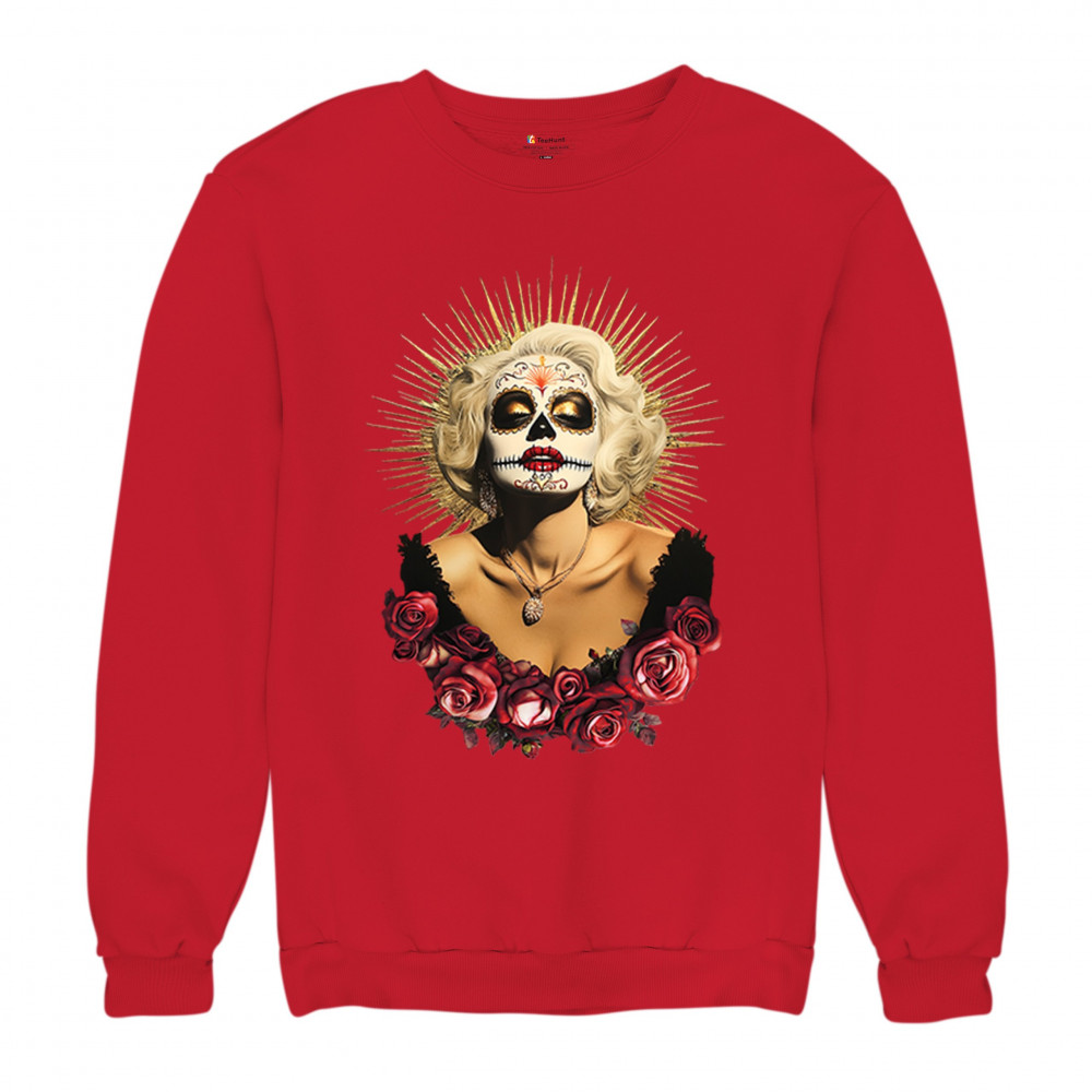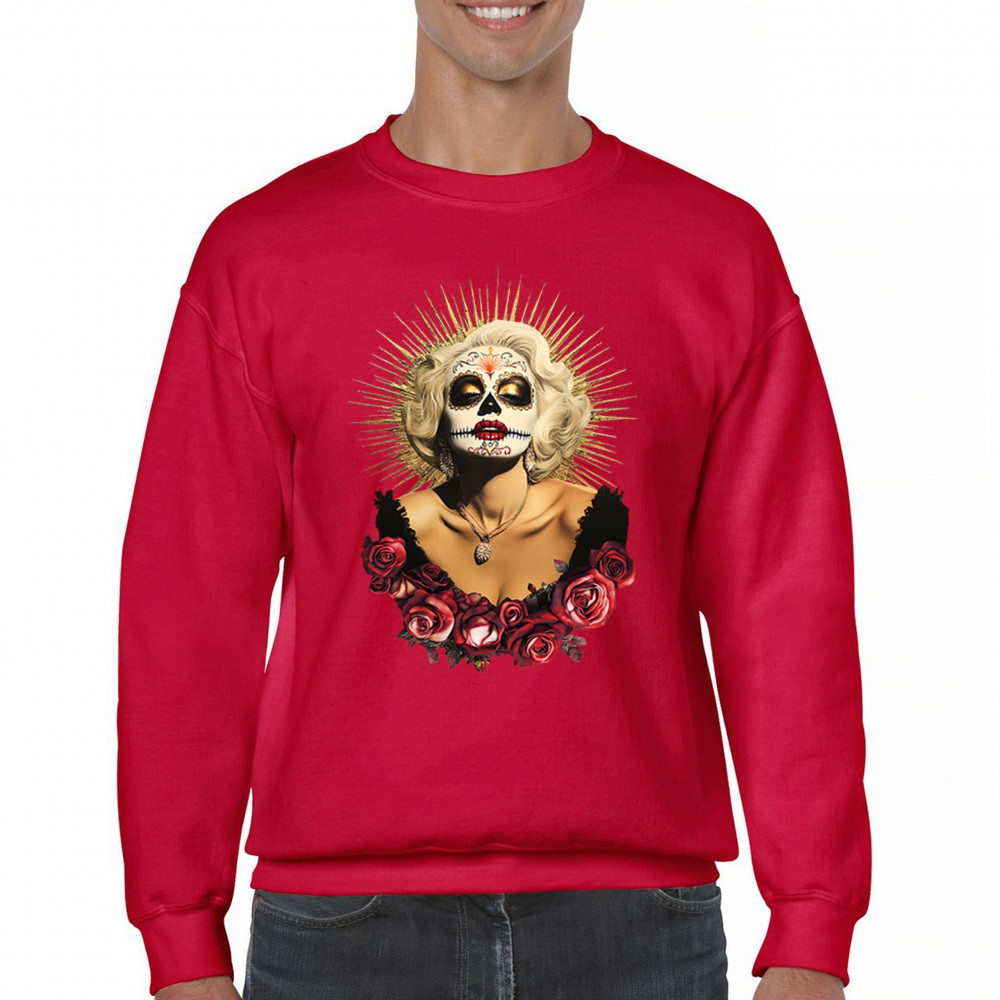 This bold and beautiful sugar skull design features a glamorous calavera woman crowned in a golden halo and framed by roses. A divine tribute to Dia de los Muertos, this look blends vintage glam, Latin culture, makeup artistry, and sacred symbolism. Perfect for fans of gothic beauty, Halloween, and heritage expression.