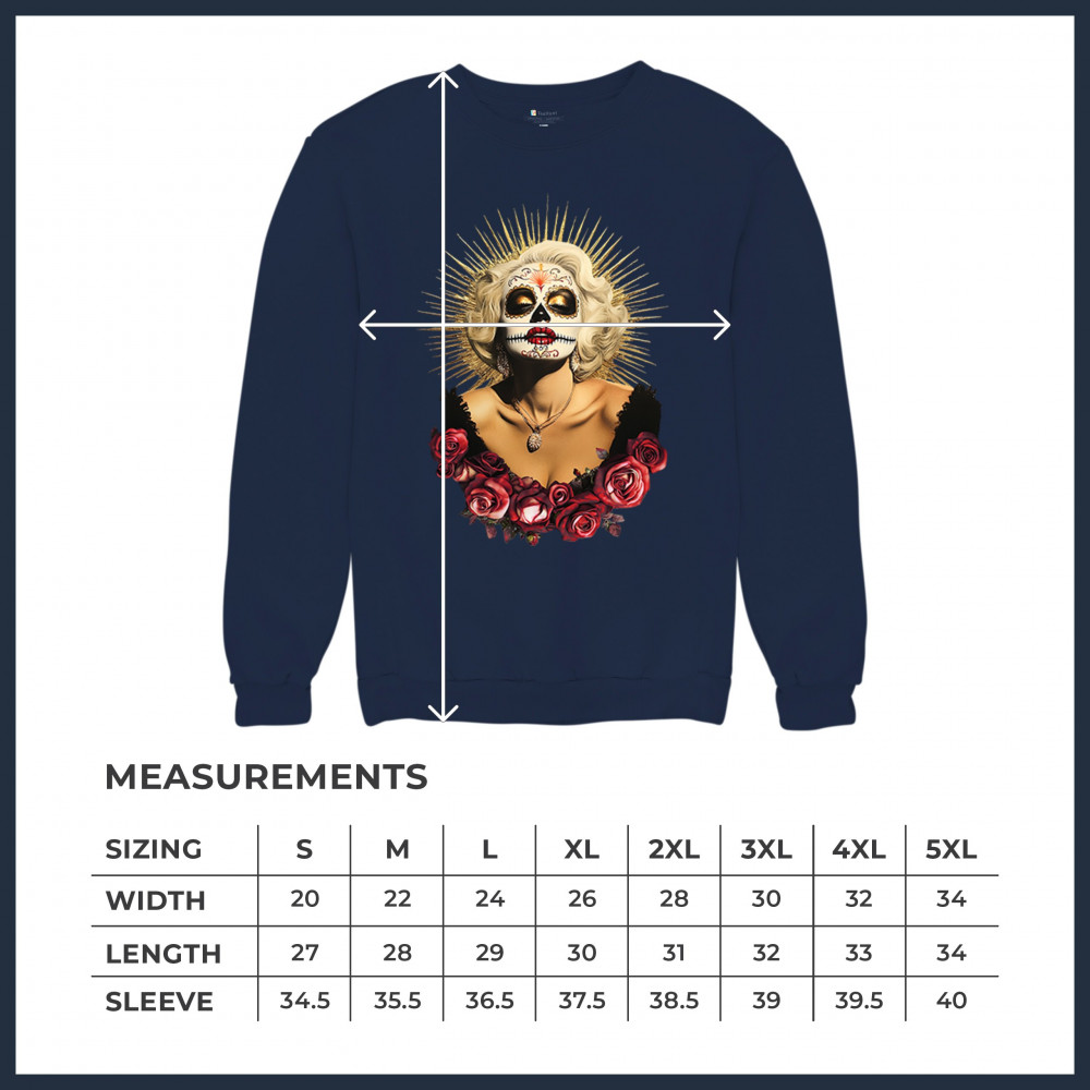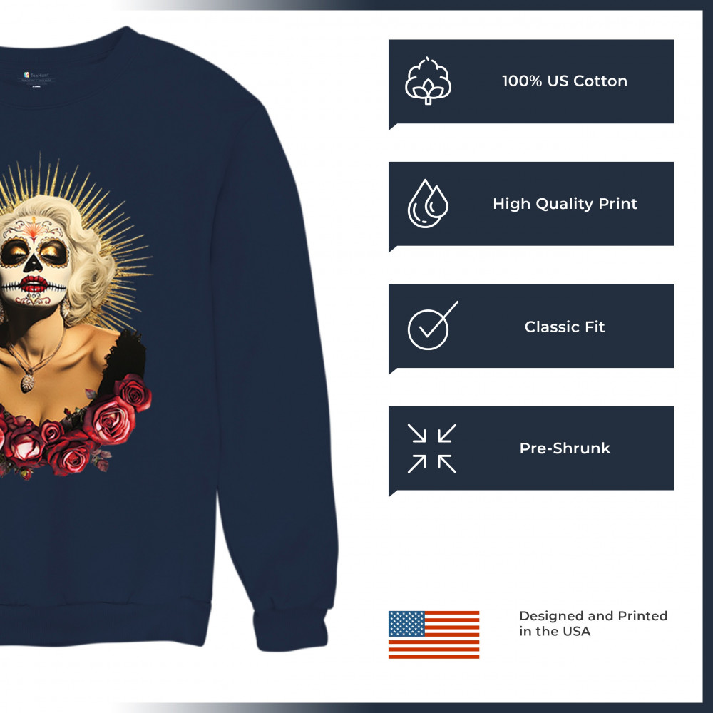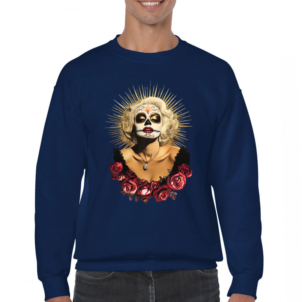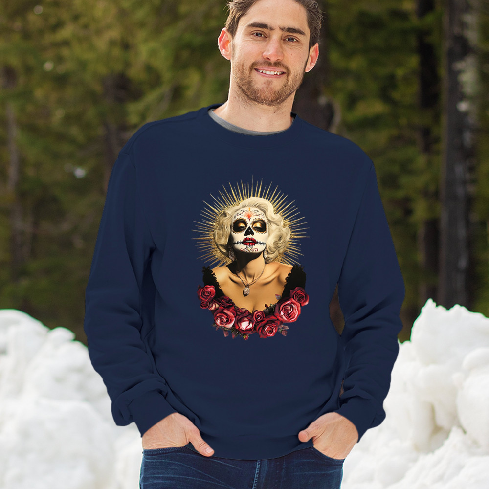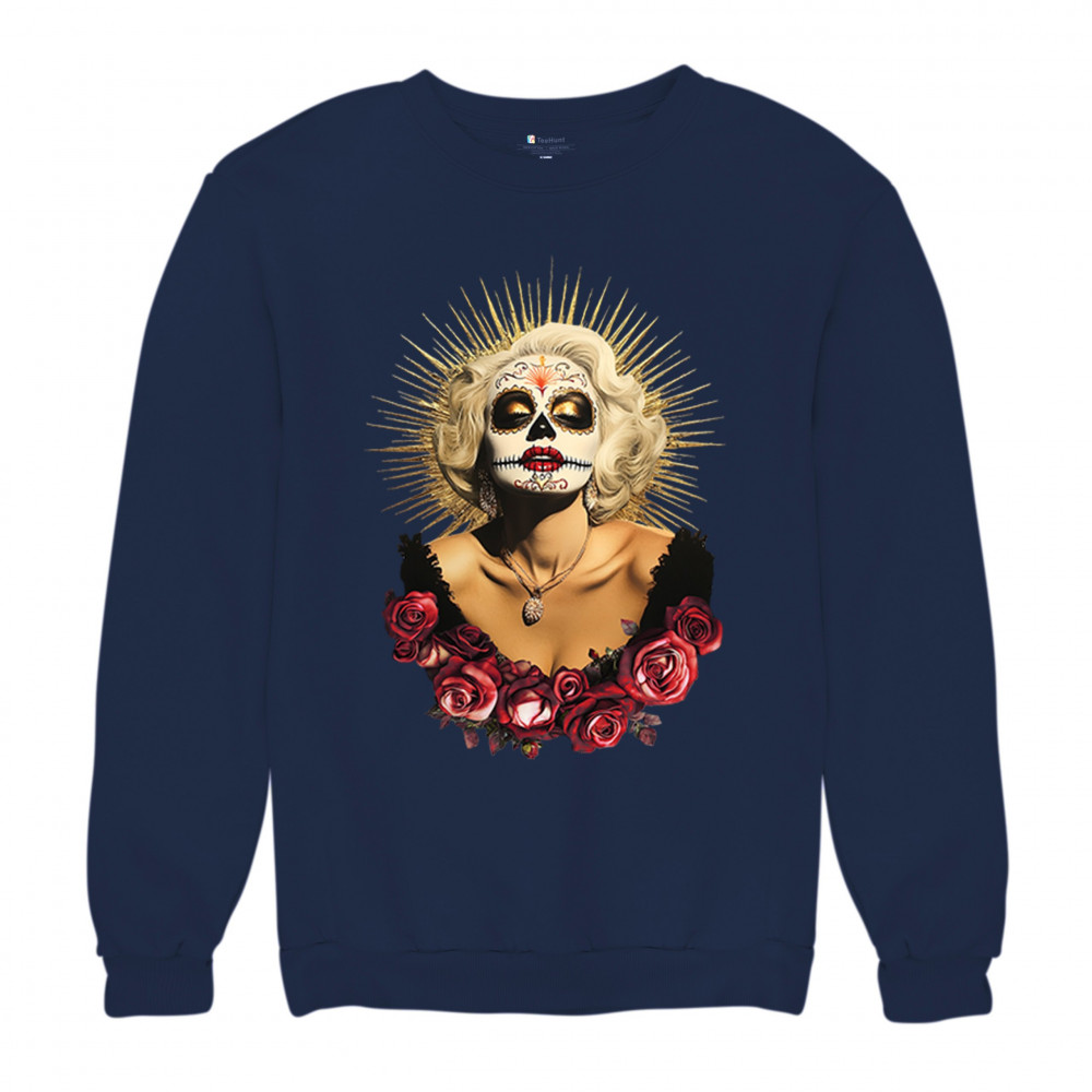 This bold and beautiful sugar skull design features a glamorous calavera woman crowned in a golden halo and framed by roses. A divine tribute to Dia de los Muertos, this look blends vintage glam, Latin culture, makeup artistry, and sacred symbolism. Perfect for fans of gothic beauty, Halloween, and heritage expression.