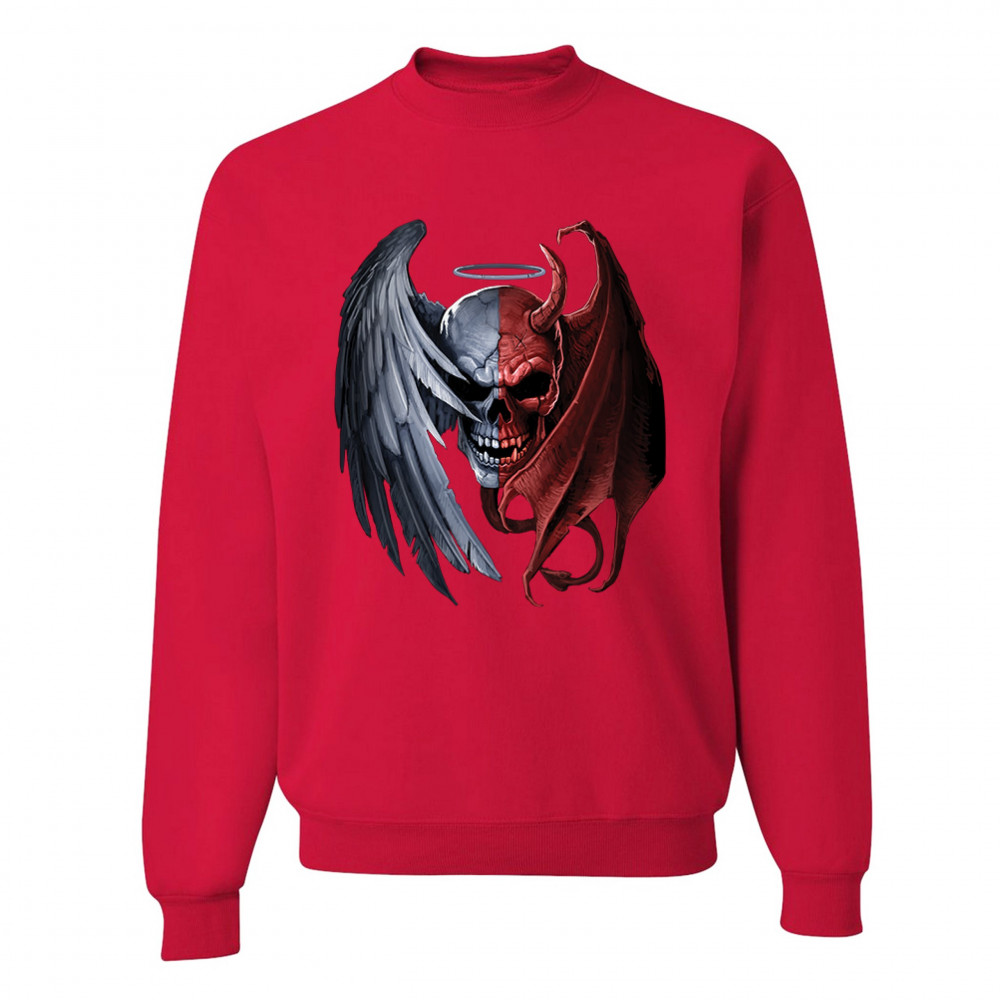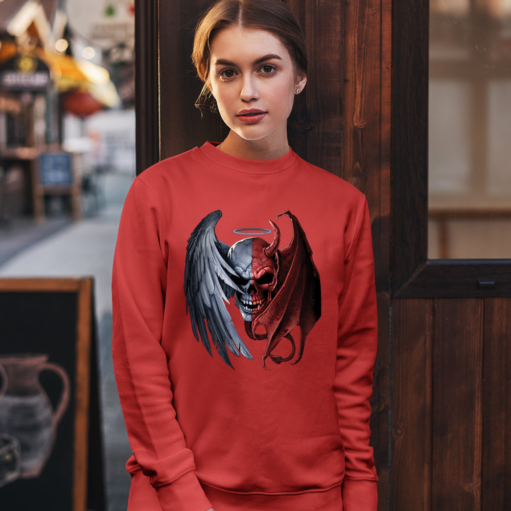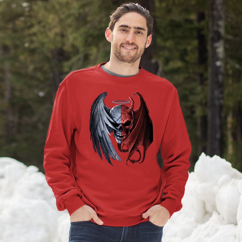 A print featuring a skull face, one half of which is light and has an angel's wing covering it and the other is dark with a horn sticking out of the forehead and a demon's wing. Below the skull you can see a demon's tail and a halo above it. A great