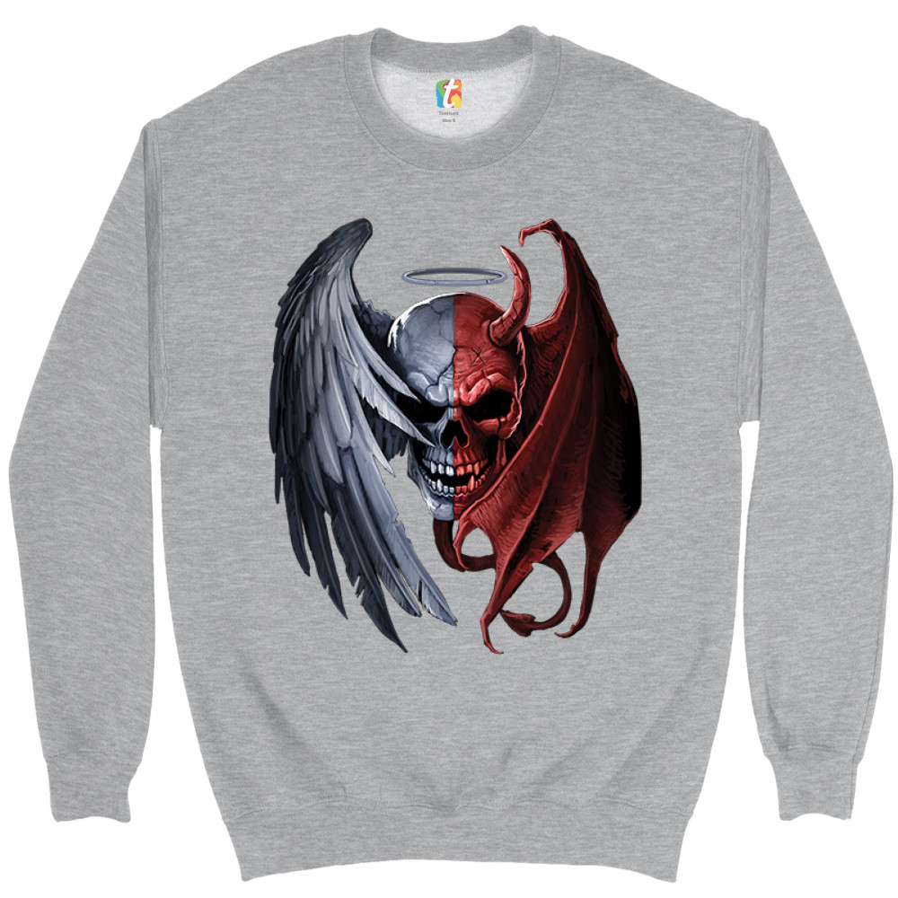 A print featuring a skull face, one half of which is light and has an angel's wing covering it and the other is dark with a horn sticking out of the forehead and a demon's wing. Below the skull you can see a demon's tail and a halo above it. A great