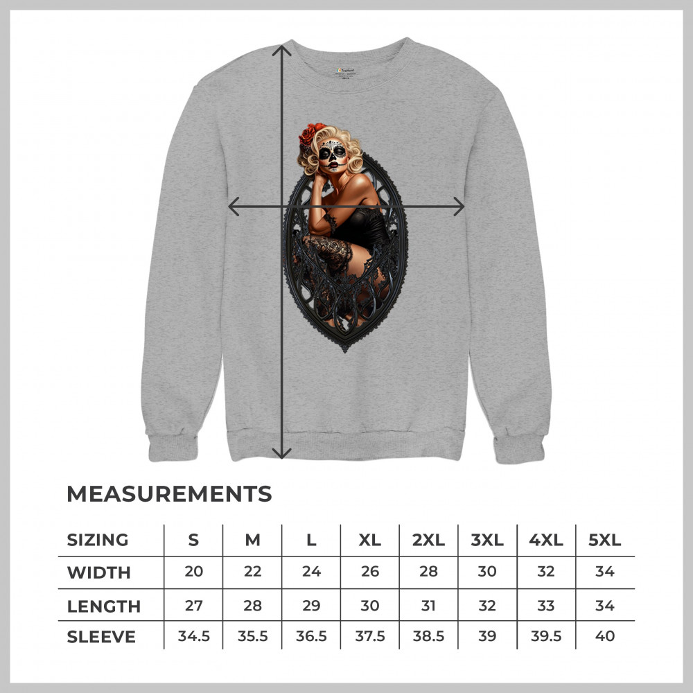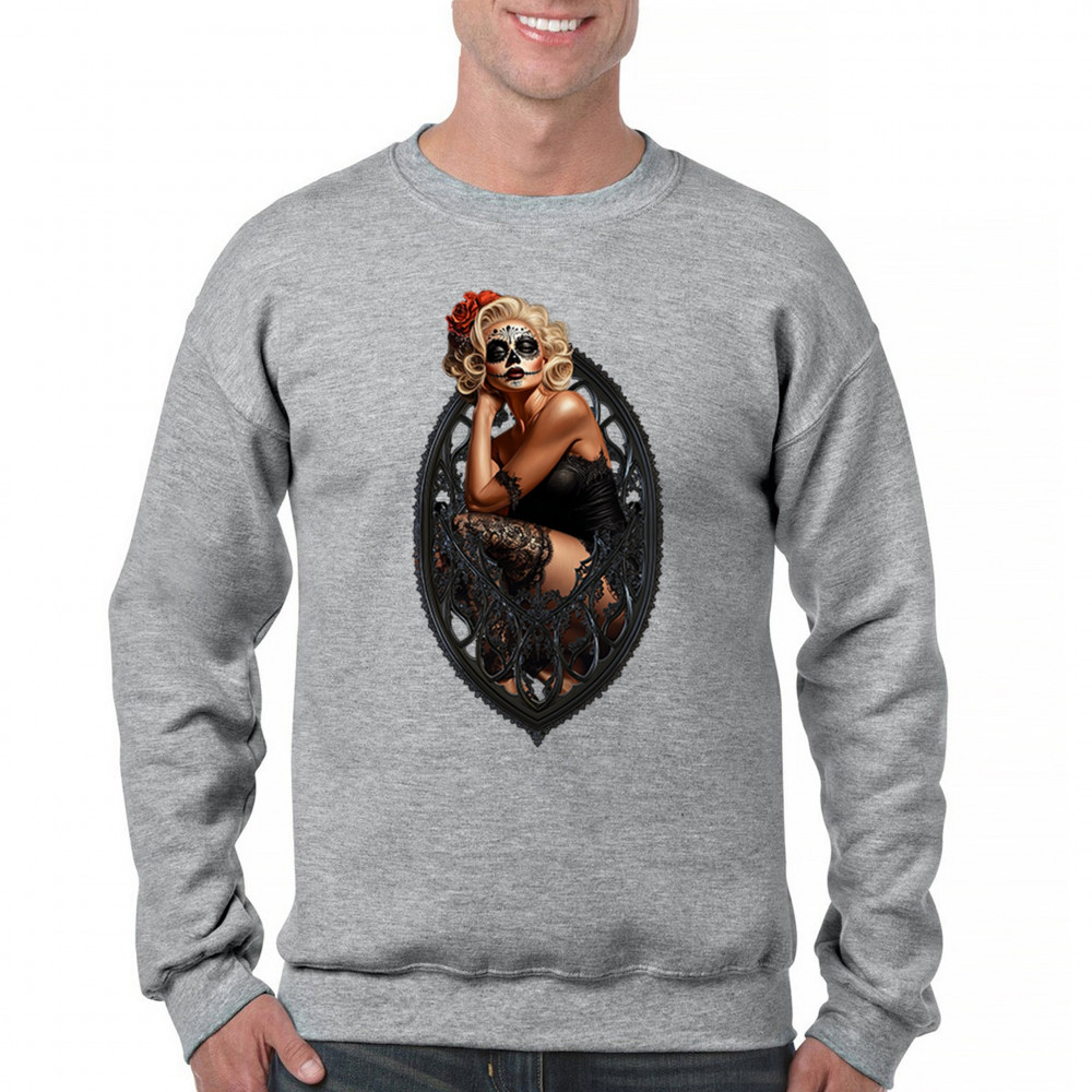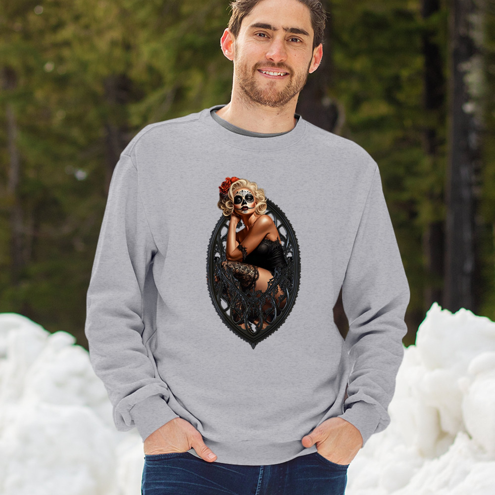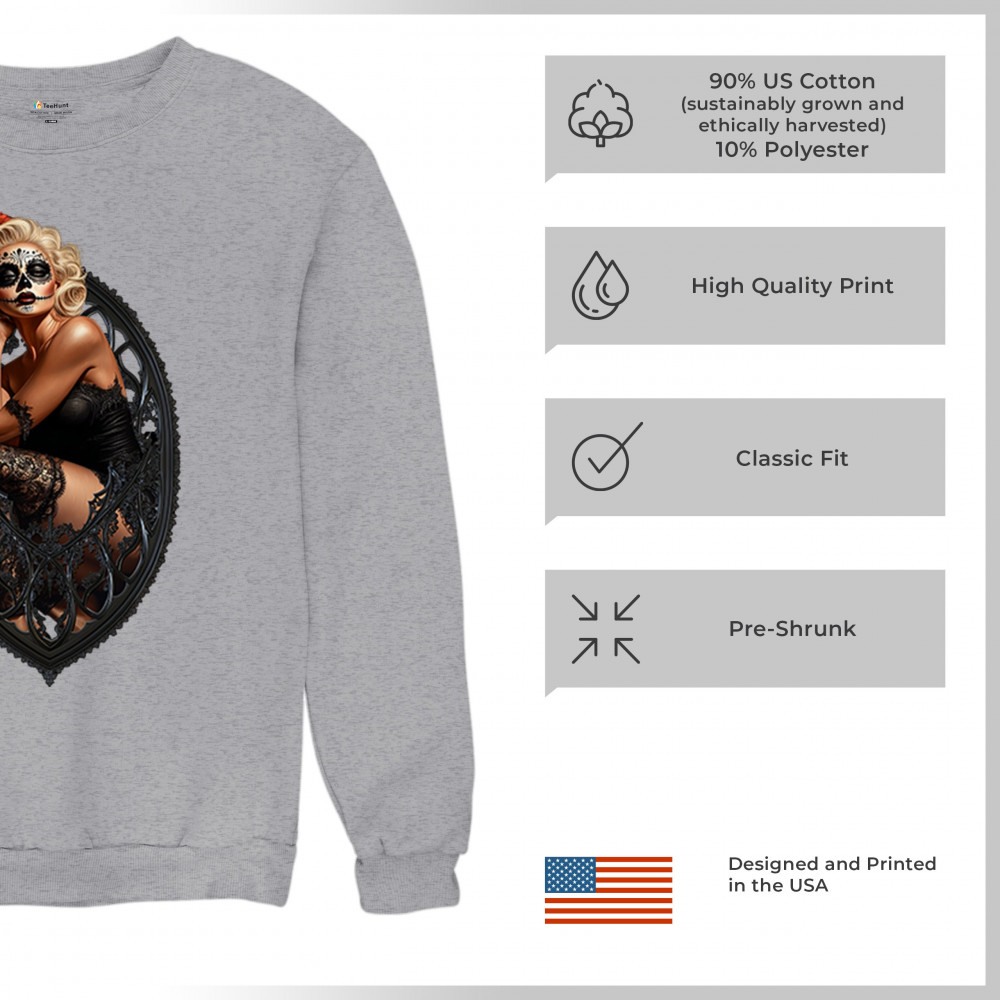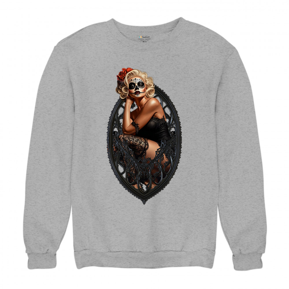 This sultry sugar skull pinup design blends gothic lace, seductive pose, and ornate frame detail for a bold Day of the Dead tribute. With striking makeup and vintage lingerie styling, it’s perfect for fans of macabre fashion, calavera art, and dark romance. A hauntingly beautiful mix of allure, attitude, and Dia de los Muertos charm.