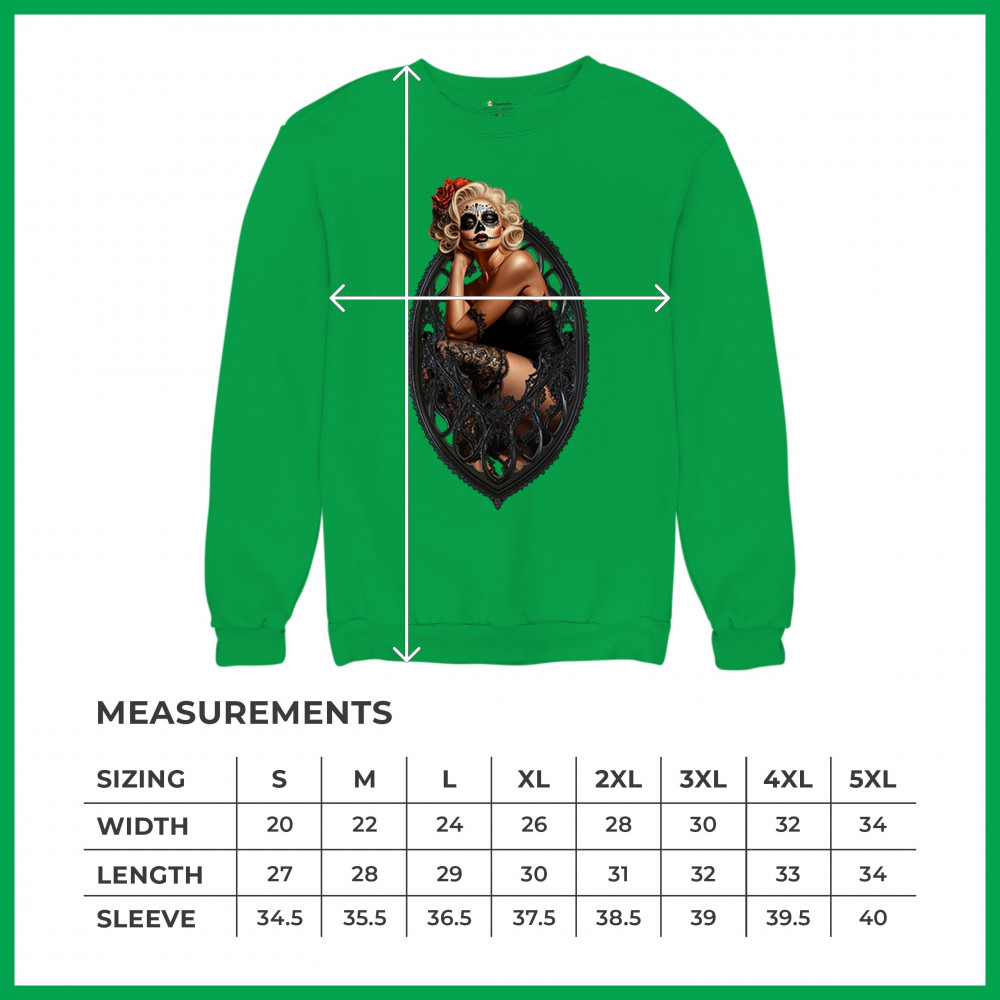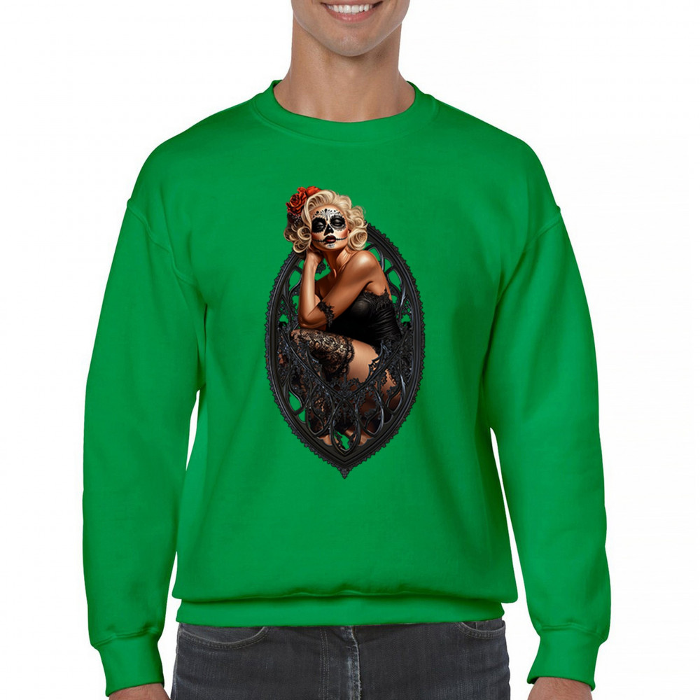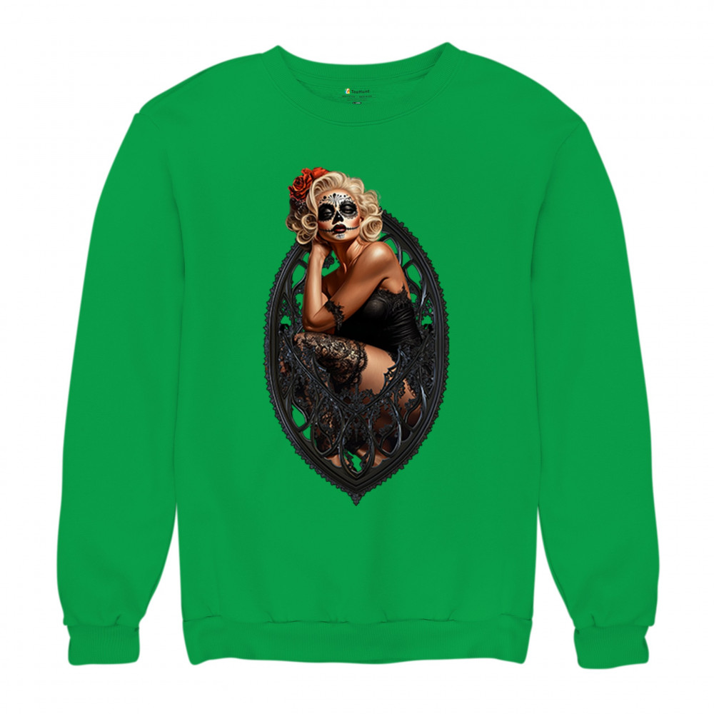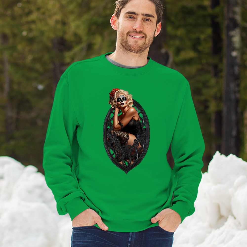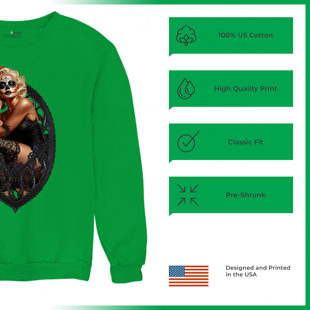 This sultry sugar skull pinup design blends gothic lace, seductive pose, and ornate frame detail for a bold Day of the Dead tribute. With striking makeup and vintage lingerie styling, it’s perfect for fans of macabre fashion, calavera art, and dark romance. A hauntingly beautiful mix of allure, attitude, and Dia de los Muertos charm.