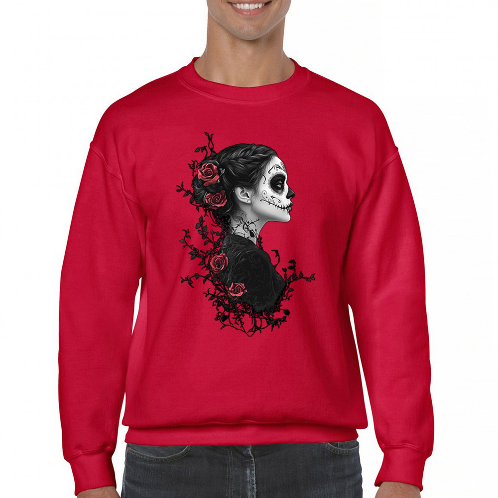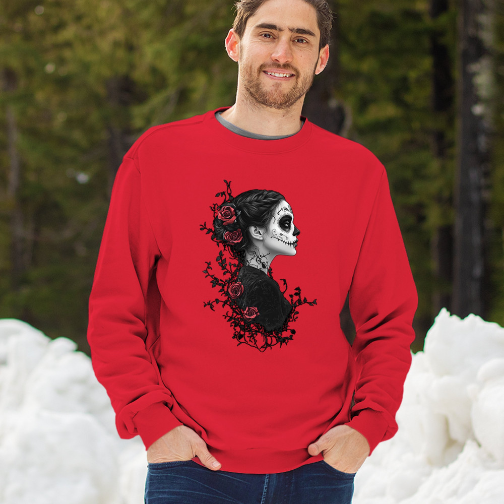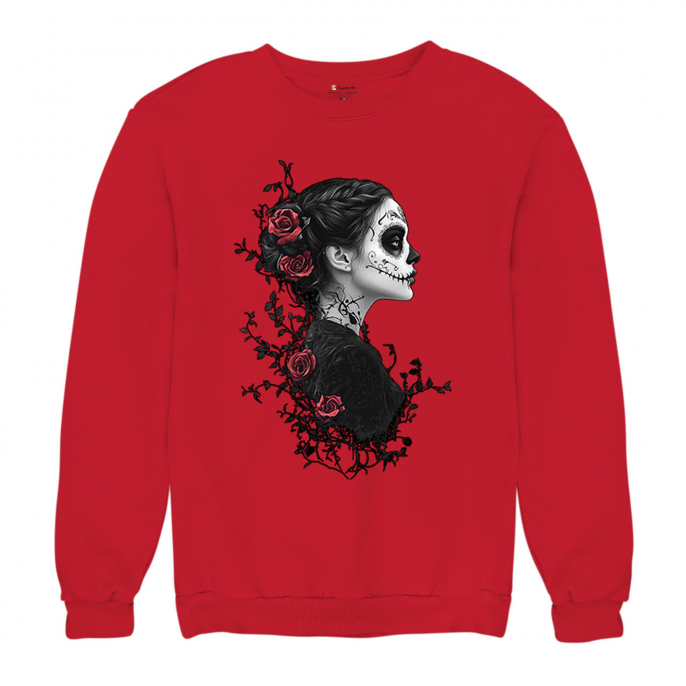 Celebrate Dia de los Muertos in style with this refined sugar skull woman design. Featuring a side profile view, vibrant red roses, and dark gothic floral elements, it creates a graceful balance between mystery and beauty. Ideal for fans of macabre art, skull themes, and honoring ancestral traditions through elegant visuals.