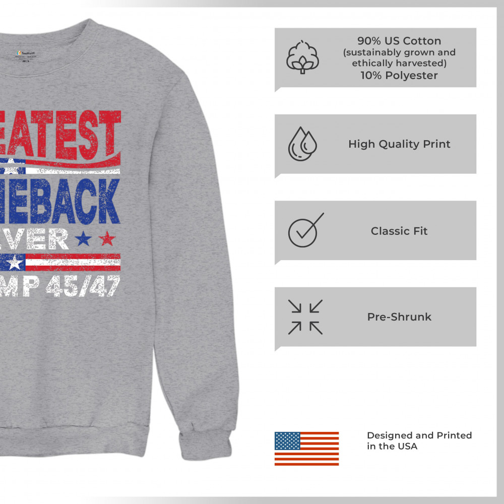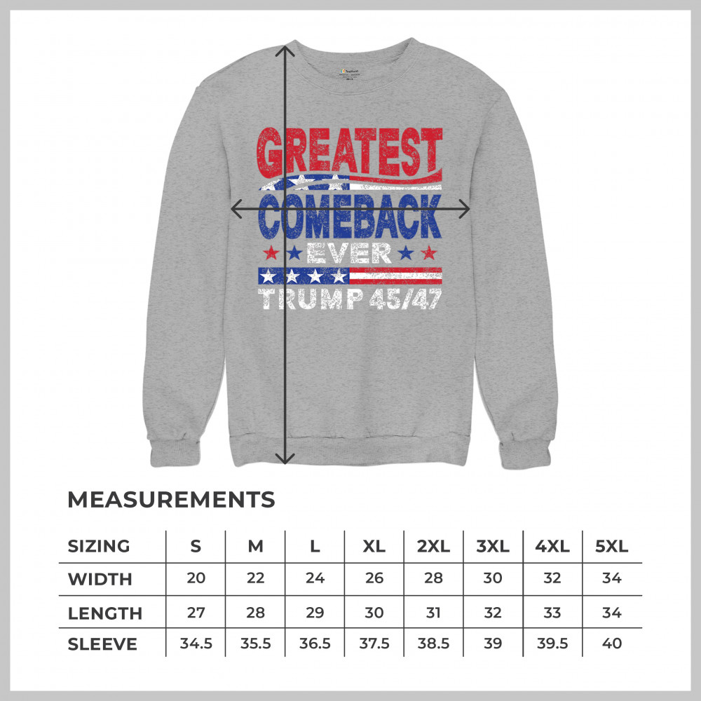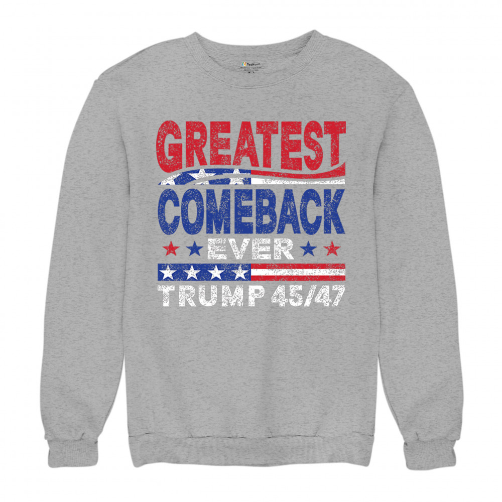 The "Greatest Comeback Ever" design is a tribute to resilience, patriotism, and the fight for American values. Featuring bold patriotic colors and a slogan that embodies the spirit of victory, this design is perfect for Trump supporters and conservatives who believe in never surrendering. Celebrate the leadership of Donald J. Trump as the 45th and 47th president and join the movement for America's future.
