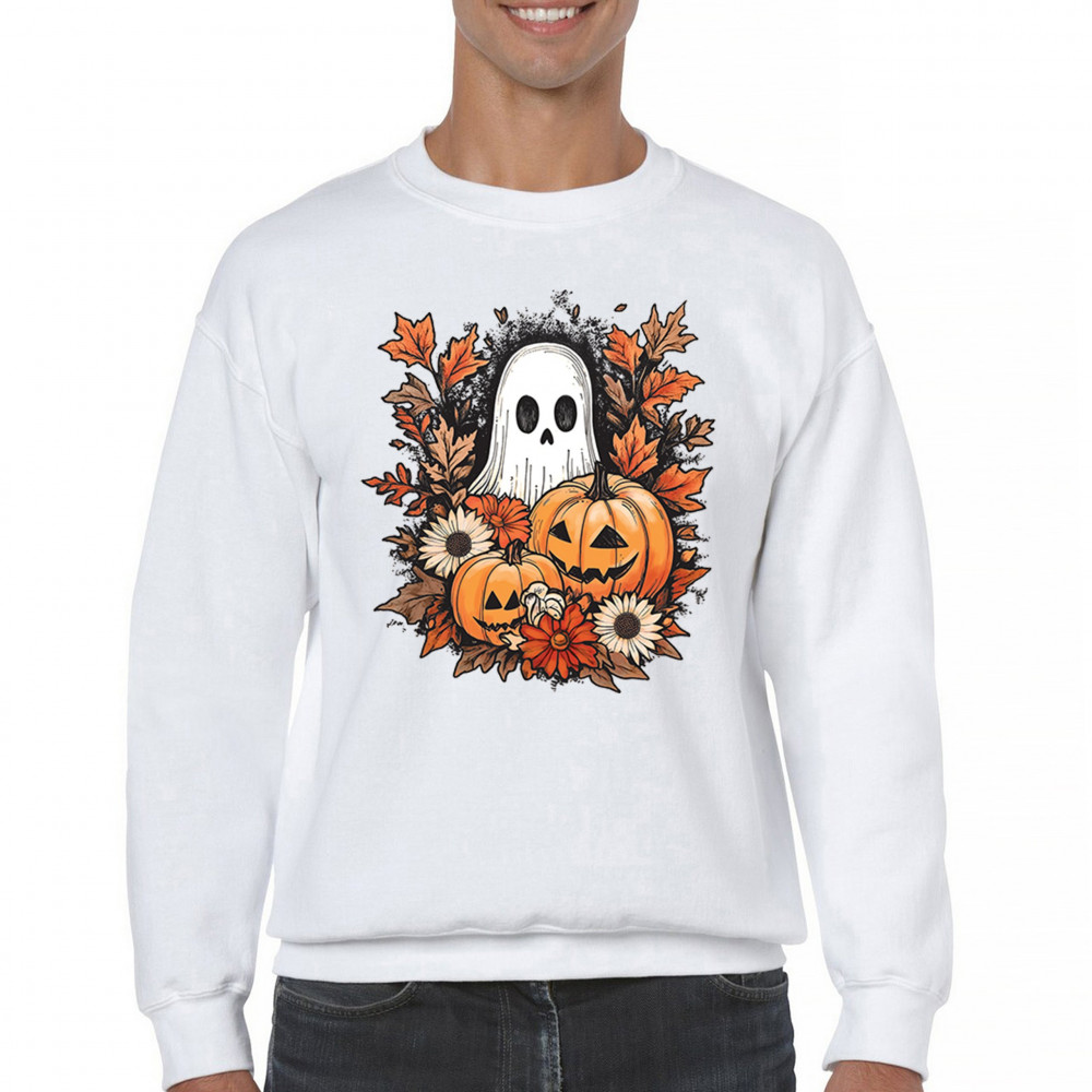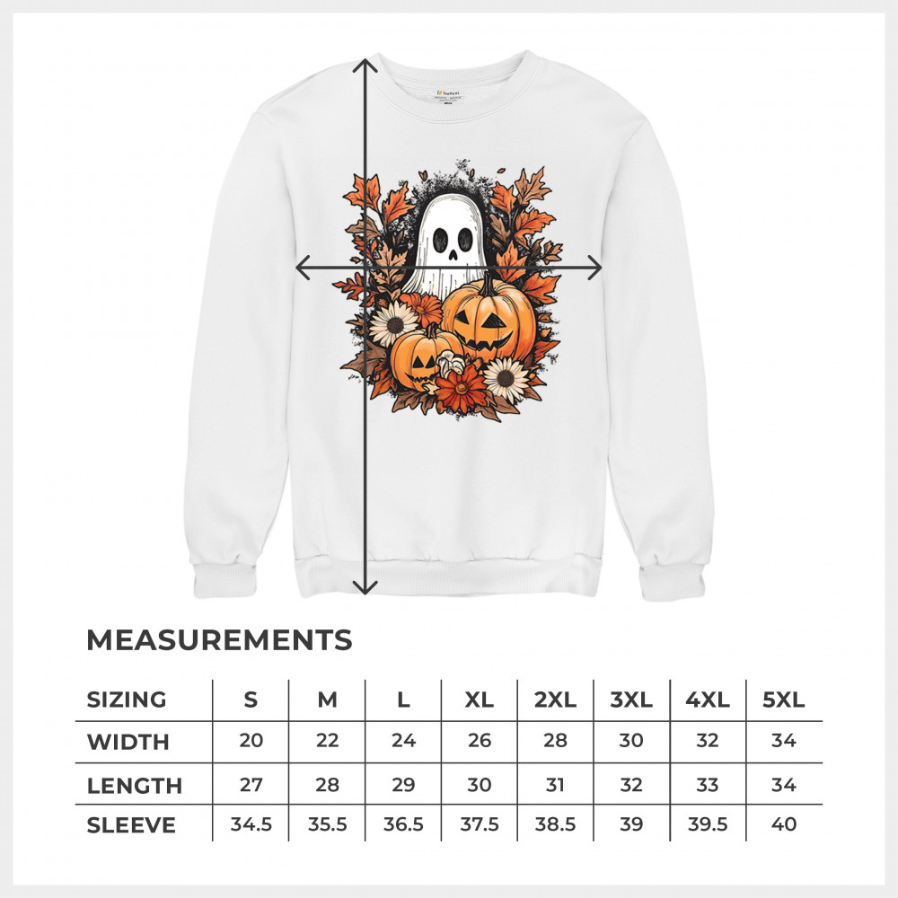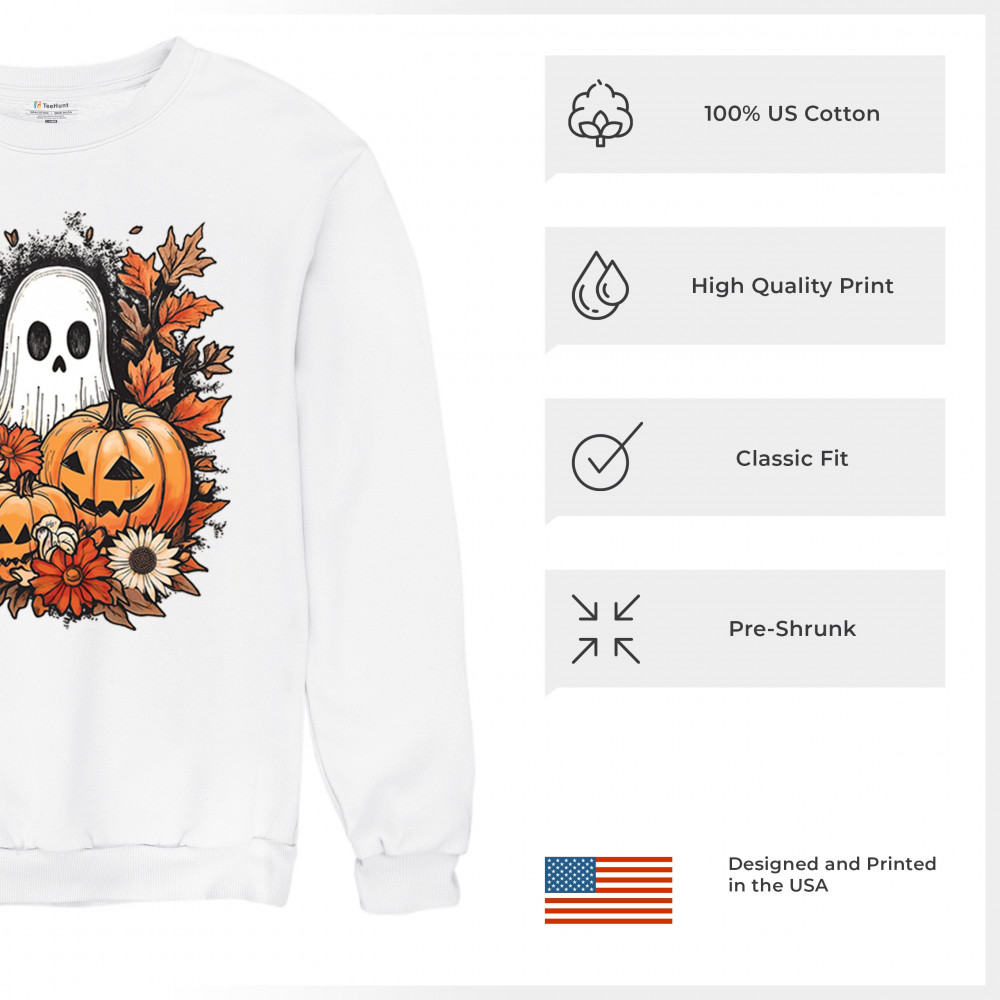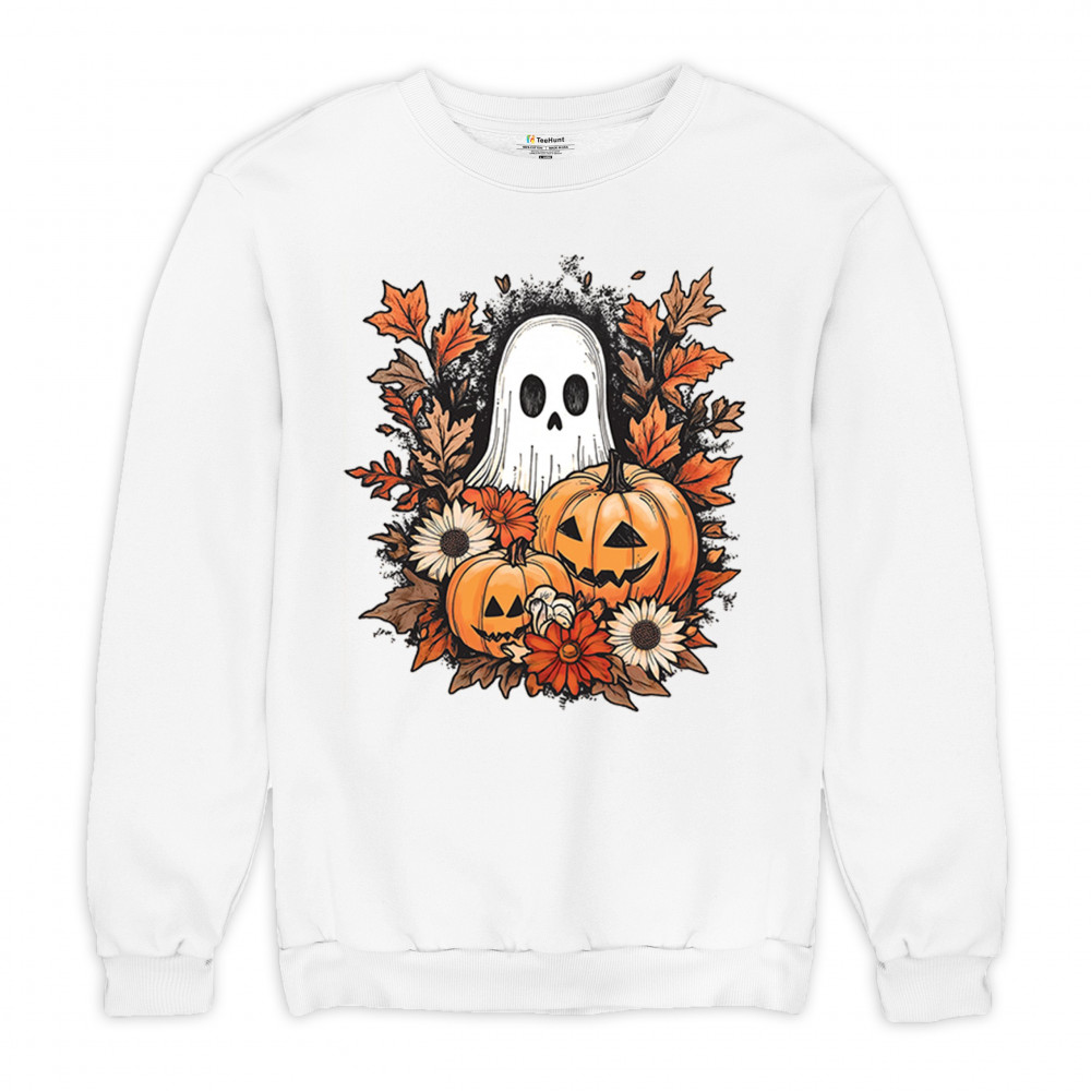 Celebrate the arrival of fall with this delightful design featuring pumpkins, autumn leaves, flowers, and a cute ghost. It's the perfect addition to your Halloween and autumn-themed wardrobe, or even as decor to welcome the fall spirit into your home. The combination of spooky and cozy elements creates a festive yet warm vibe, ideal for Halloween parties, pumpkin patch trips, or just enjoying the beautiful fall season.