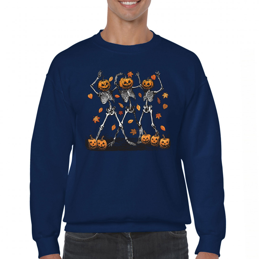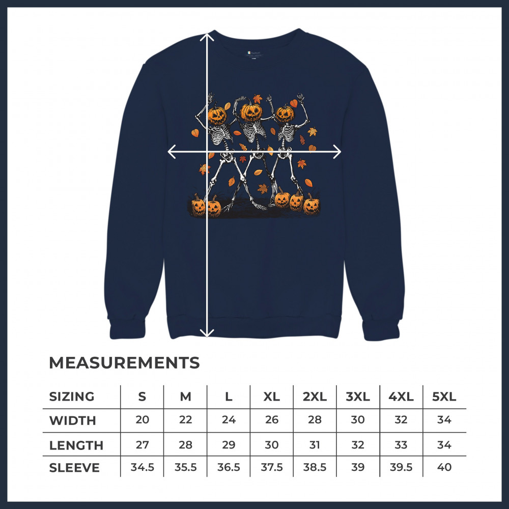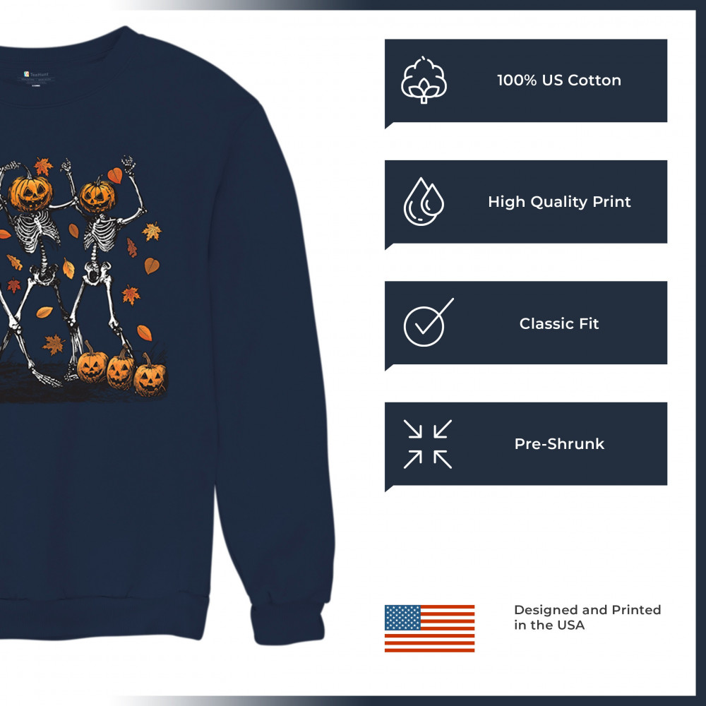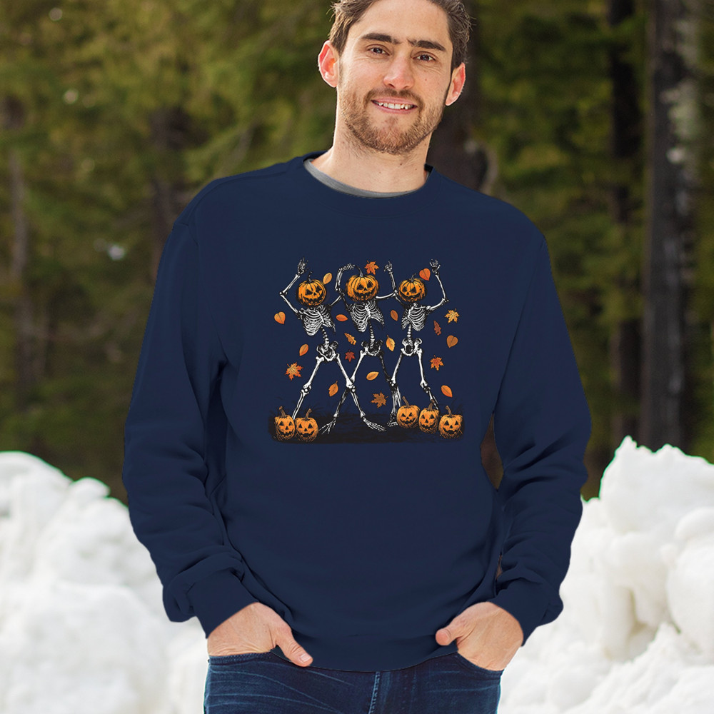 Add a touch of spooky fun to your wardrobe with this lively design featuring pumpkin-headed skeletons dancing through a swirl of autumn leaves. Perfect for Halloween parties, trick-or-treating, and fall festivals, this design is a must-have for anyone who enjoys the whimsical side of the spooky season. Made with comfort and quality in mind, this is the perfect apparel for all your October gatherings and events. Wear it to show off your Halloween spirit!