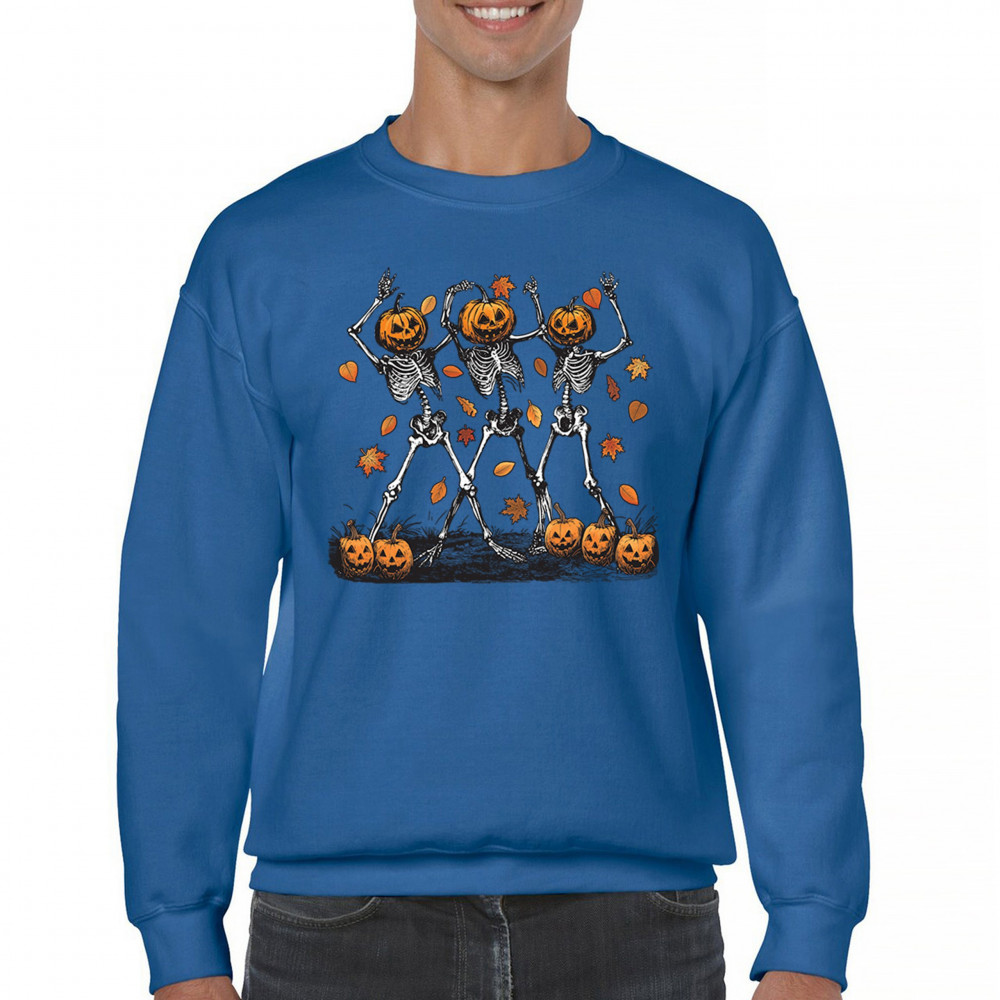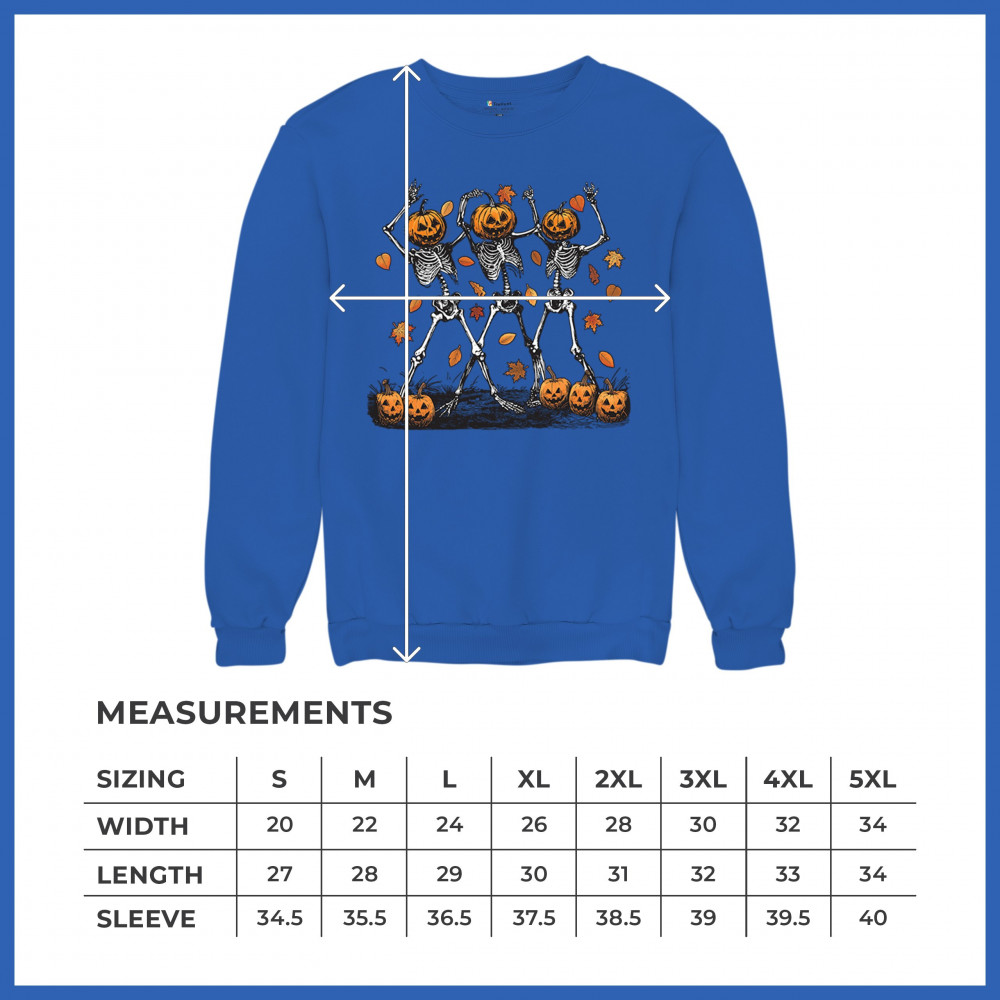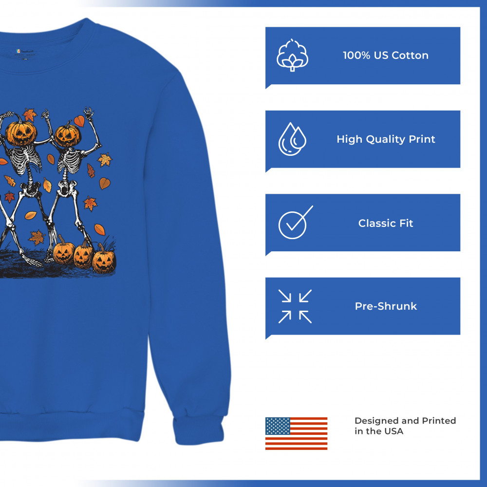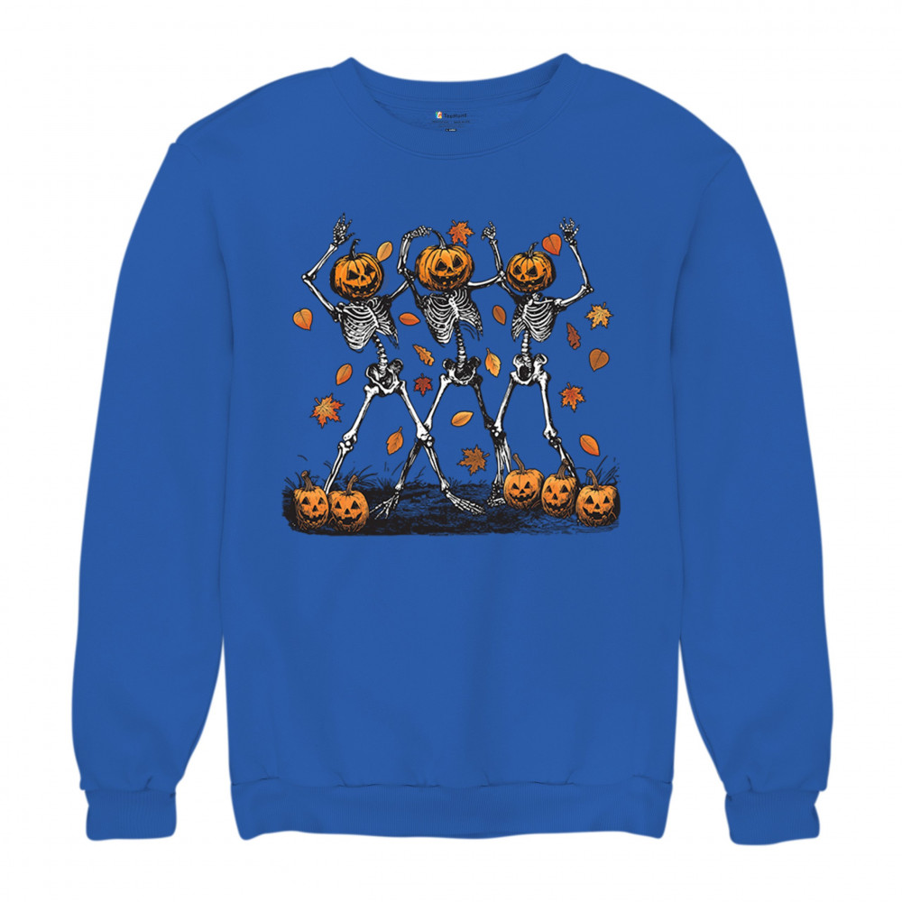 Add a touch of spooky fun to your wardrobe with this lively design featuring pumpkin-headed skeletons dancing through a swirl of autumn leaves. Perfect for Halloween parties, trick-or-treating, and fall festivals, this design is a must-have for anyone who enjoys the whimsical side of the spooky season. Made with comfort and quality in mind, this is the perfect apparel for all your October gatherings and events. Wear it to show off your Halloween spirit!
