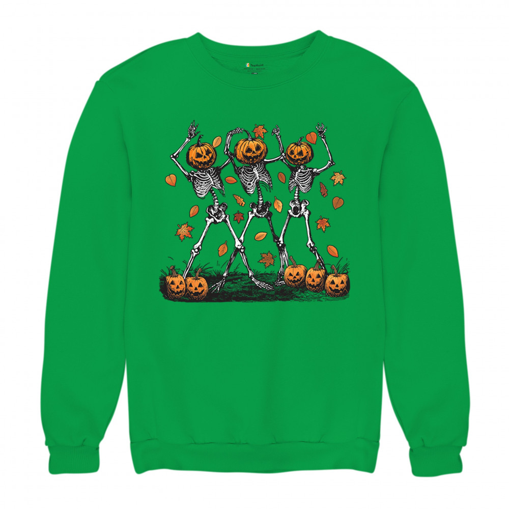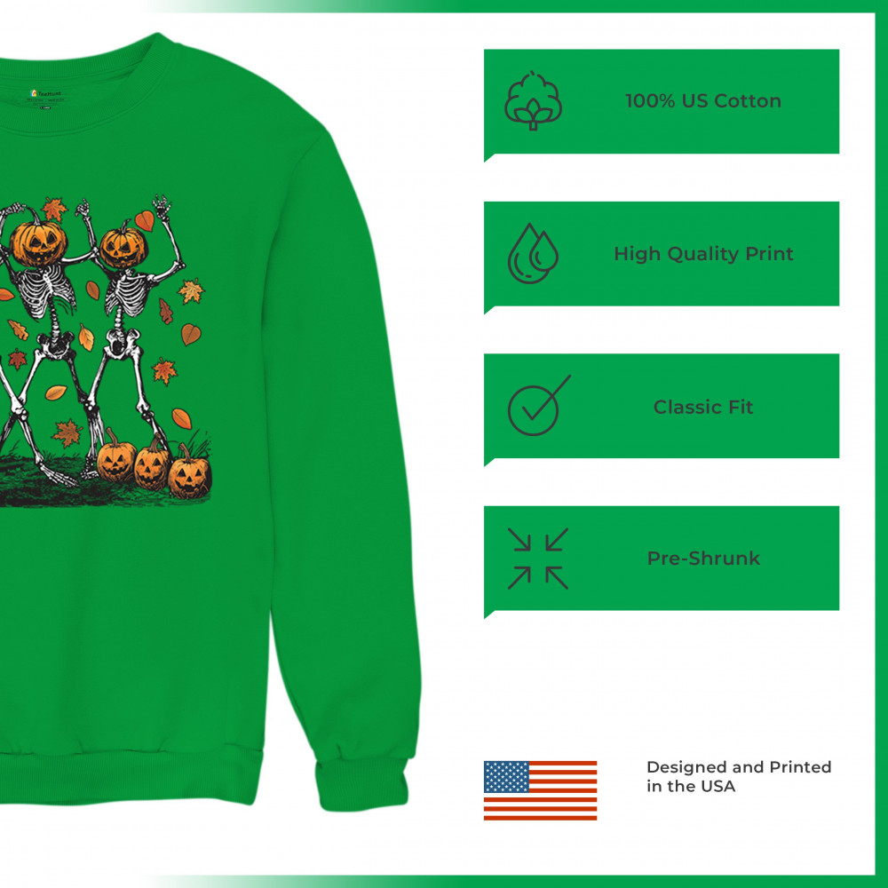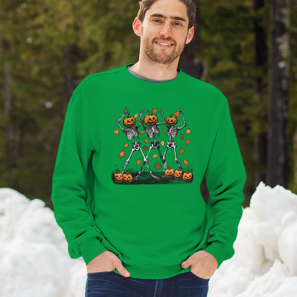 Add a touch of spooky fun to your wardrobe with this lively design featuring pumpkin-headed skeletons dancing through a swirl of autumn leaves. Perfect for Halloween parties, trick-or-treating, and fall festivals, this design is a must-have for anyone who enjoys the whimsical side of the spooky season. Made with comfort and quality in mind, this is the perfect apparel for all your October gatherings and events. Wear it to show off your Halloween spirit!