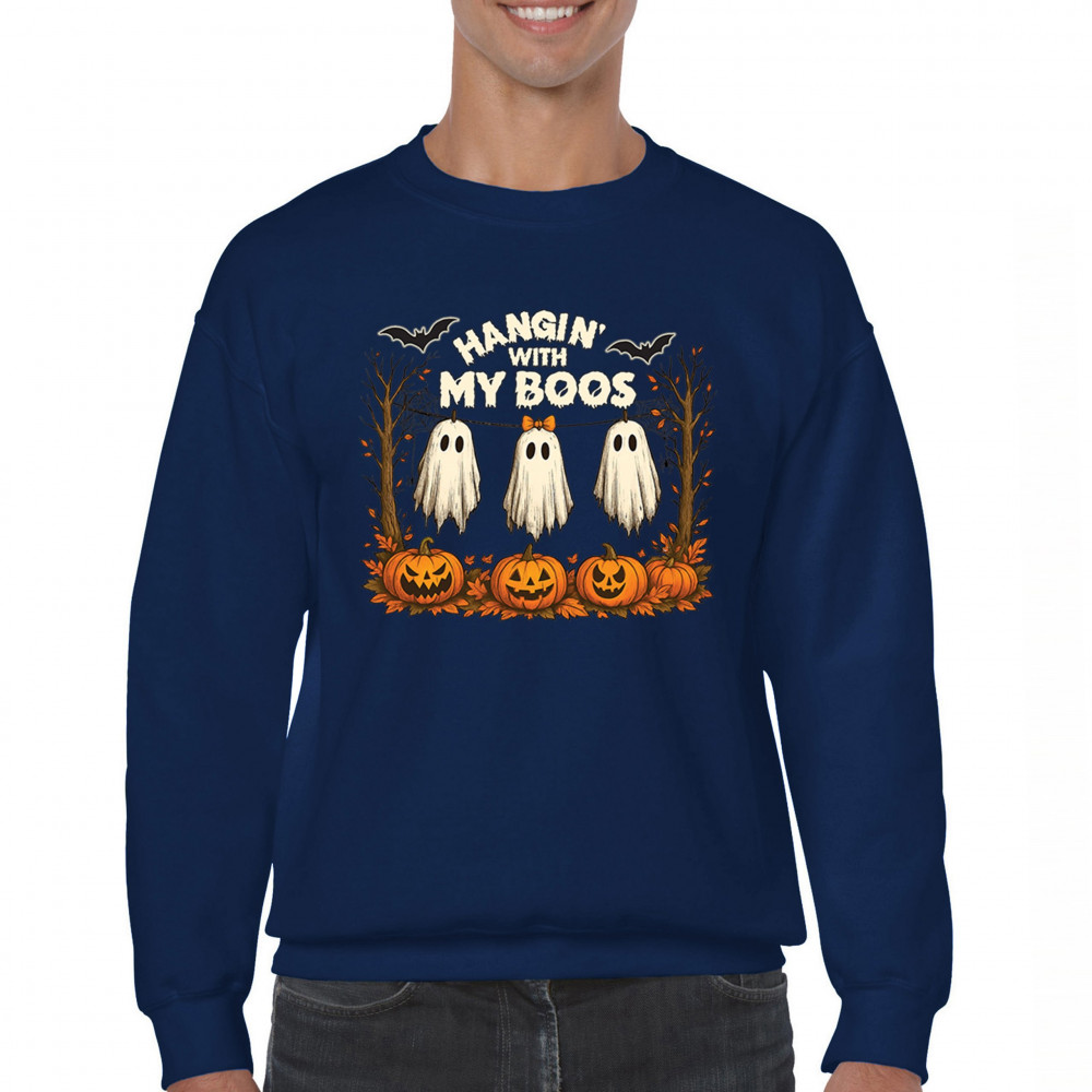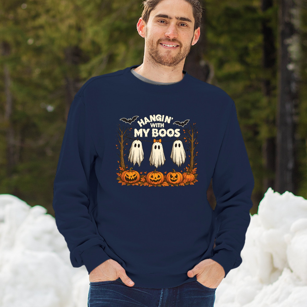 Hangin With My Boos design featuring spooky ghosts, jack o lanterns, and haunted house humor. Perfect for Halloween night, October 31, and parties.