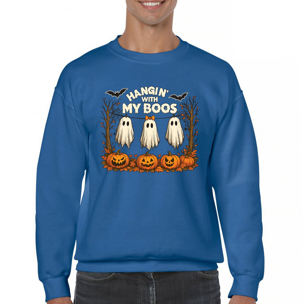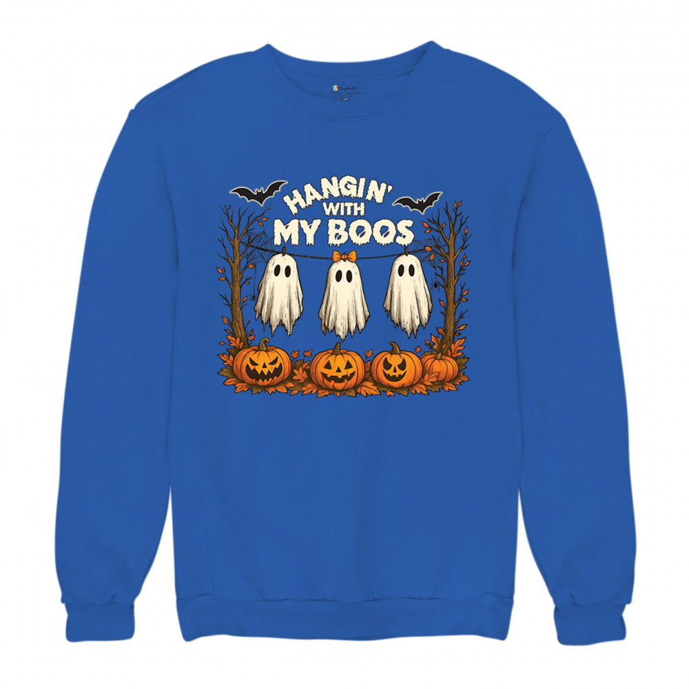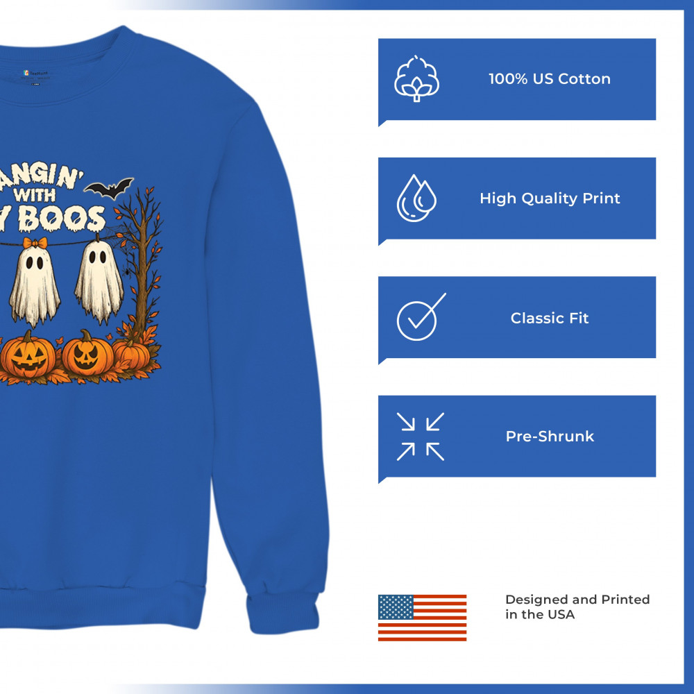 Hangin With My Boos design featuring spooky ghosts, jack o lanterns, and haunted house humor. Perfect for Halloween night, October 31, and parties.