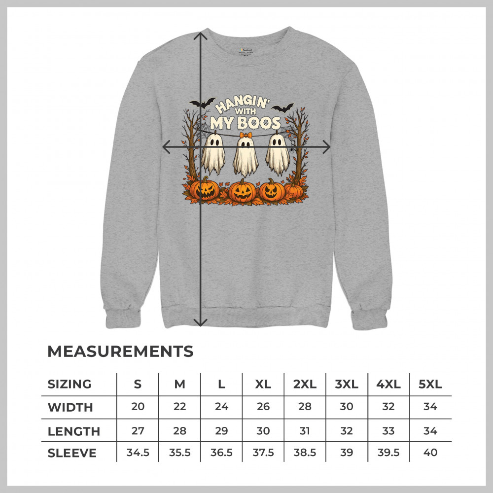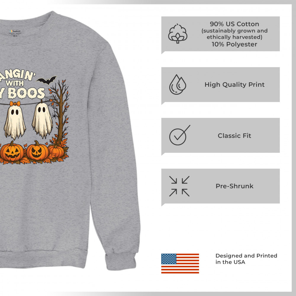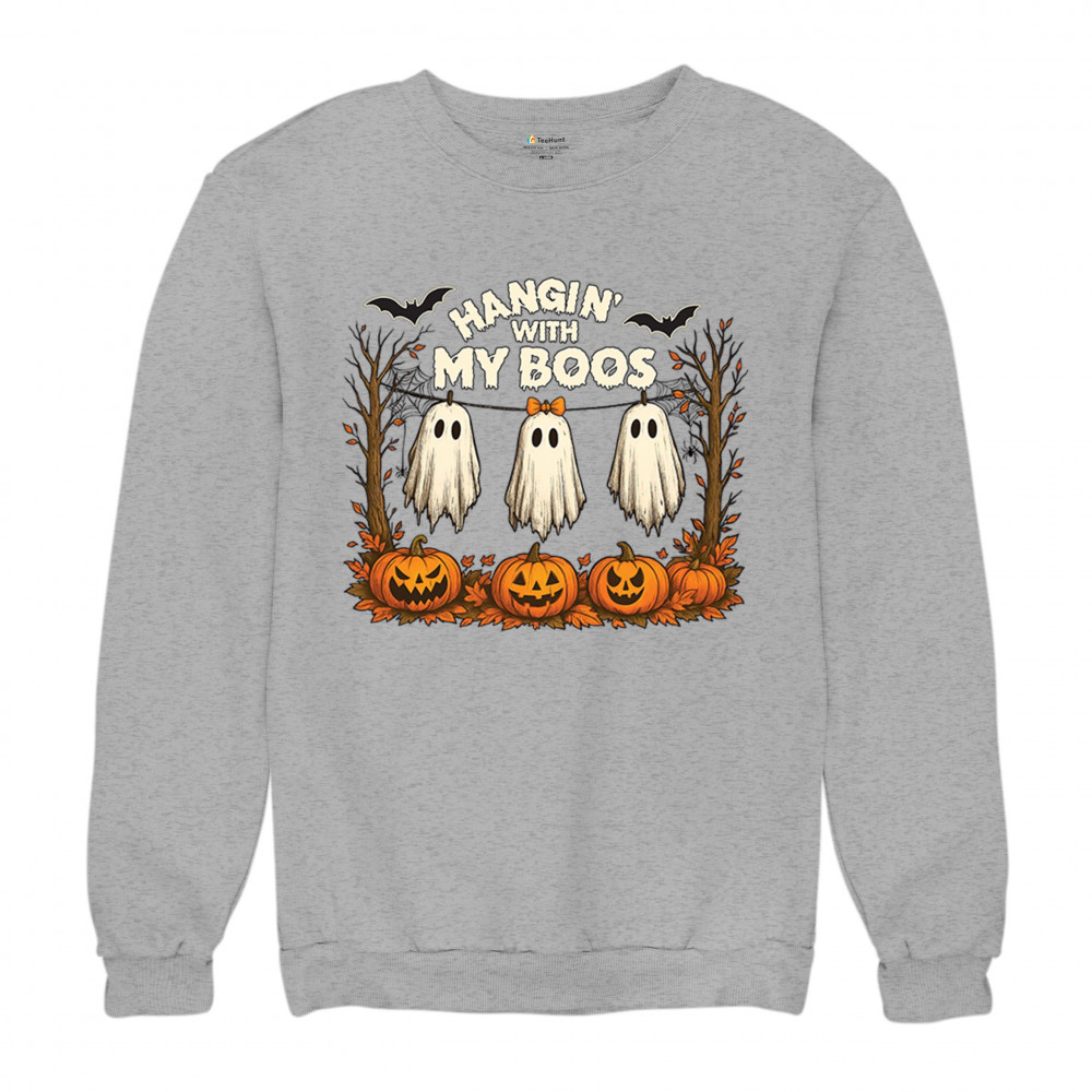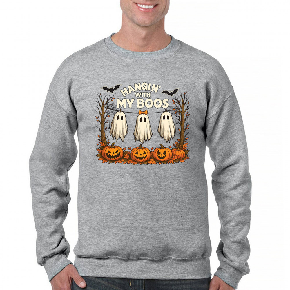 Hangin With My Boos design featuring spooky ghosts, jack o lanterns, and haunted house humor. Perfect for Halloween night, October 31, and parties.
