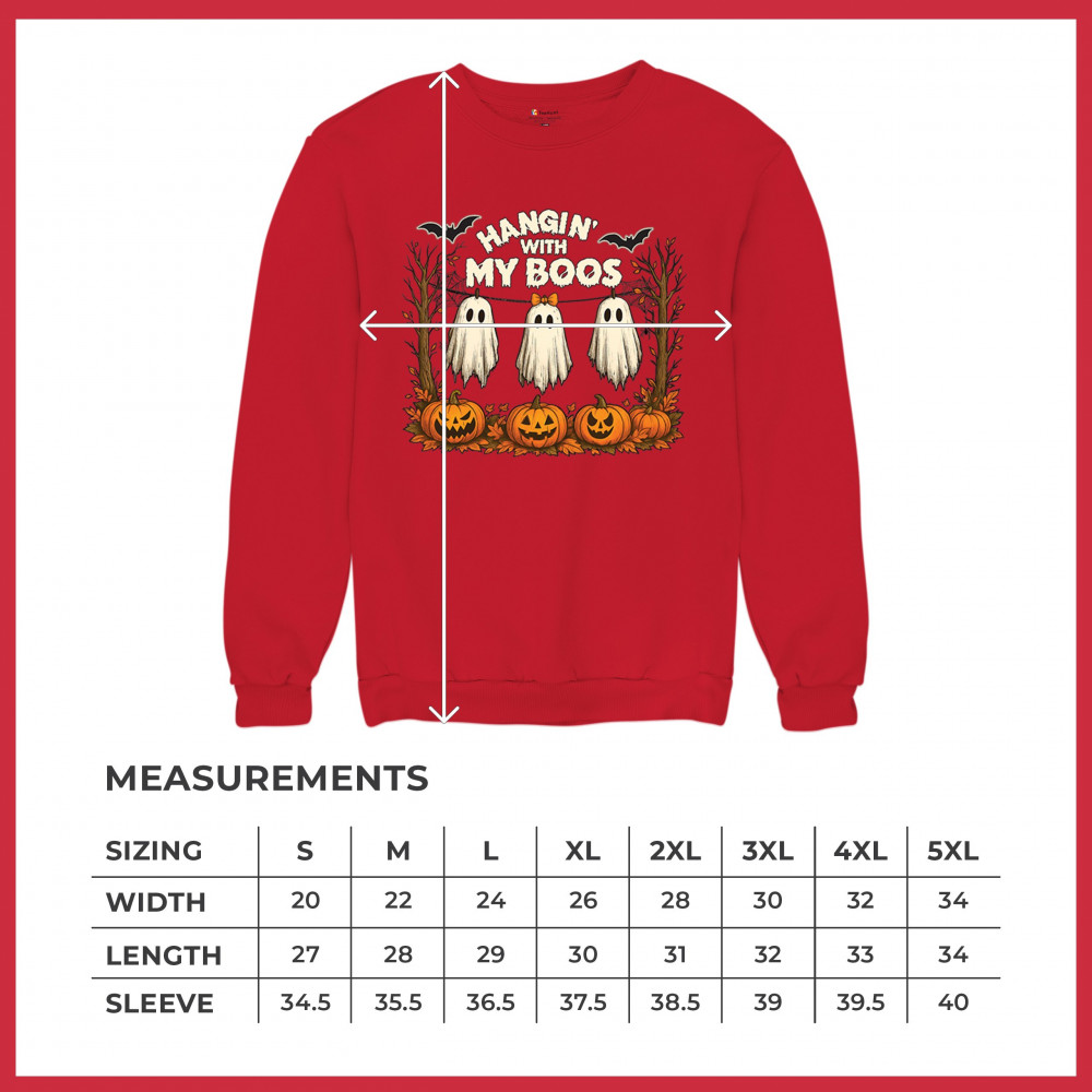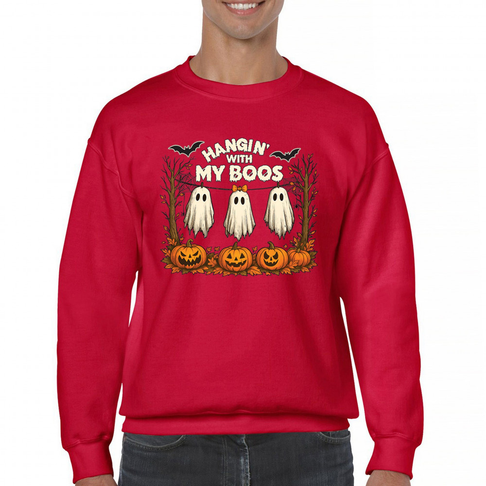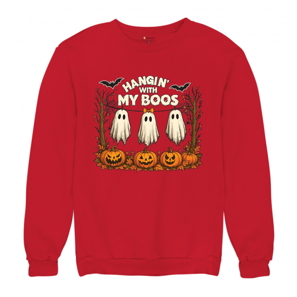 Hangin With My Boos design featuring spooky ghosts, jack o lanterns, and haunted house humor. Perfect for Halloween night, October 31, and parties.