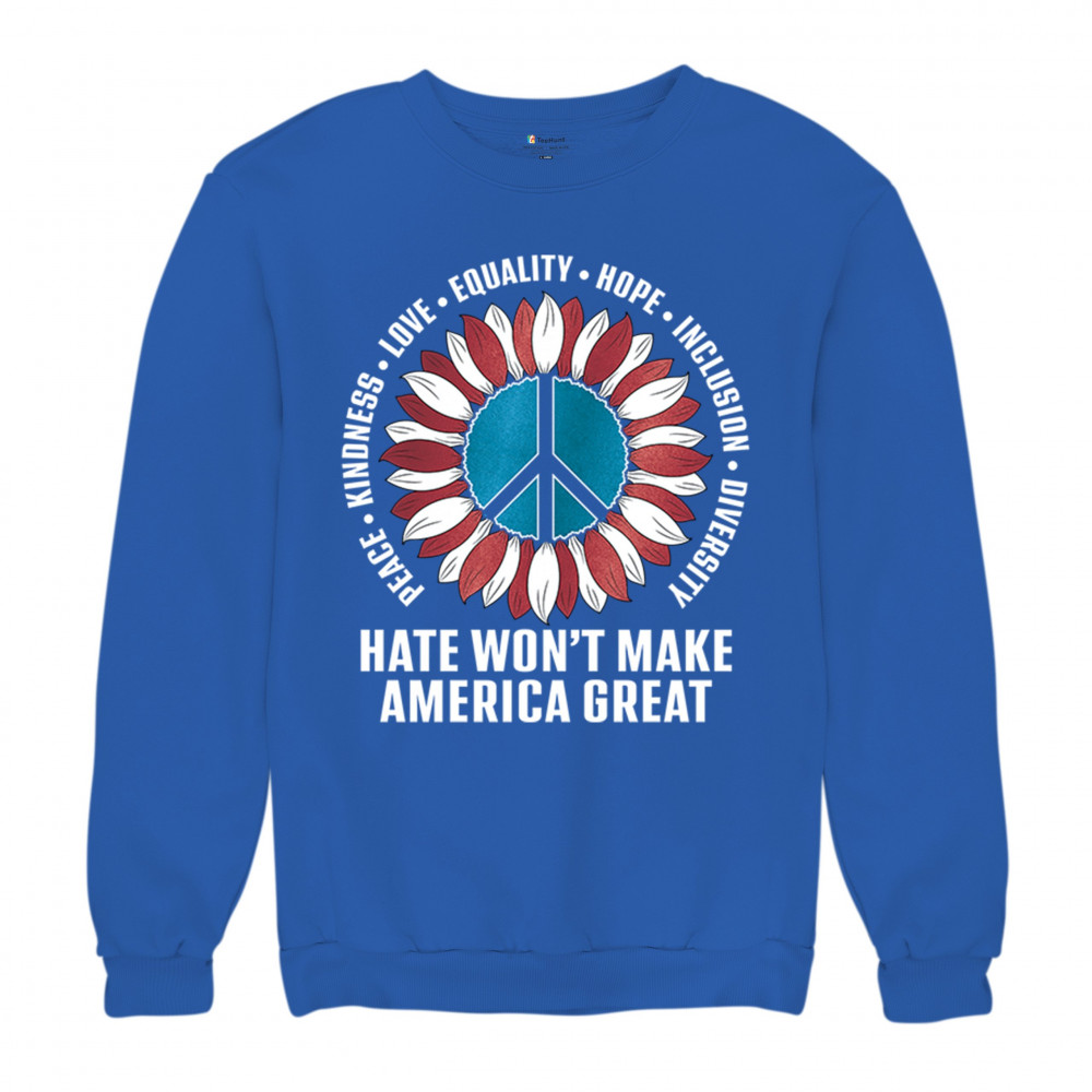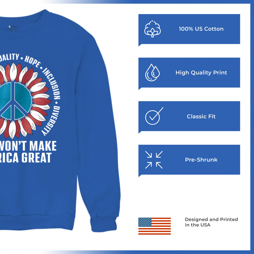Embrace the message of love, equality, and unity with this eye-catching design. The sunflower and peace symbol represent a commitment to kindness and inclusion, rejecting hate and division. Perfect for those who support liberal values, this design is a bold statement against negativity and for a brighter future. Wear it proudly to show your belief in a diverse, united America. Let this design be a symbol of hope and progress for all.