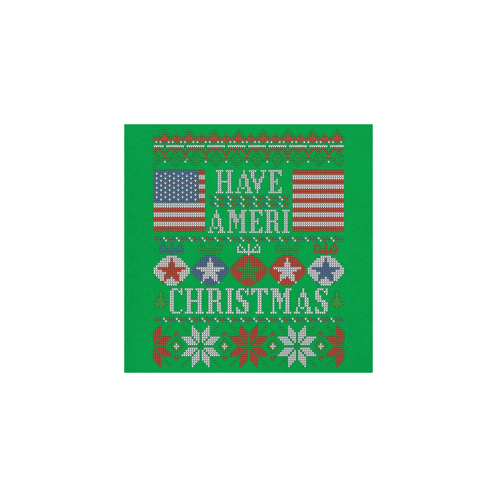 A print saying: "Have Ameri Christmas" and featuring an American flag and five Christmas bulbs. The print is designed as an ugly sweater. Amazing choice to express your patriotism while celebrating Christmas.