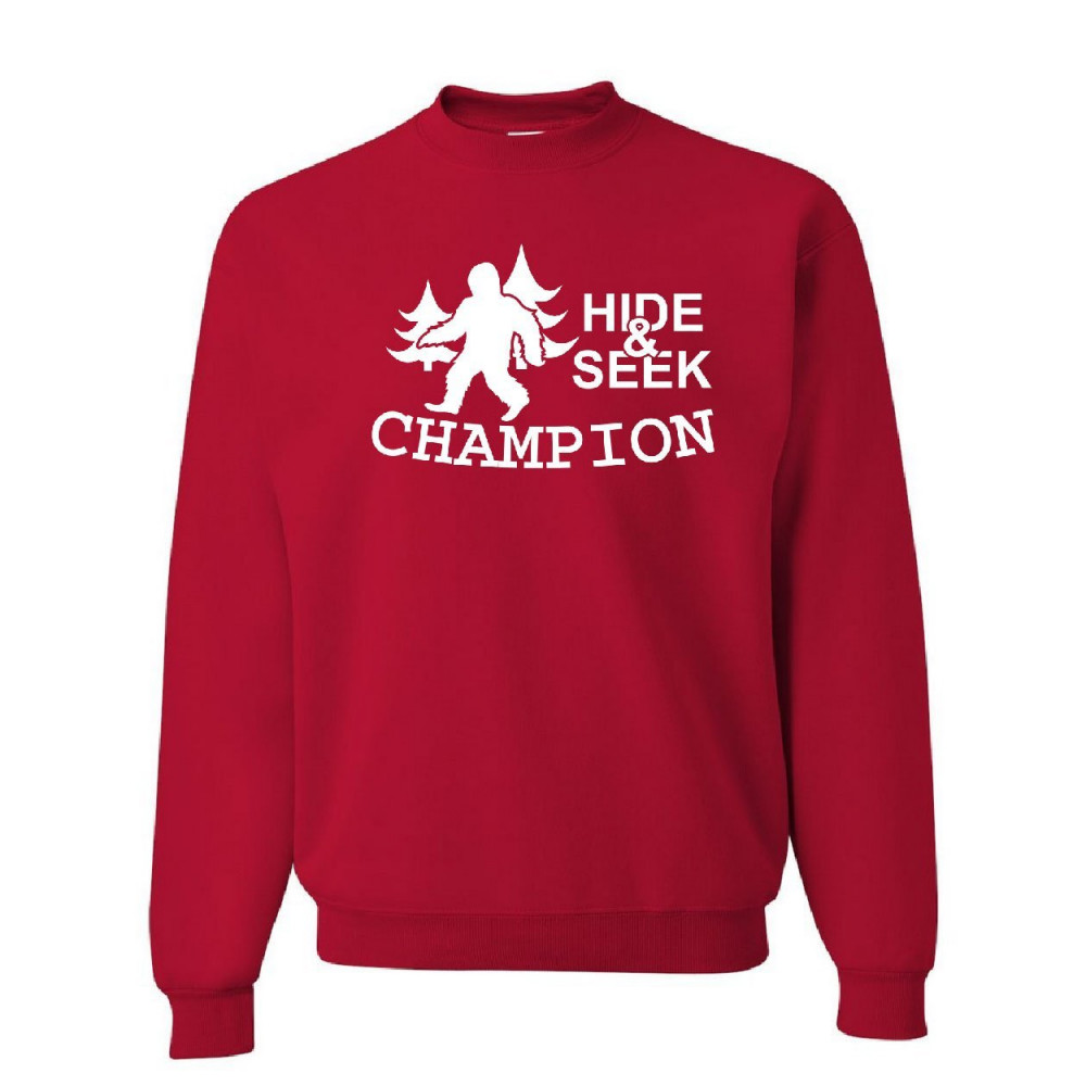 HIDE AND SEEK CHAMPION sweatshirt bigfoot yeti funny humor sweater red