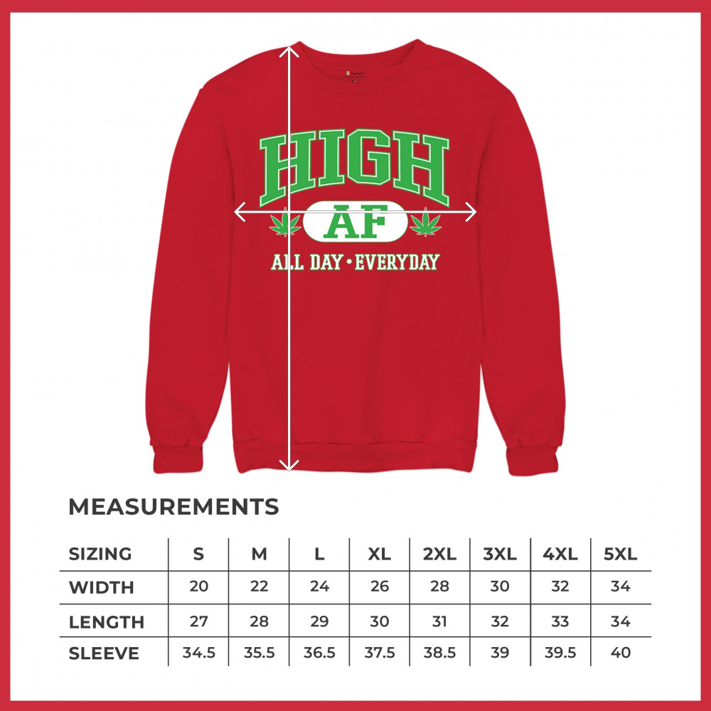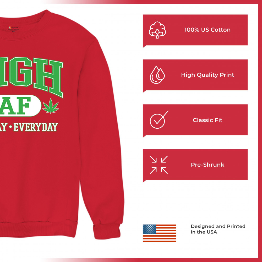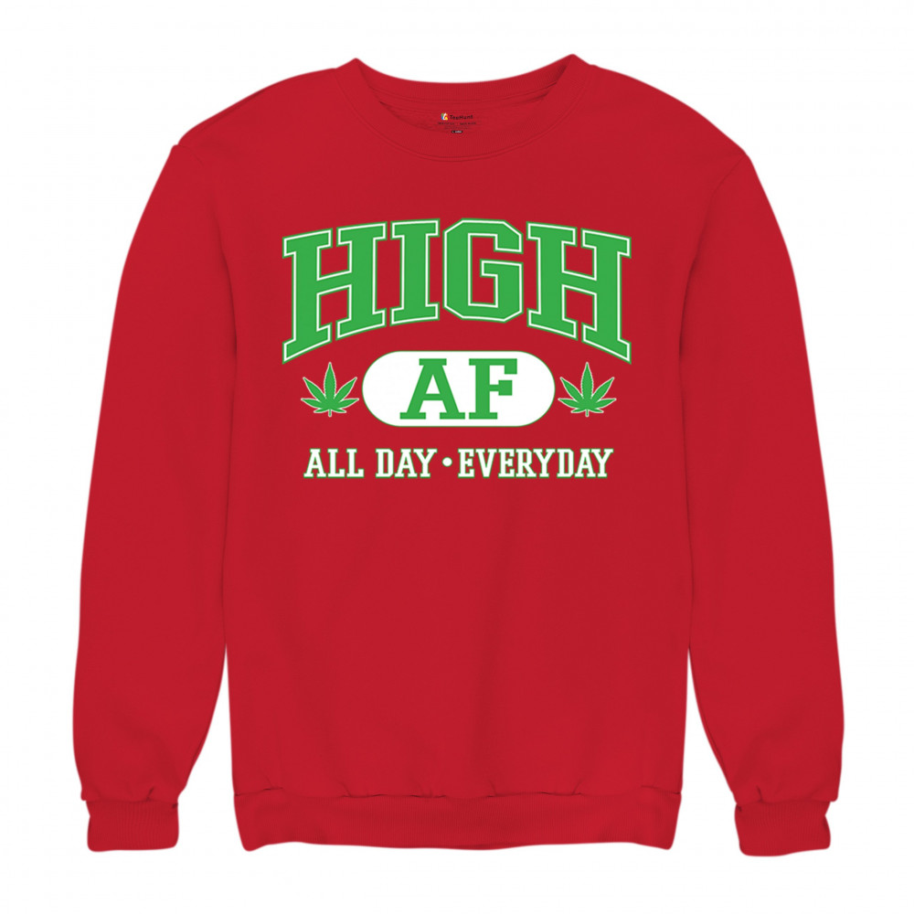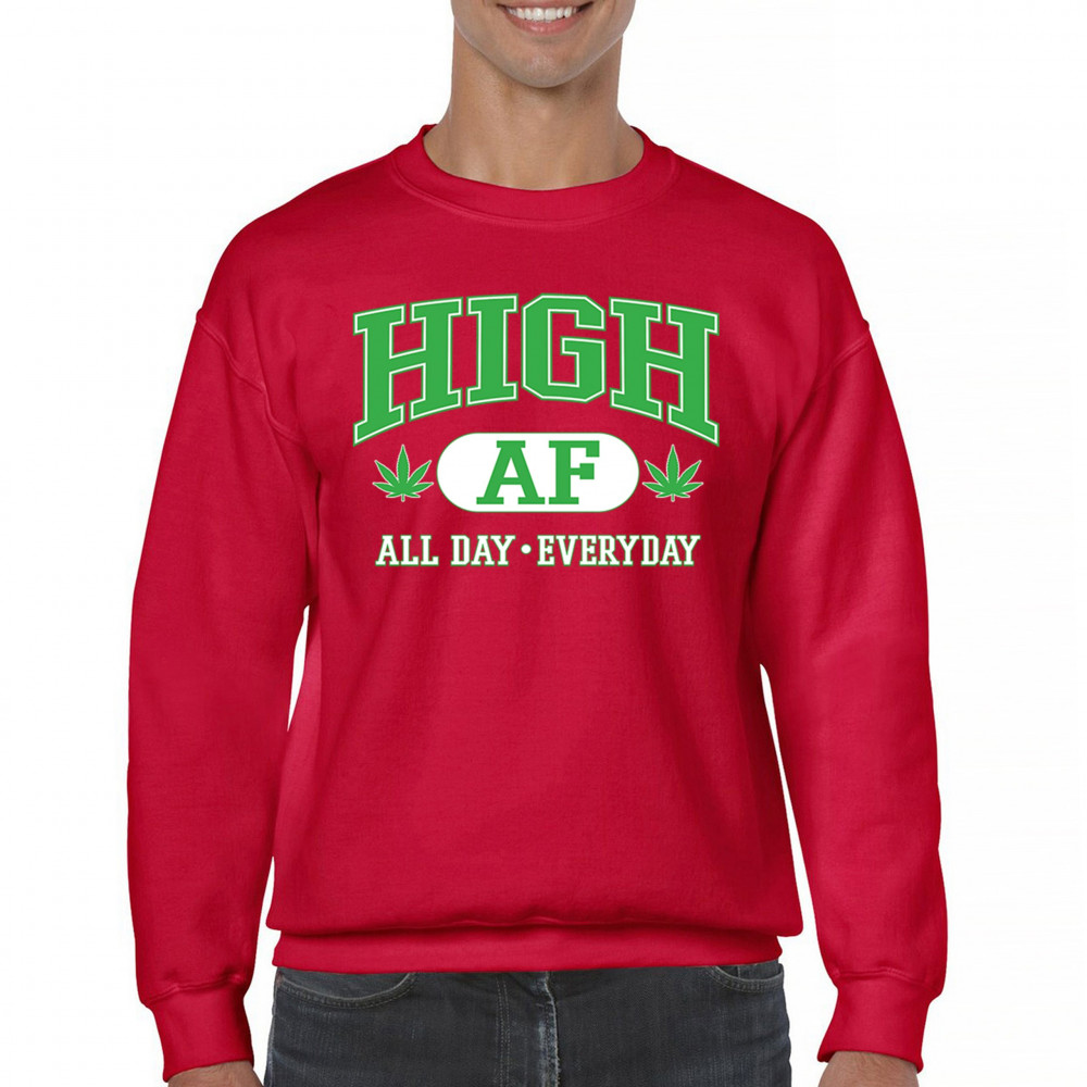 HIGH AF ALL DAY EVERYDAY sweatshirt cannabis leaf stoner 420 thc kush crewneck red
