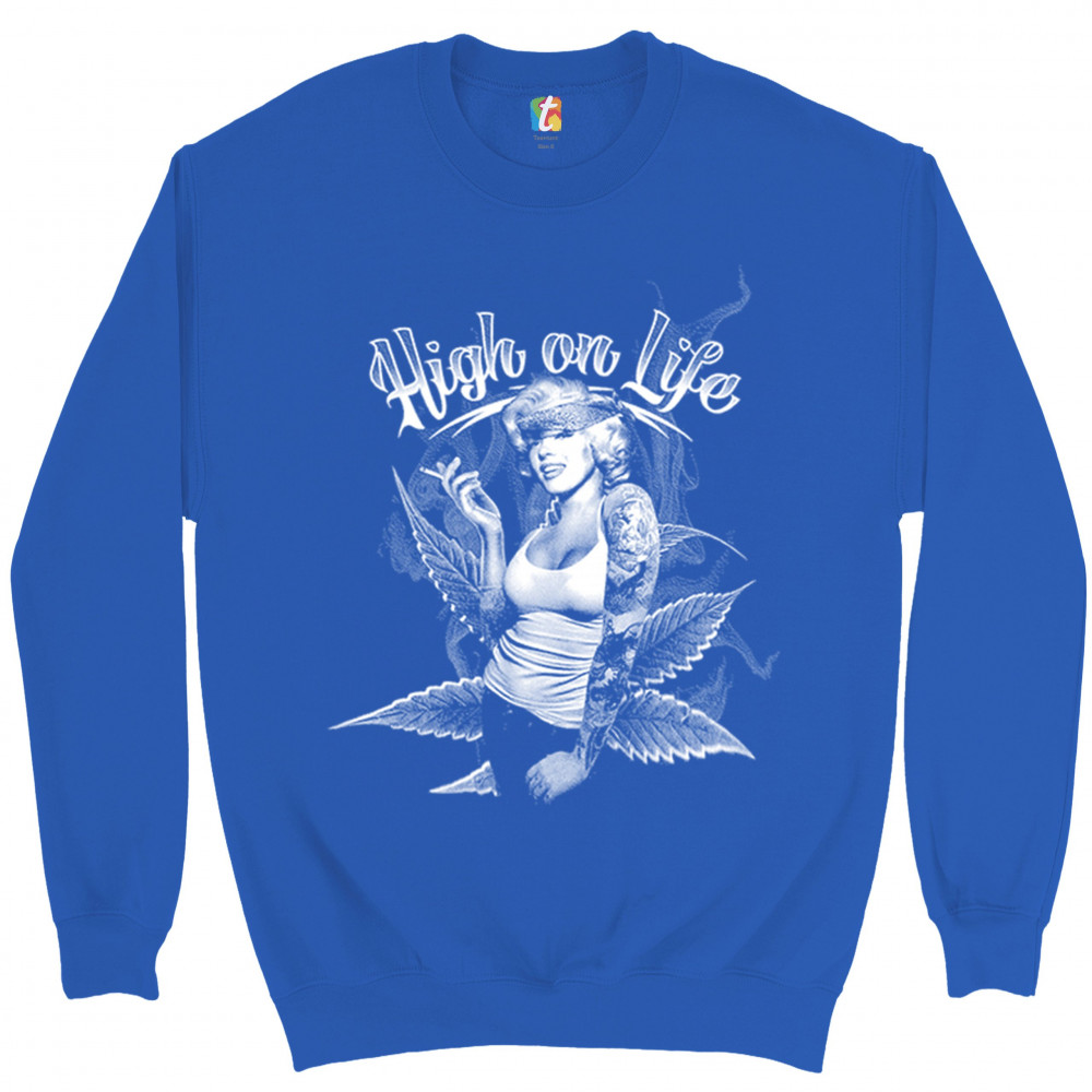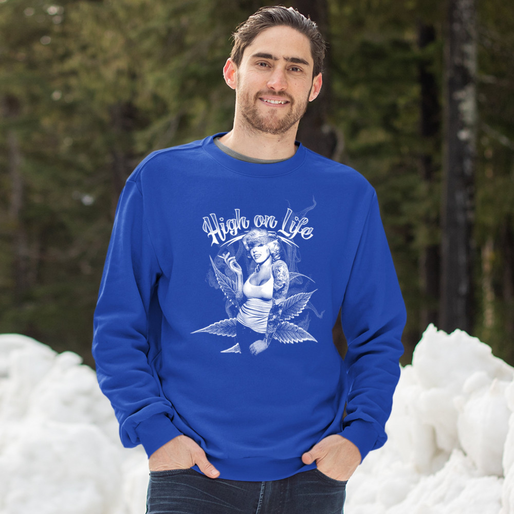 HIGH ON LIFE sweatshirt marilyn monroe holding a joint 420 pop culture crewneck royal blue