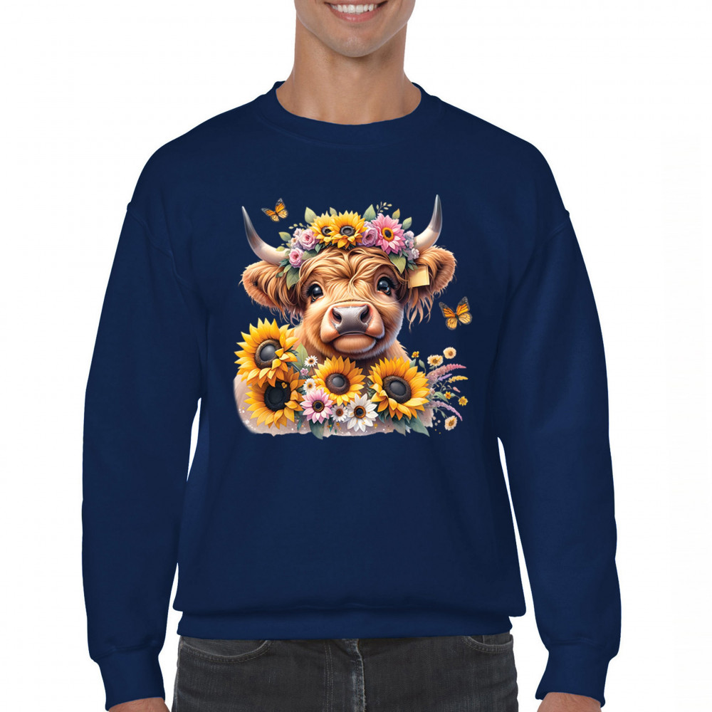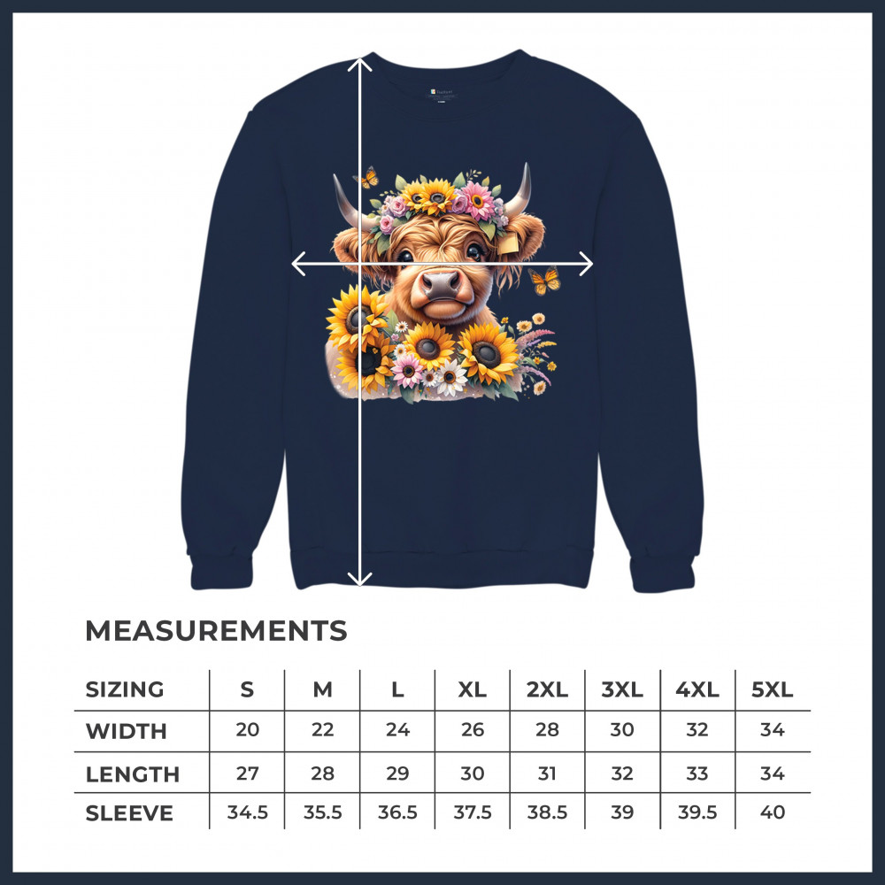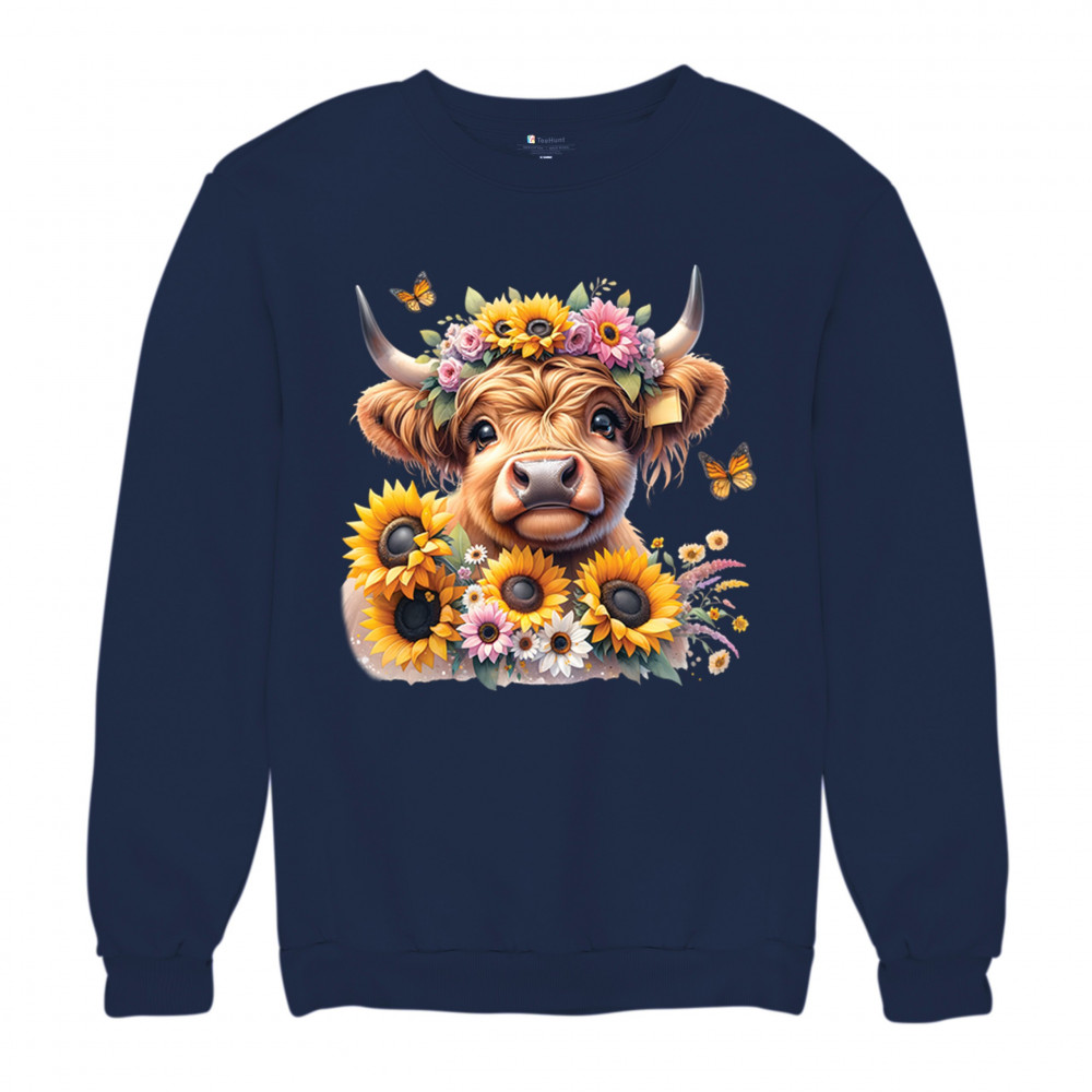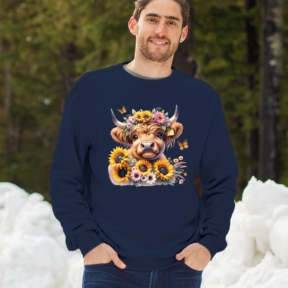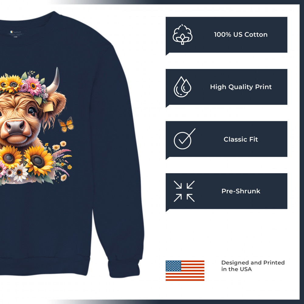 Highland Cow floral design with sunflowers and daisies, rustic farmhouse cow style, western ranch boho charm, and cozy country farmhouse shirt vibes.