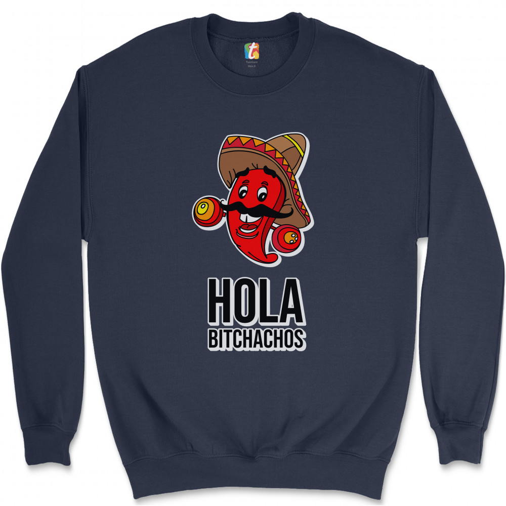 HOLA BITCHACHOS sweatshirt funny mexican chili pepper cinco de mayo crewneck navy blue