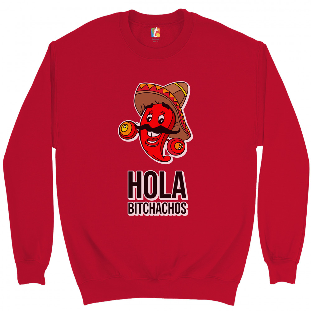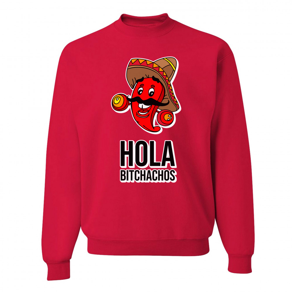 A funny print featuring a smiling red chili pepper with mustaches, wearing a sombrero and holding maracas. Underneath it says: "hola bitchachos". A great choice to give as a gift to your latino friends or family members to celebrate Cinco de Mayo.
