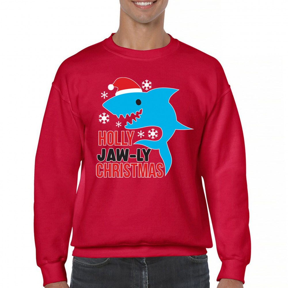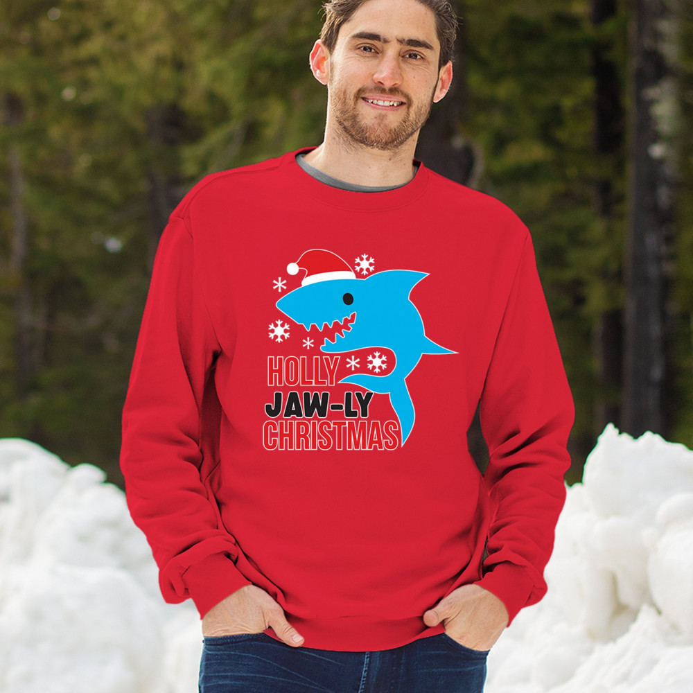 Funny Holly Jaw-ly Christmas shark pun design with Santa hat and snowflakes. Perfect for ocean lovers, festive parties, and cheerful holiday fun.