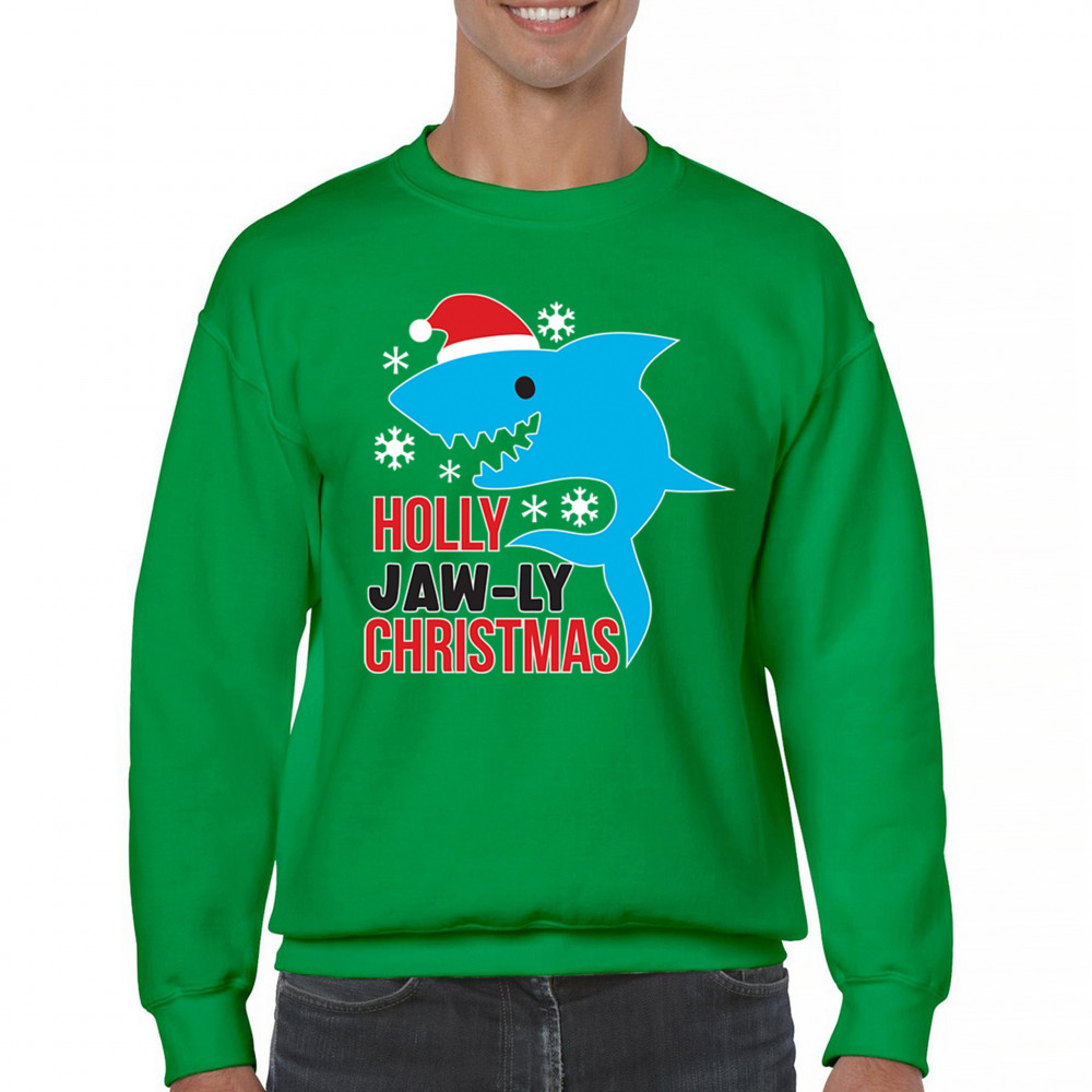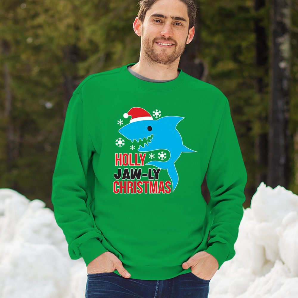 Funny Holly Jaw-ly Christmas shark pun design with Santa hat and snowflakes. Perfect for ocean lovers, festive parties, and cheerful holiday fun.