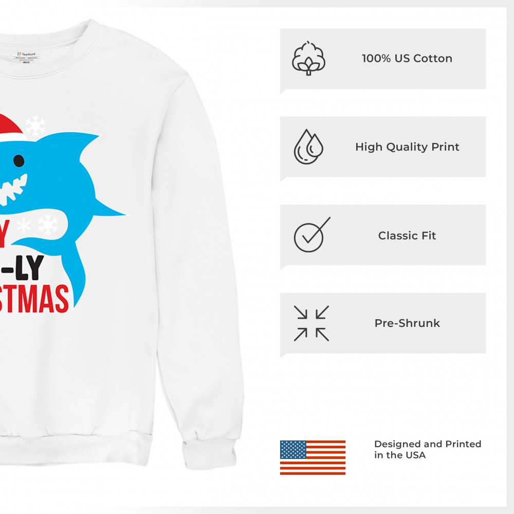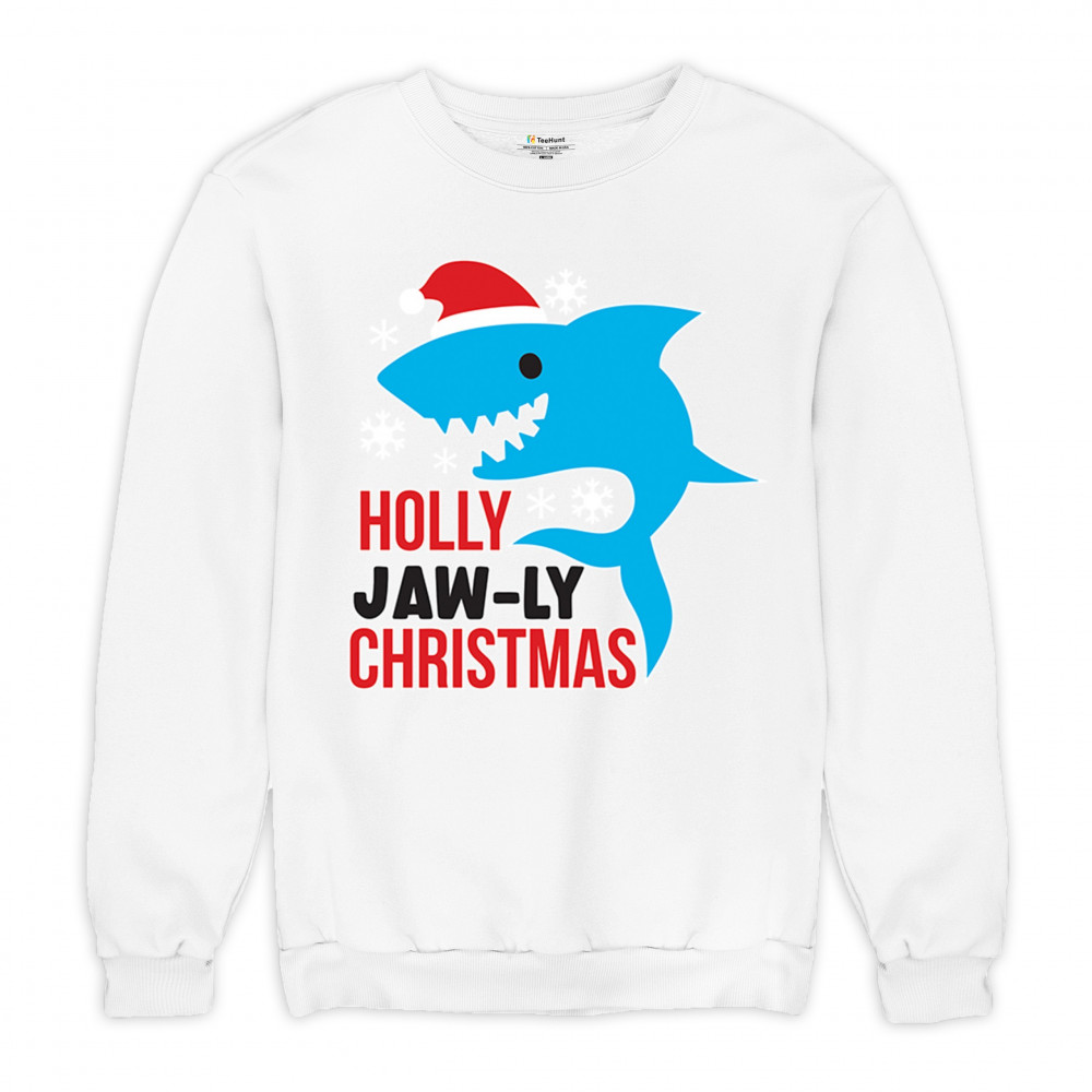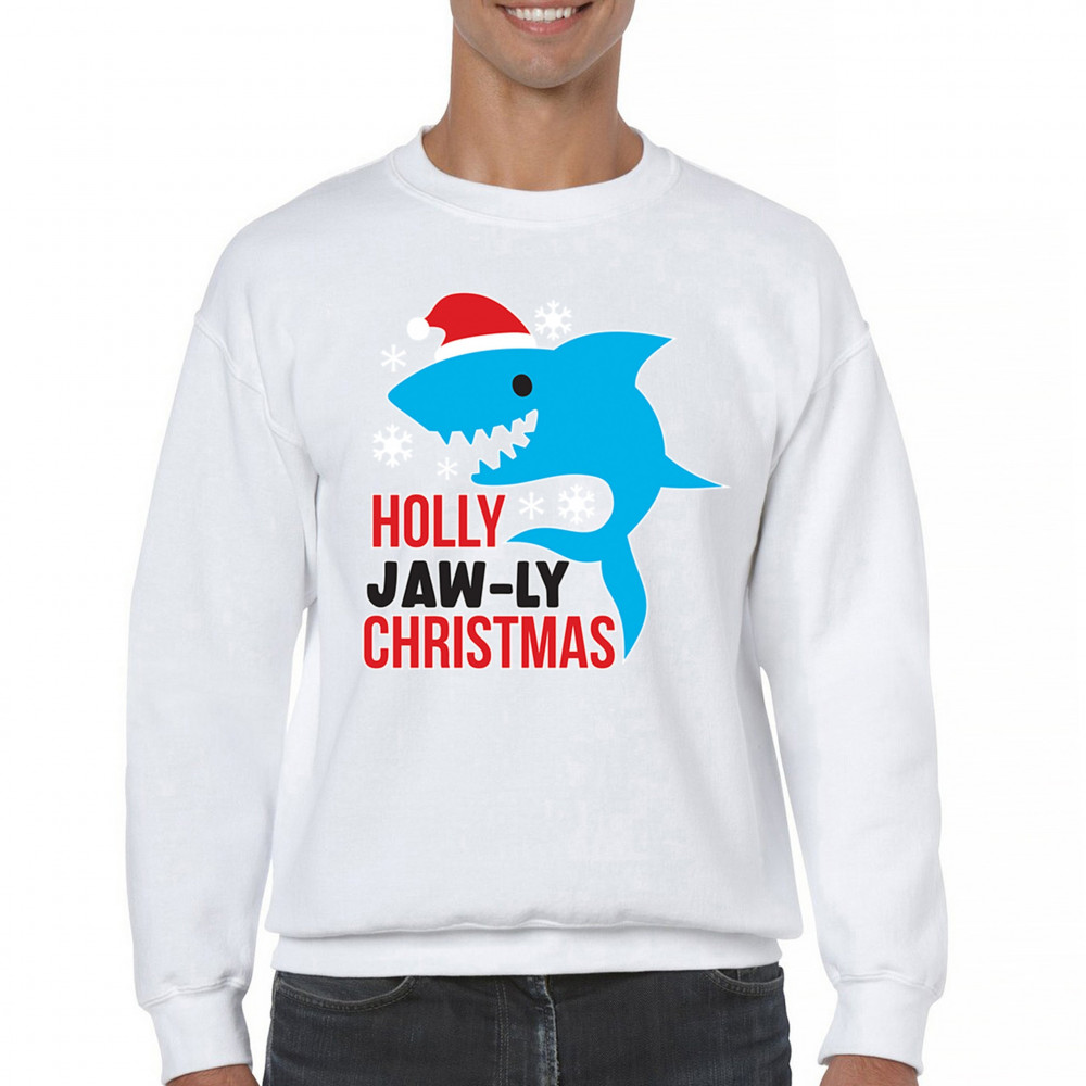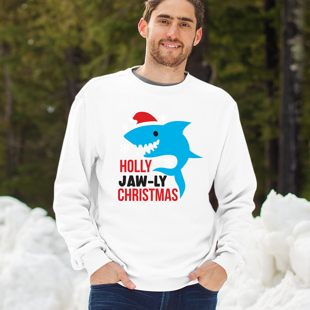 Funny Holly Jaw-ly Christmas shark pun design with Santa hat and snowflakes. Perfect for ocean lovers, festive parties, and cheerful holiday fun.