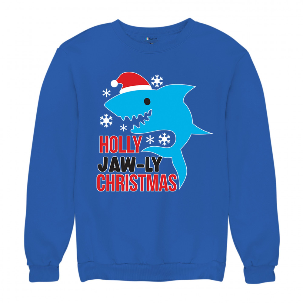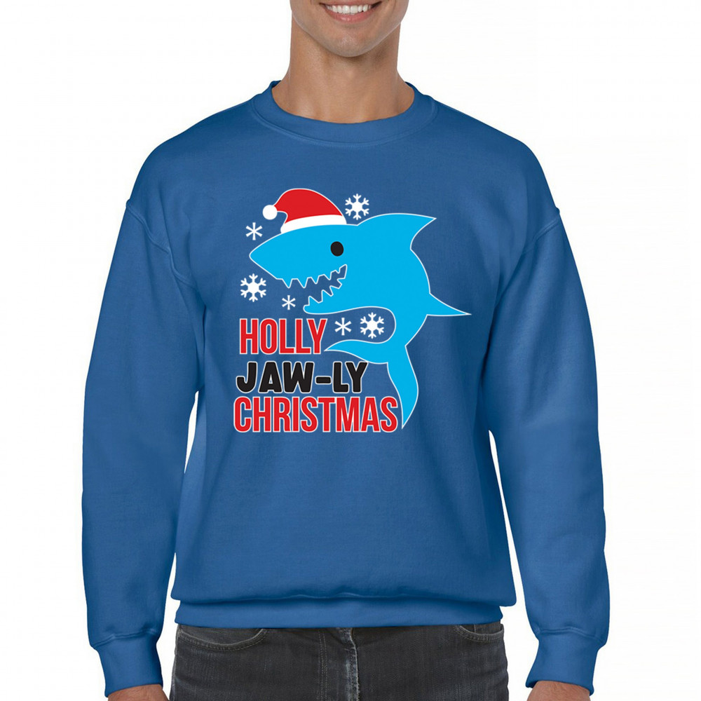 Funny Holly Jaw-ly Christmas shark pun design with Santa hat and snowflakes. Perfect for ocean lovers, festive parties, and cheerful holiday fun.