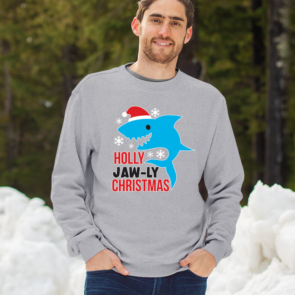 Funny Holly Jaw-ly Christmas shark pun design with Santa hat and snowflakes. Perfect for ocean lovers, festive parties, and cheerful holiday fun.
