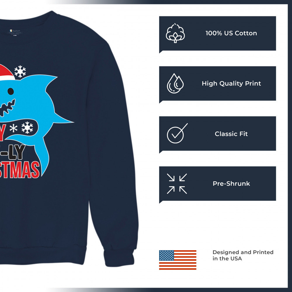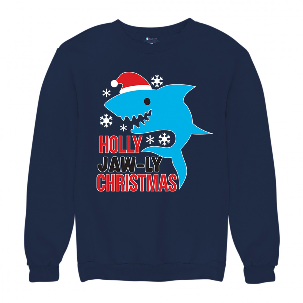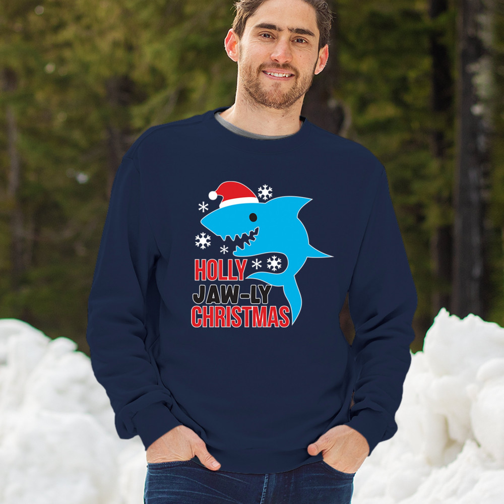 Funny Holly Jaw-ly Christmas shark pun design with Santa hat and snowflakes. Perfect for ocean lovers, festive parties, and cheerful holiday fun.