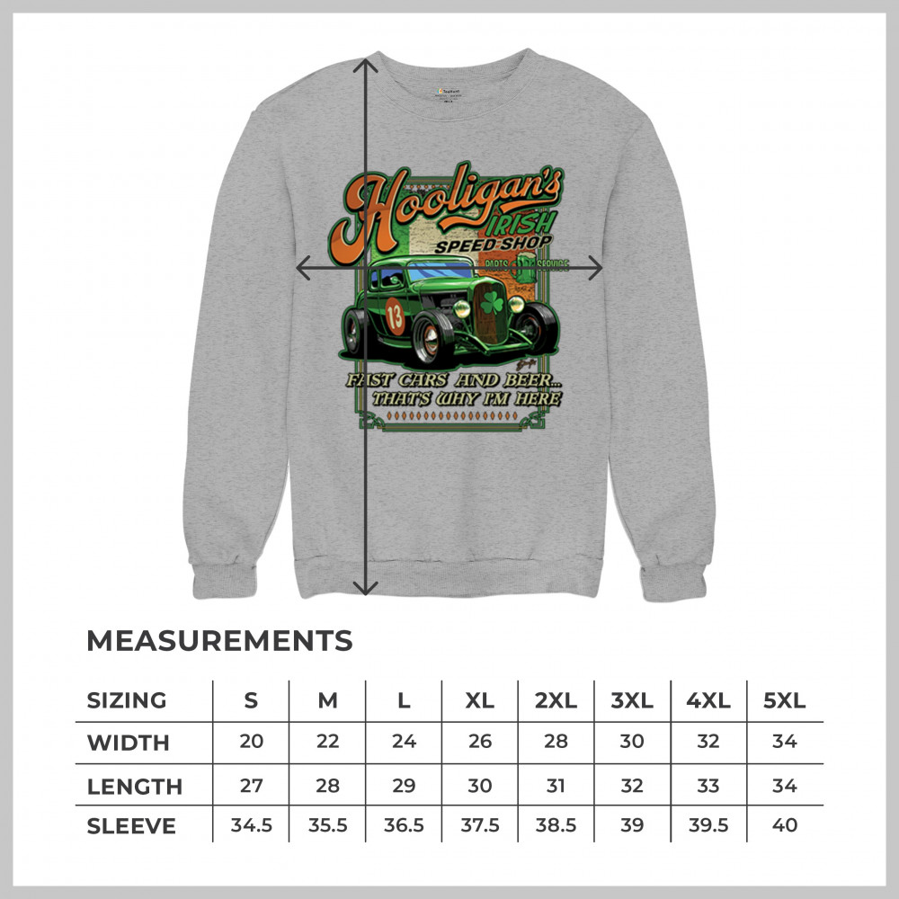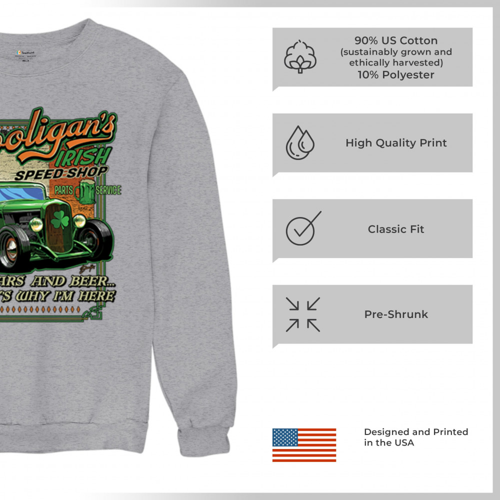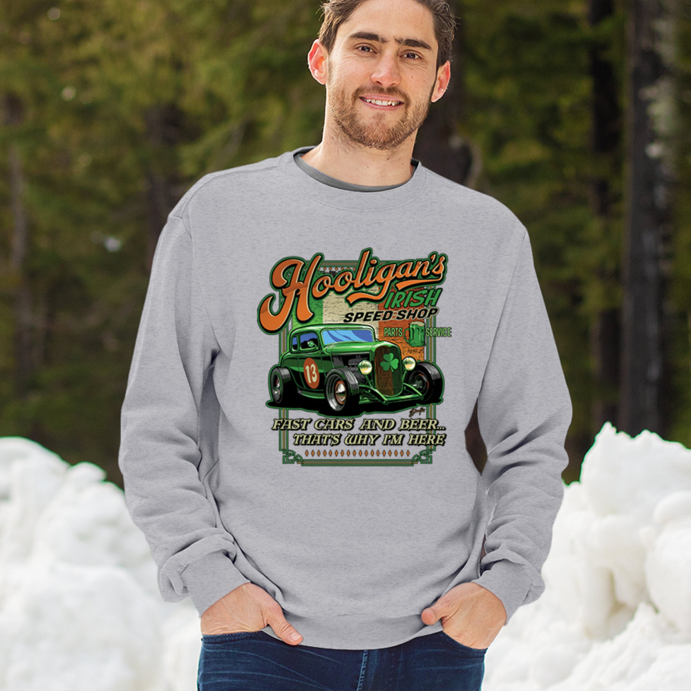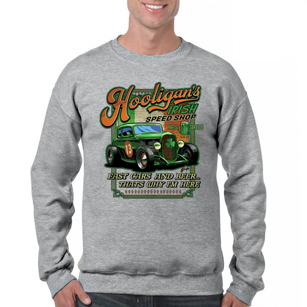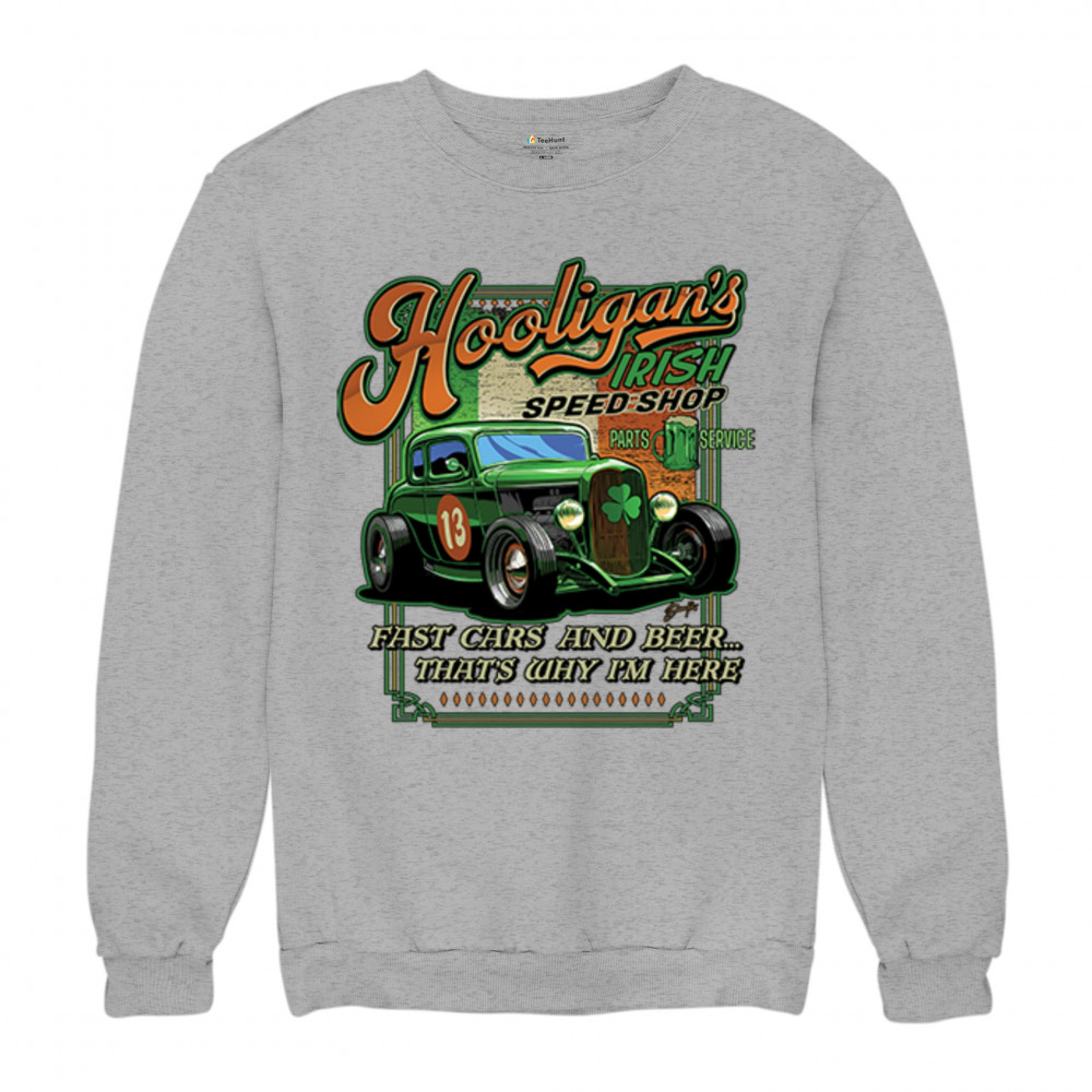 HOOLIGAN'S IRISH SPEED SHOP hooligans irish speed shop st patricks day sweatshirt hot rod shamrock crewneck gray