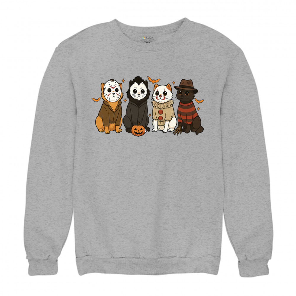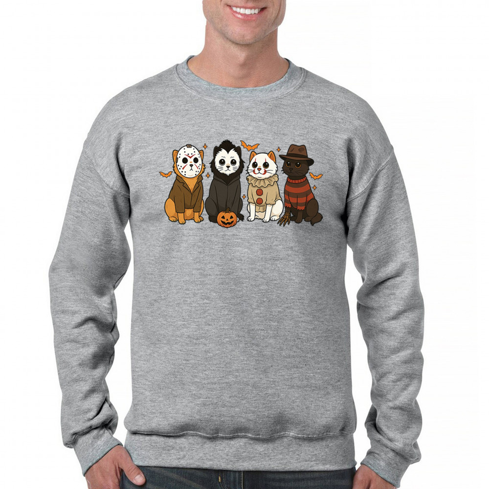 HORROR CATS crewneck sweatshirt trick or treat halloween spooky pumpkin head gray